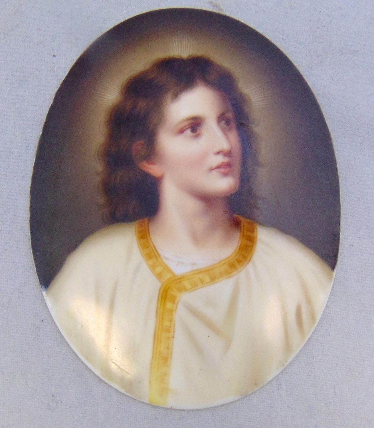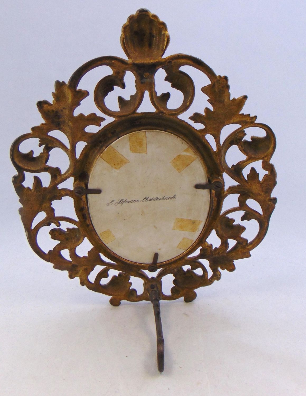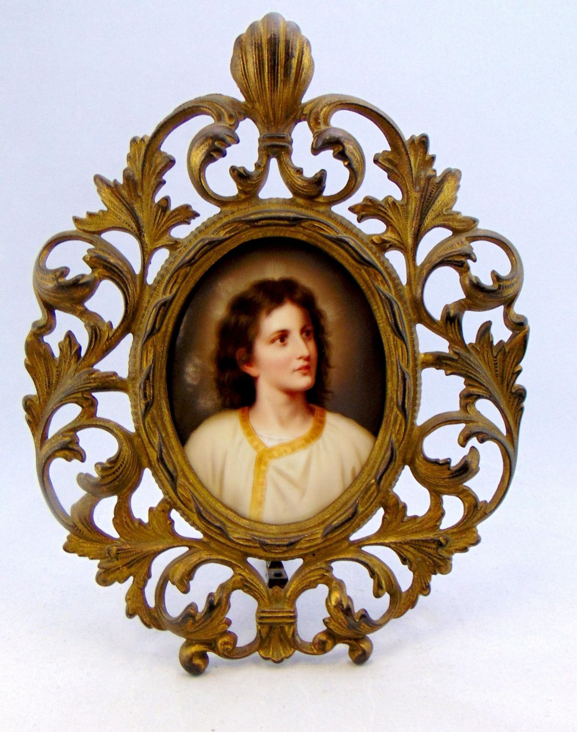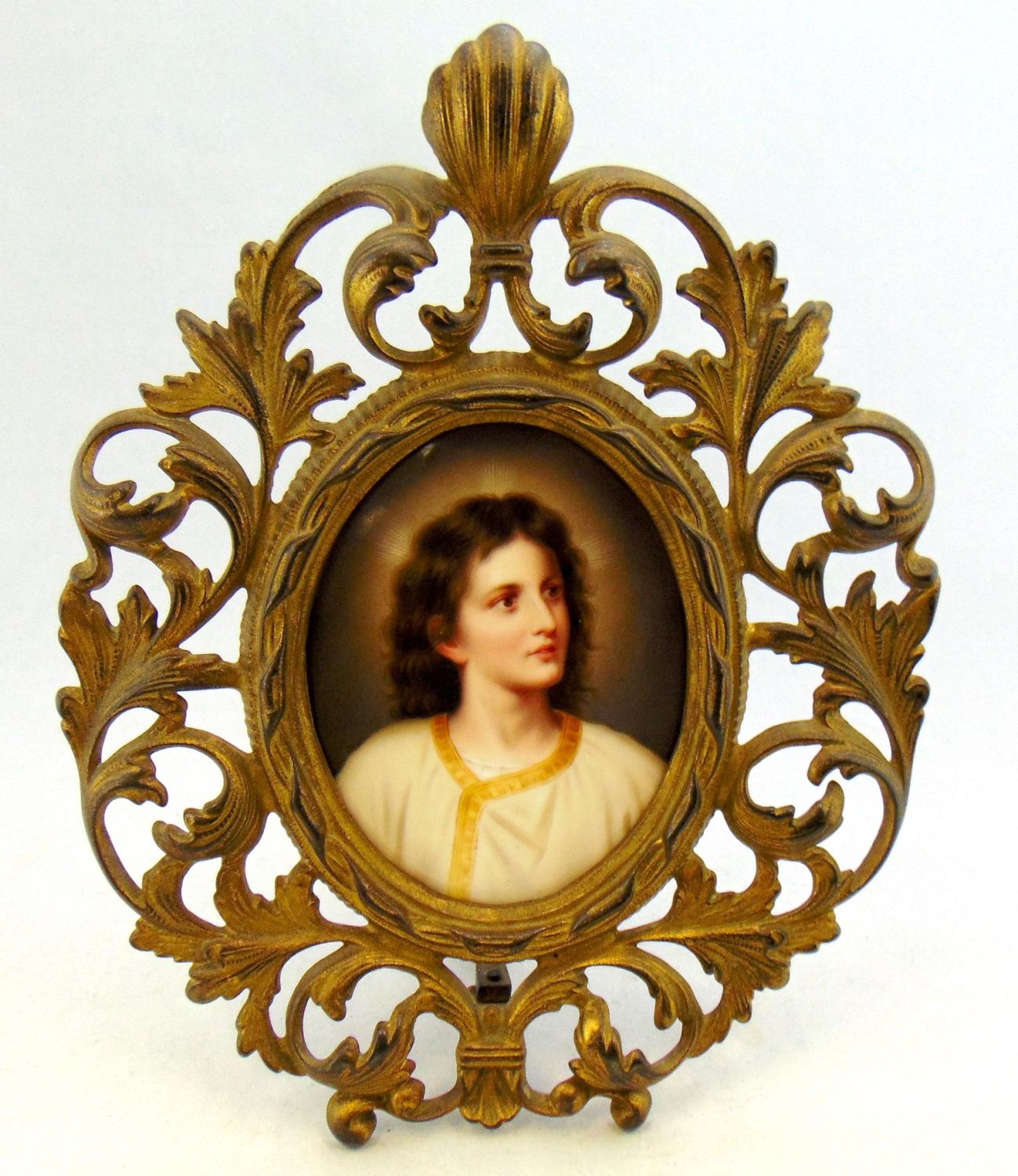 German plaque by Hoffman of a young Jesus titled "Christusknabe" or Christ boy set in a scrolling floral metal frame, plaque 5 1/4" ht. overall 11" ht. Condition: good with no defects found.