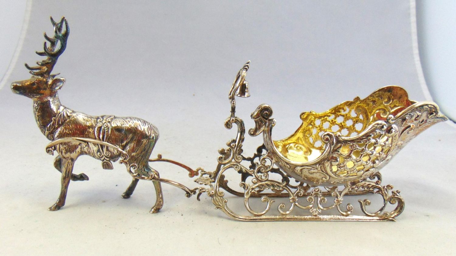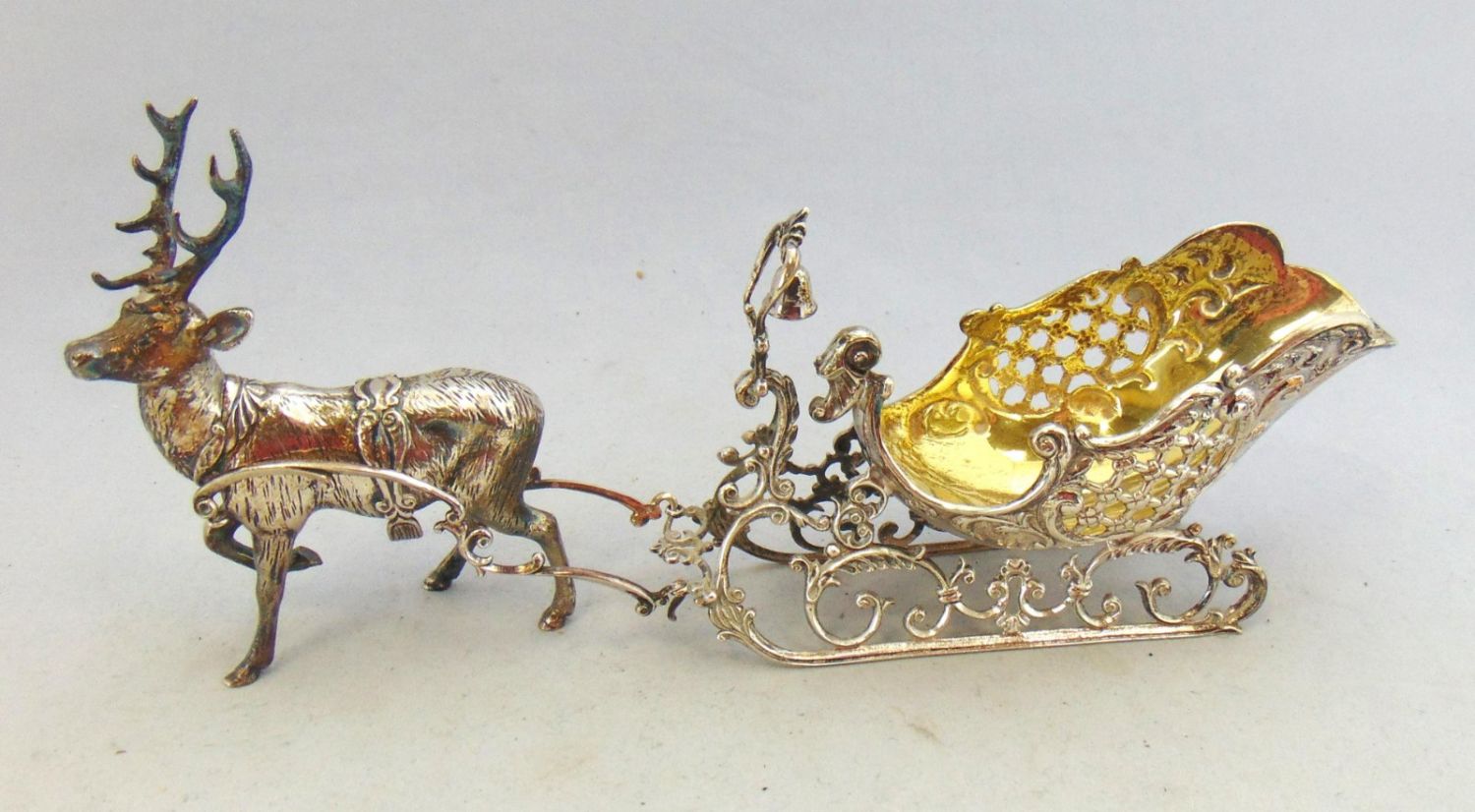 Figural Silver-plate Christmas Sleigh and deer, 10" long. Condition: good with no defects found.