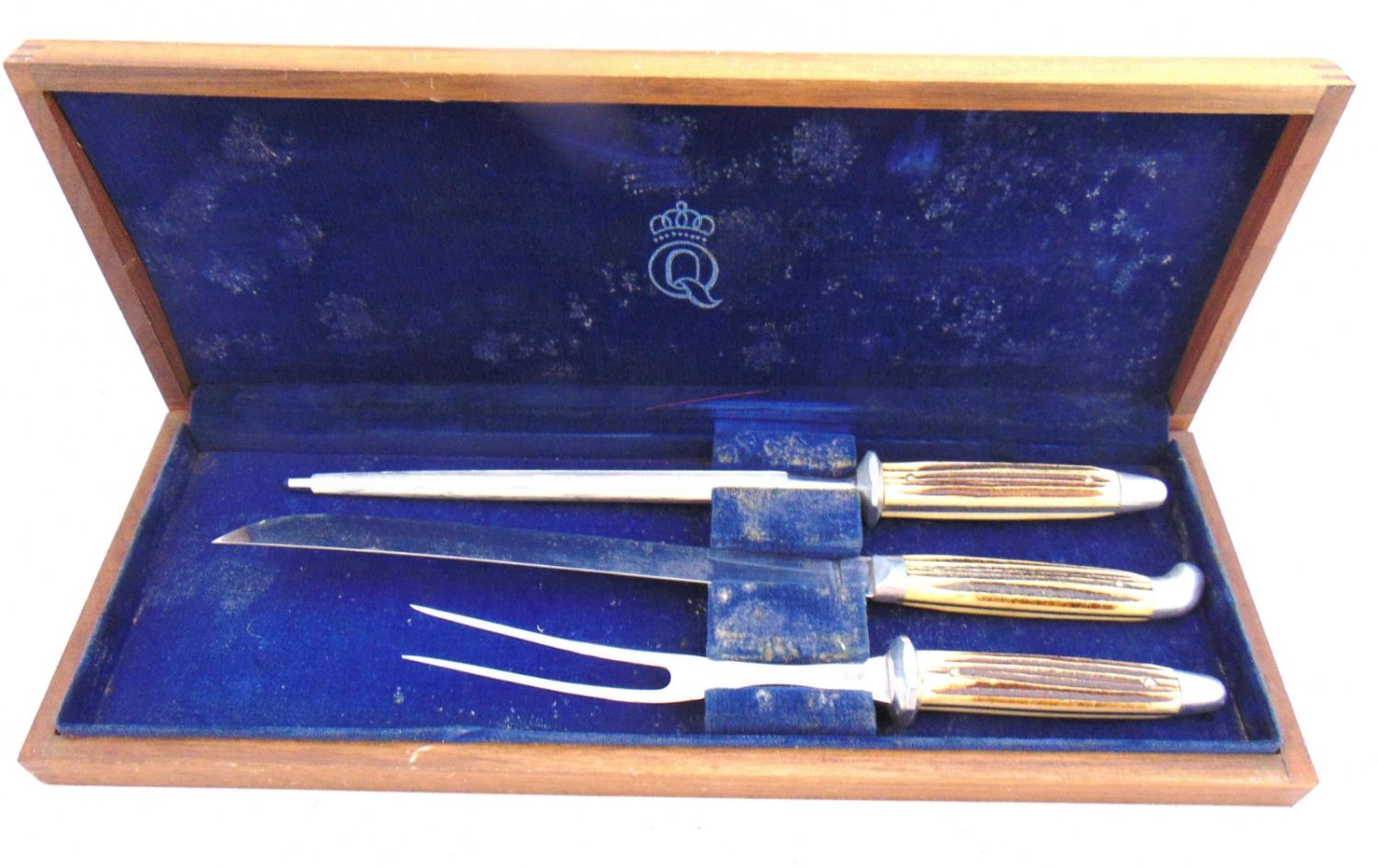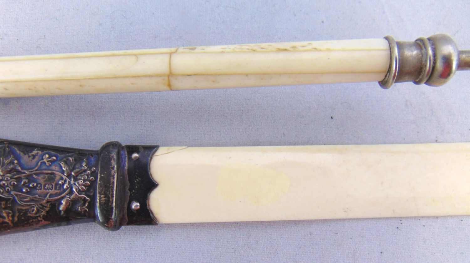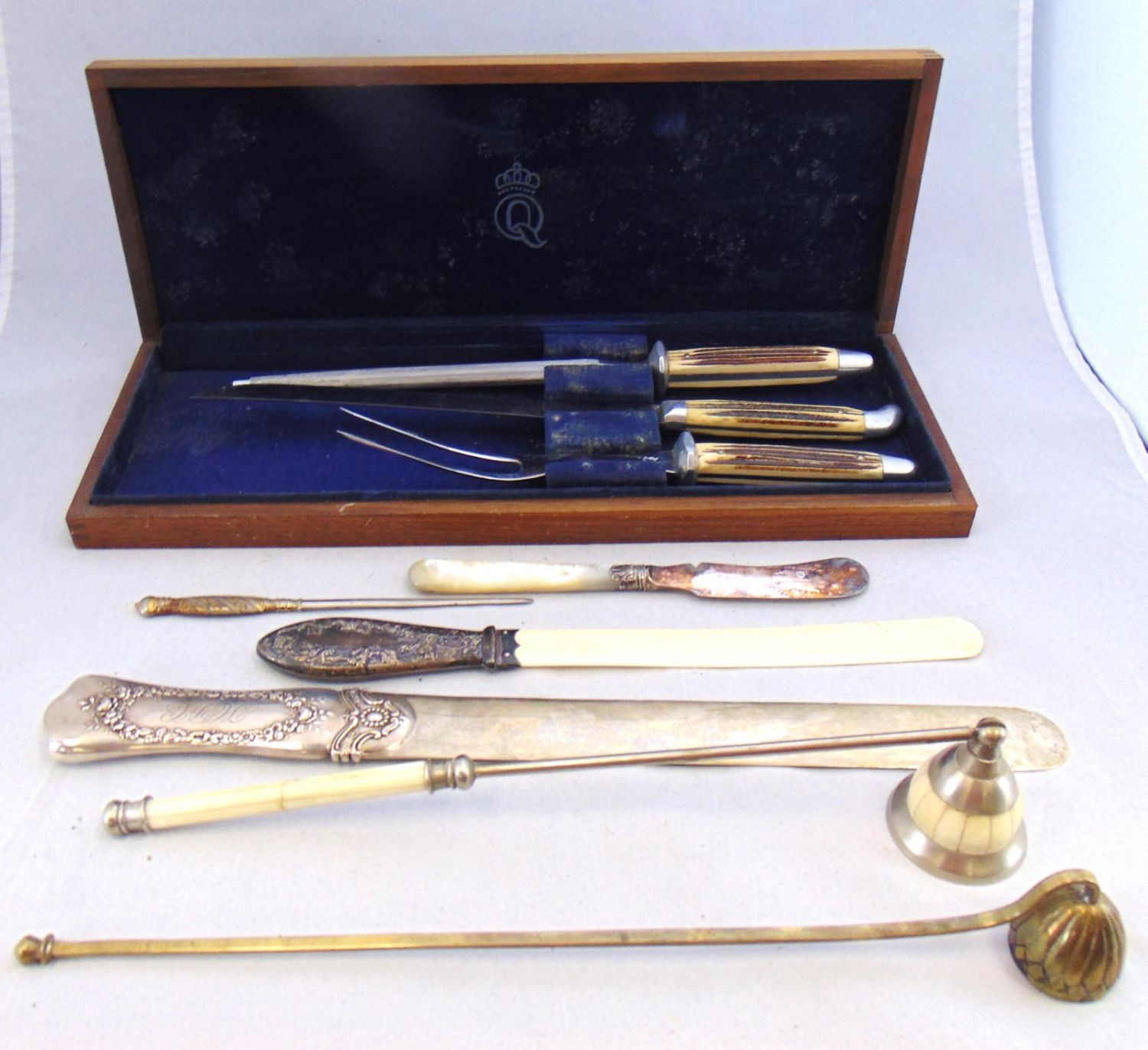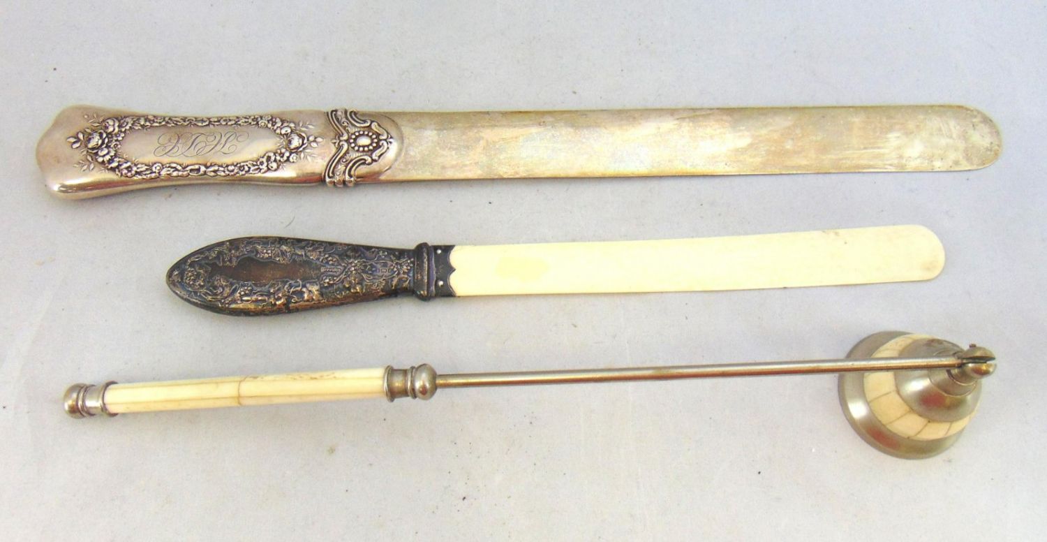 Including two candle snuffers, a MOP butter knife, three letter openers including a sterling with embossed handle, and a horn handle carving set, longest 15." Condition: minor wear and a few cracks, see picture.
