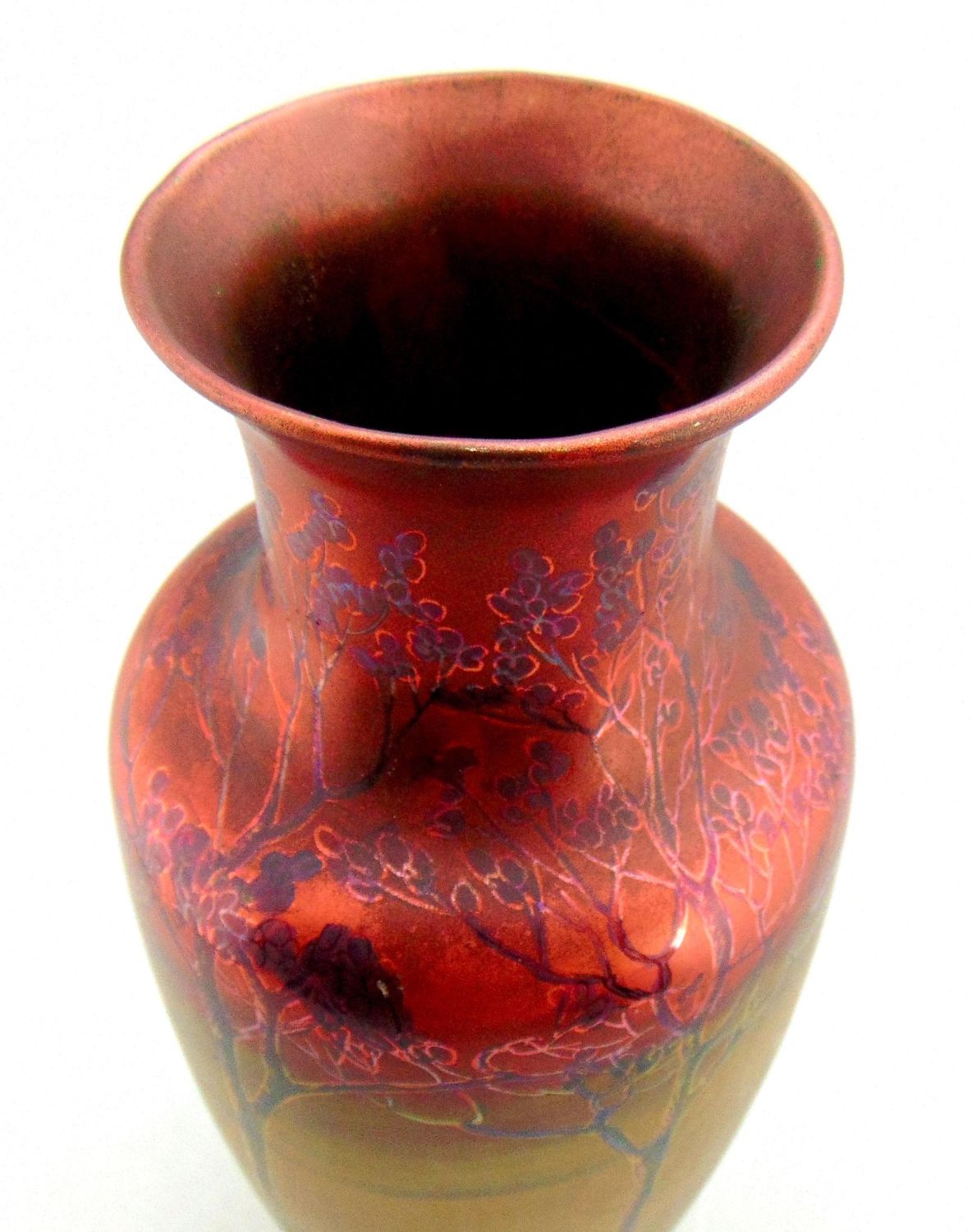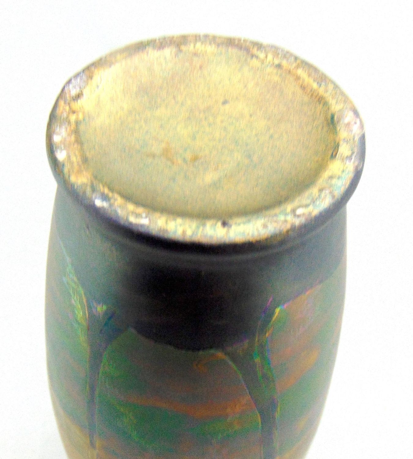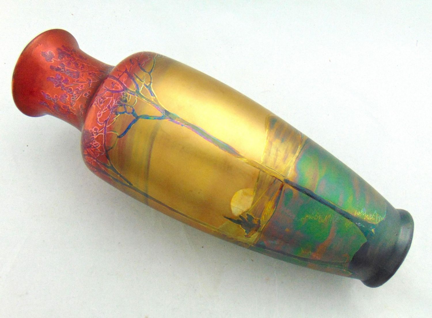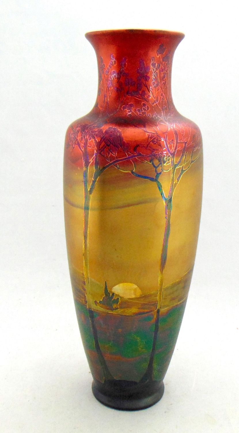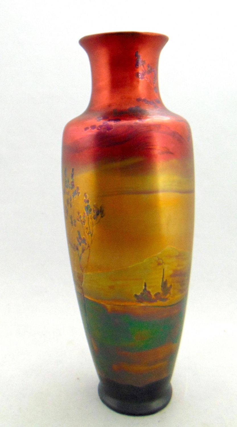 John Lessell for Weller pottery cylindrical shouldered form in metallic red, gold and blue decorated with a scenic sunset signed on the base Lessell, 12 1/2" ht. Condition: good with no defects found