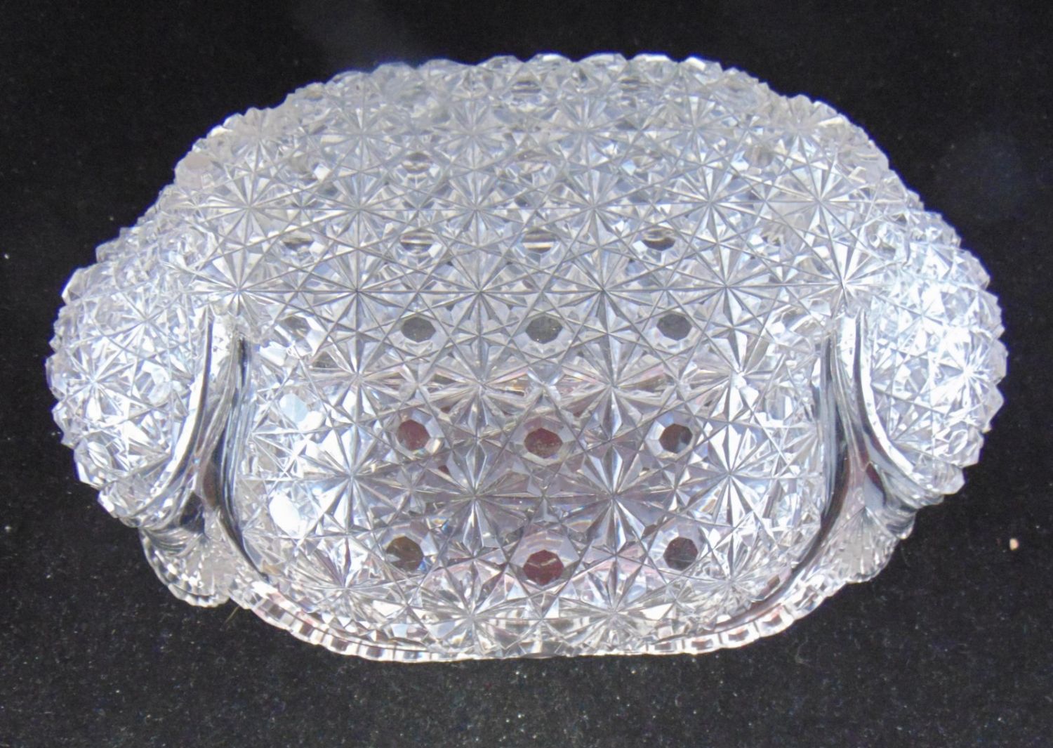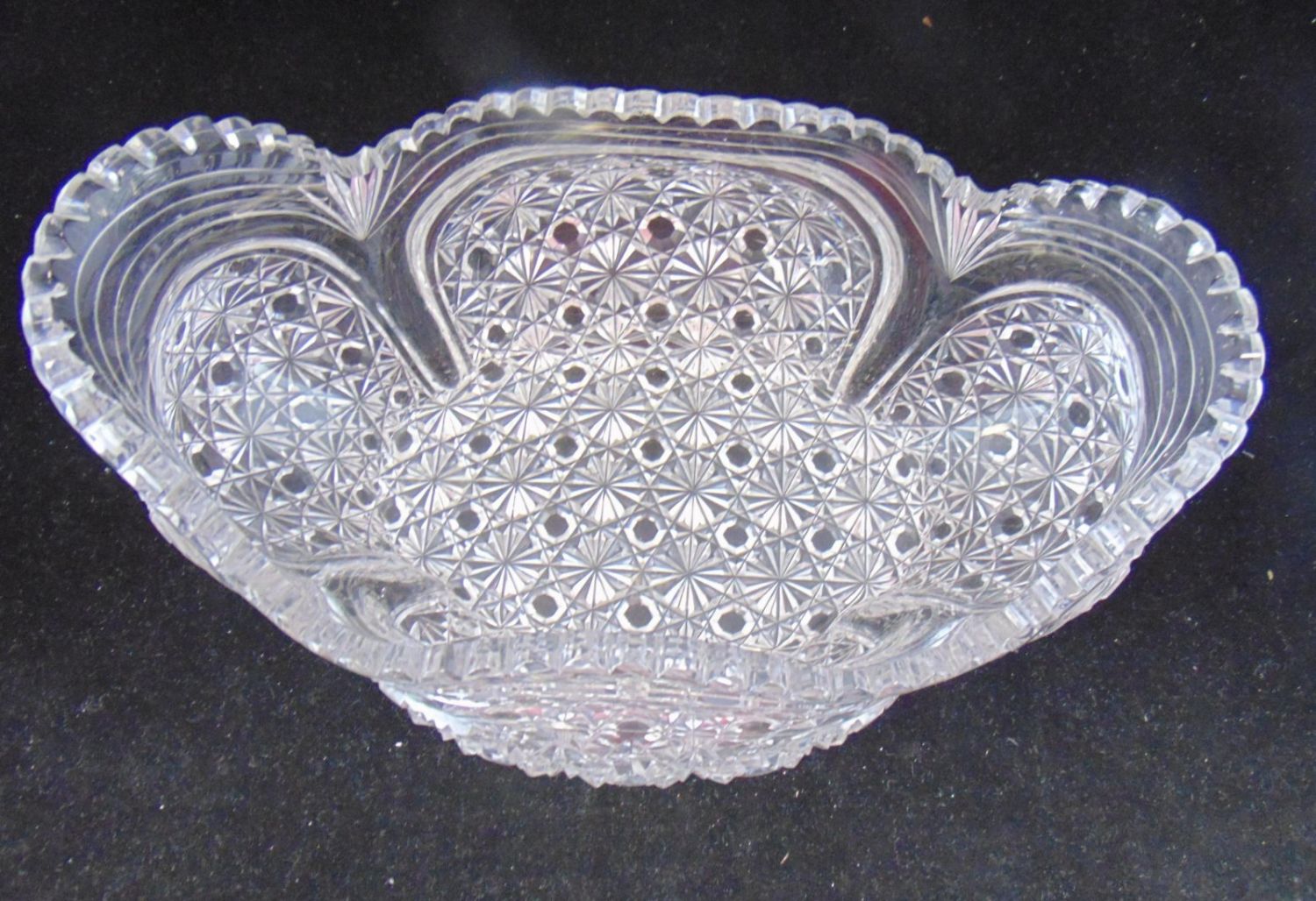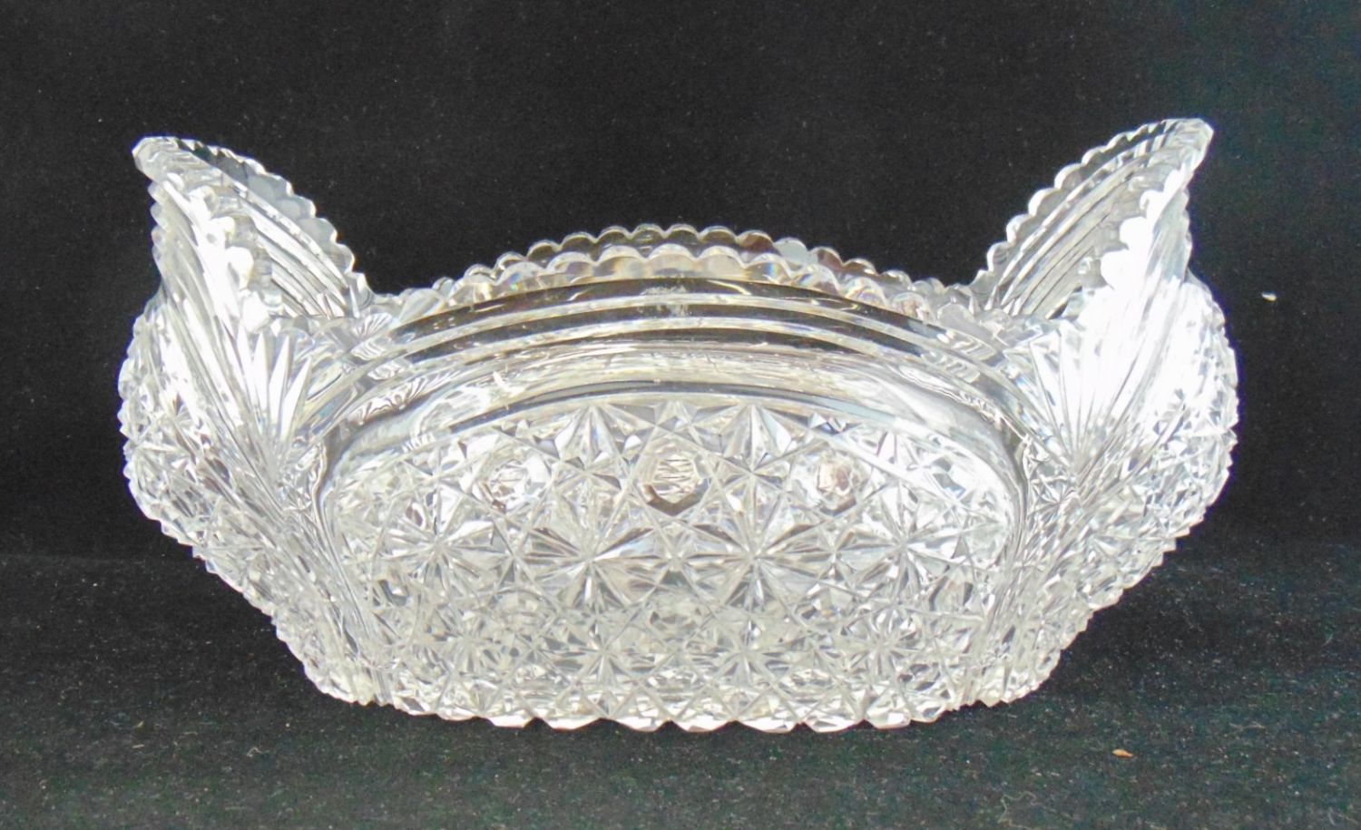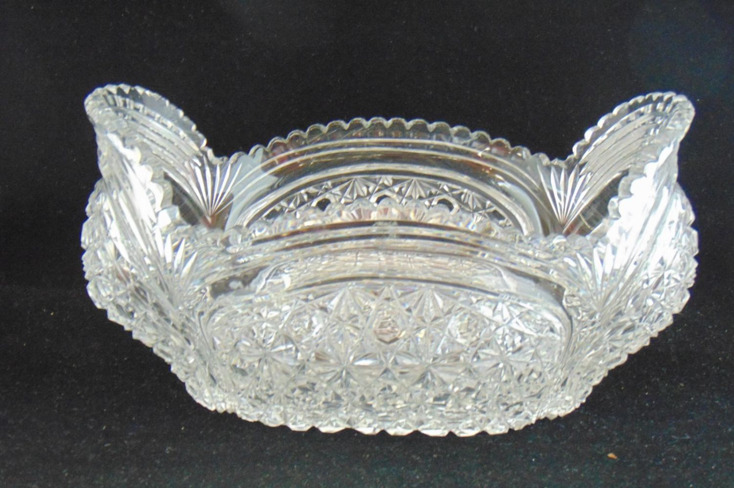American Brilliant Cut Glass elongated bowl with bulging sides in the "Russian" cut pattern, 11 1/2" long by 5 1/2" ht. Condition: good with very minor chips.