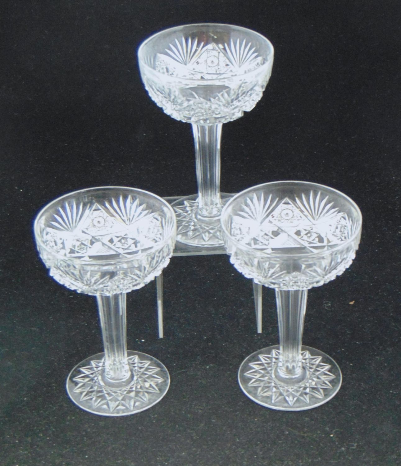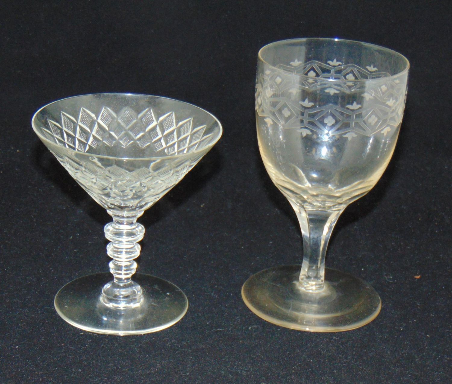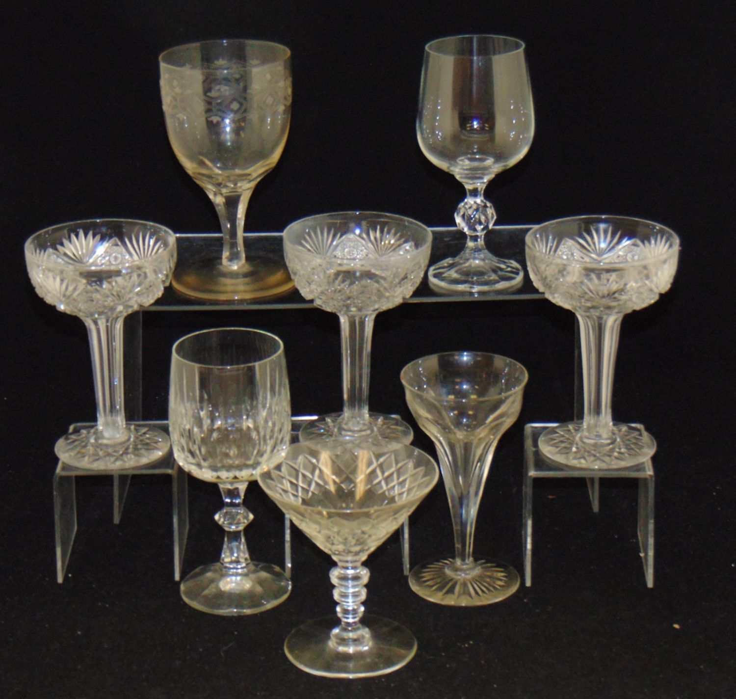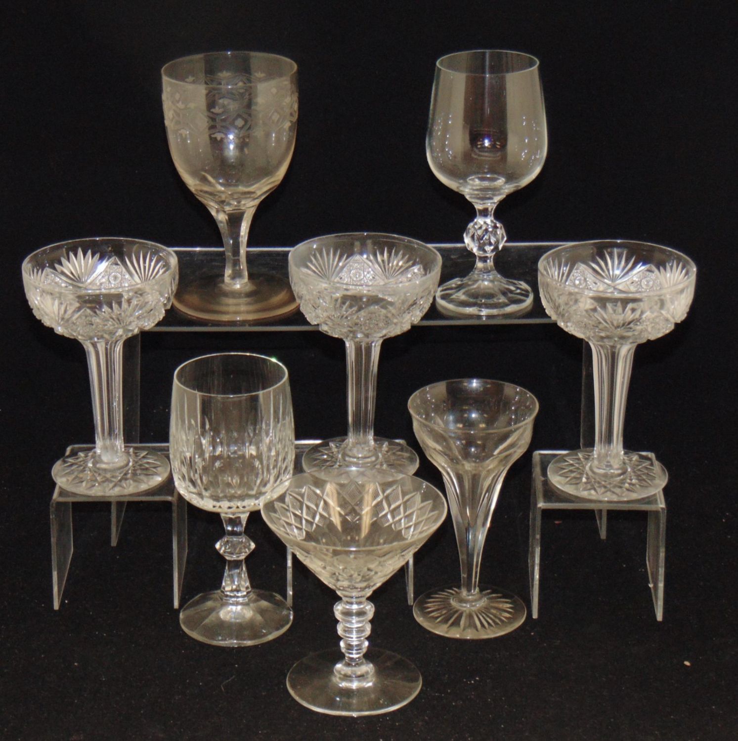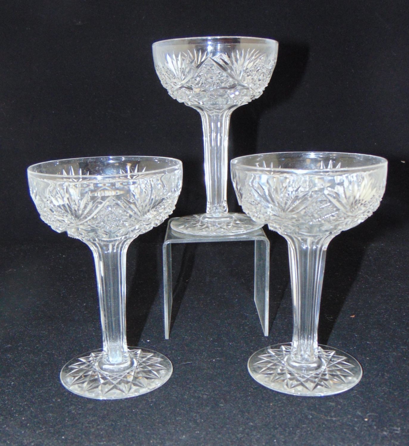 Group of eight various American Brilliant cut glass goblets, tallest 6" ht. NOTE: cut glass inherently has minor imperfections these are not noted and visual damage we have attempted to note. Condition: good with no defects found.