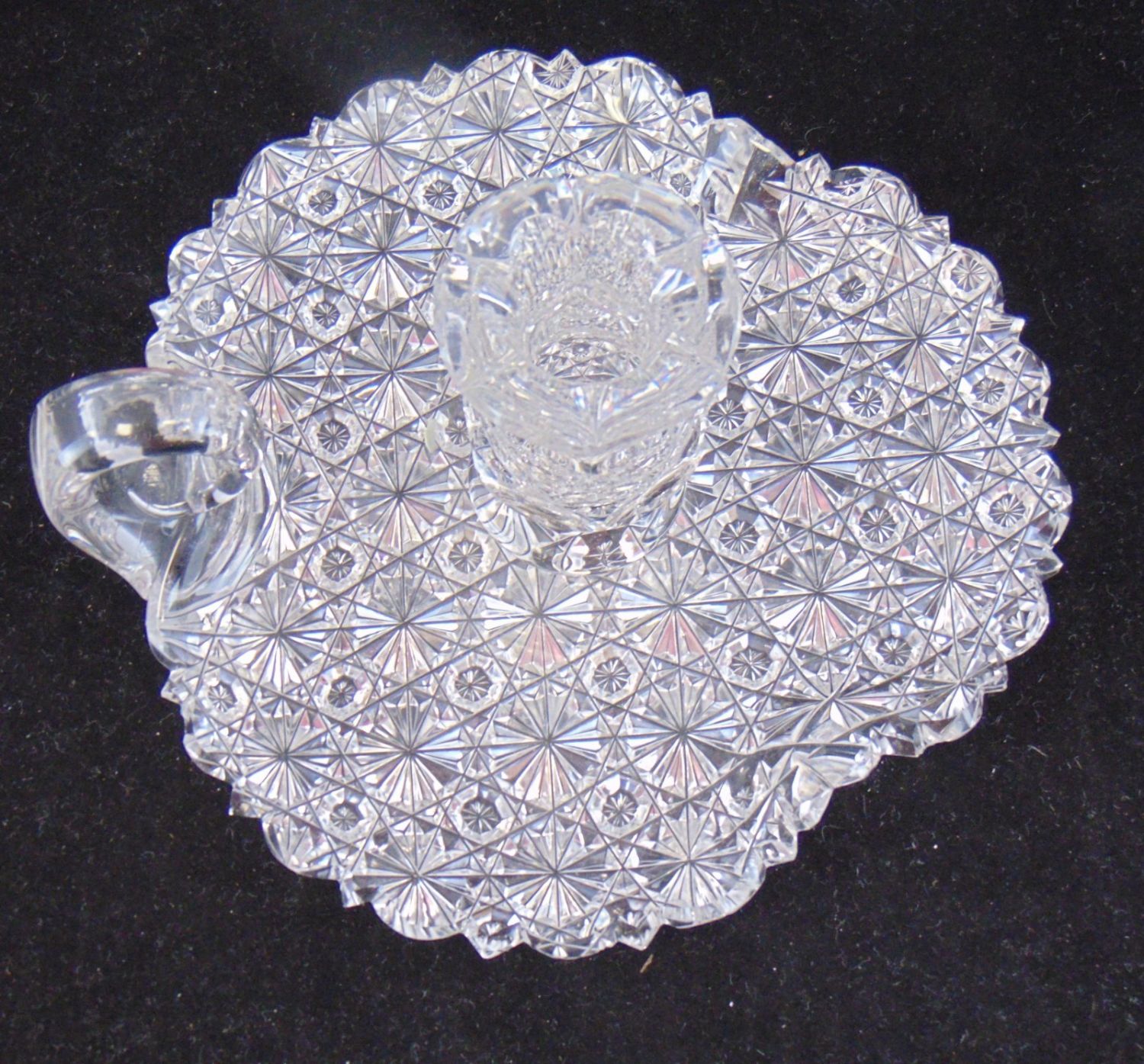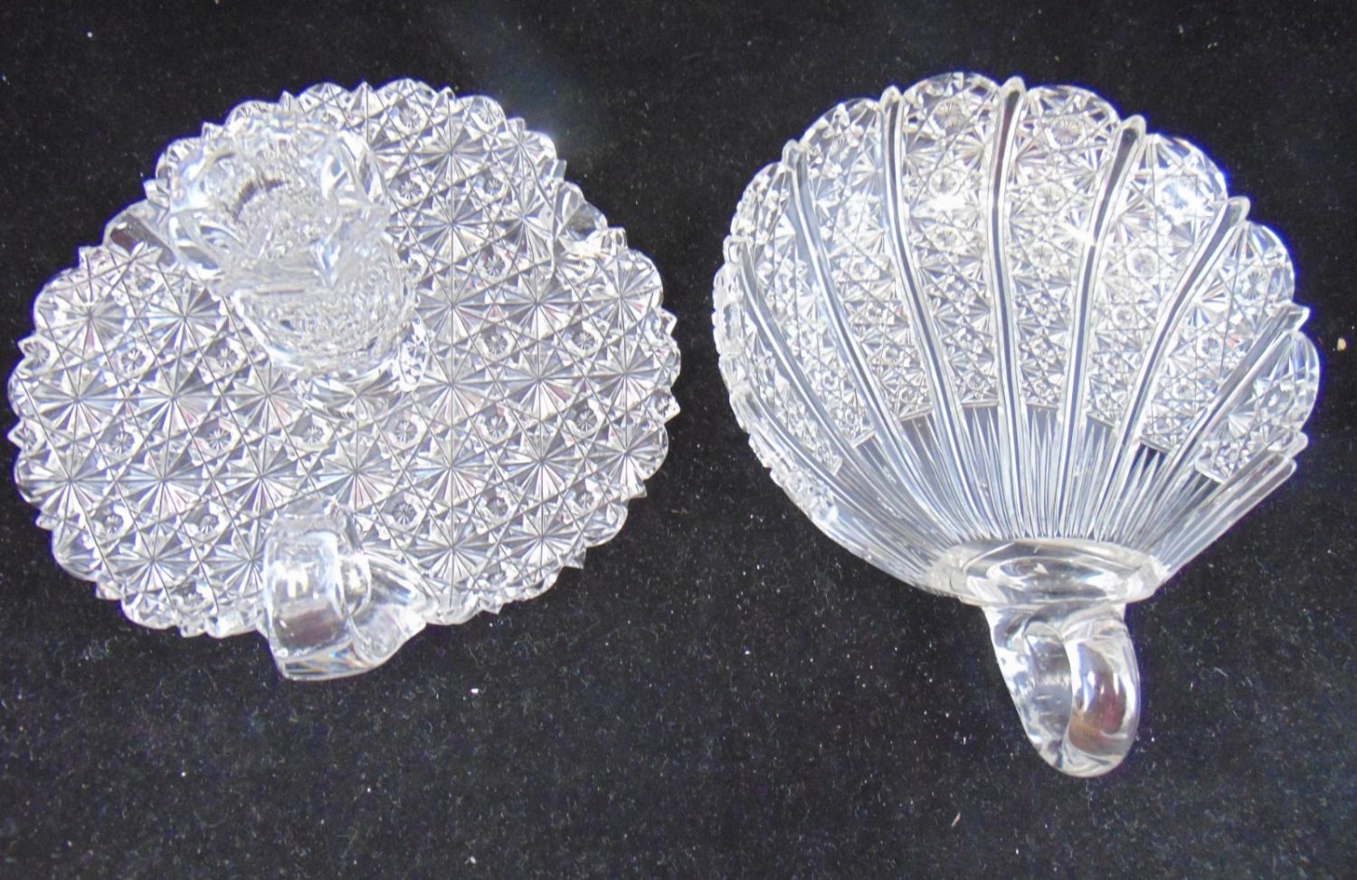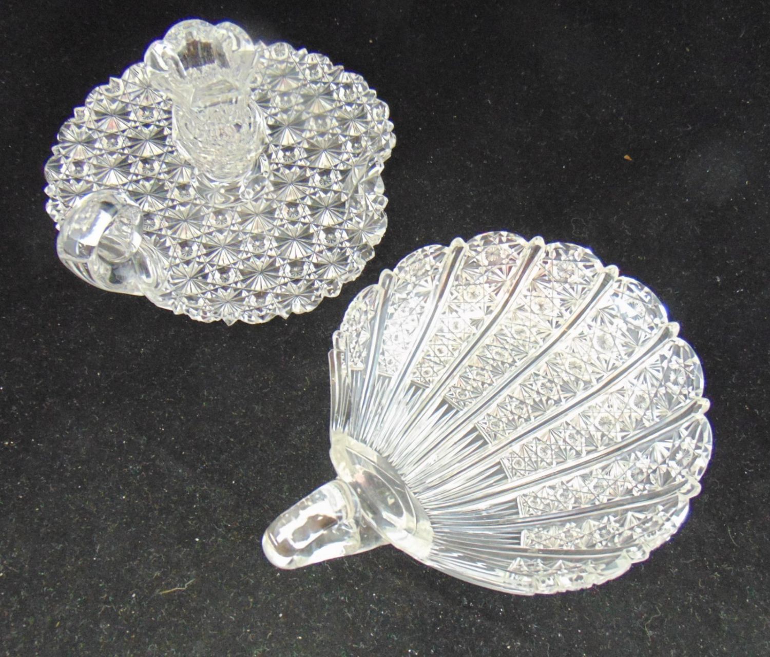 Including a Dorflinger finger candlestick in the Russian pattern, together with a shell formed nappy, 7 1/2" ht. Condition: good, with minor chips to the back of the shell