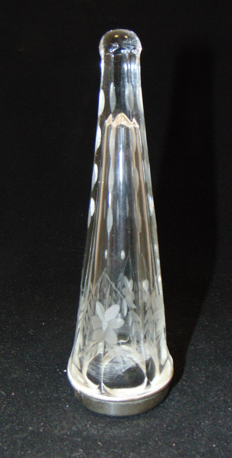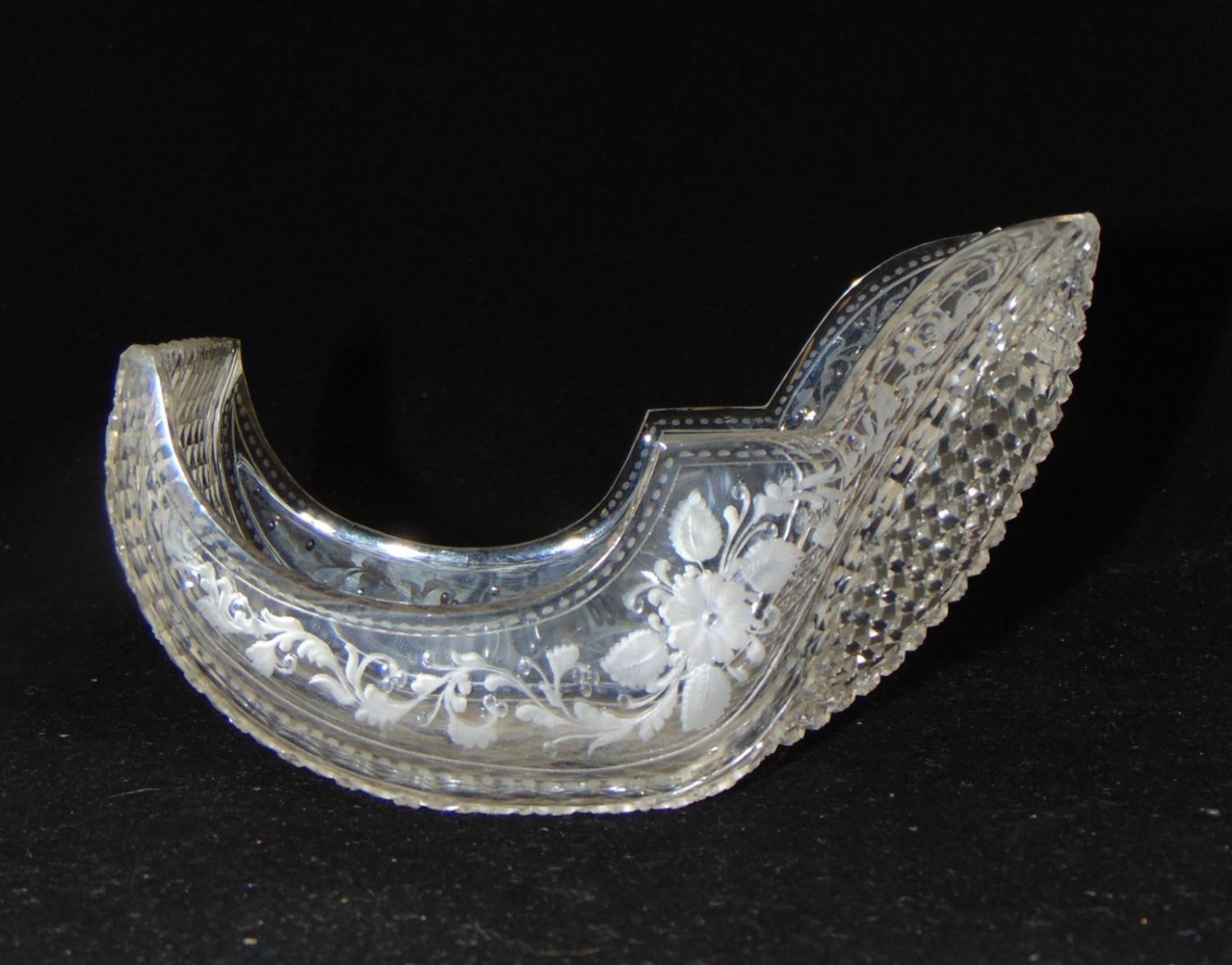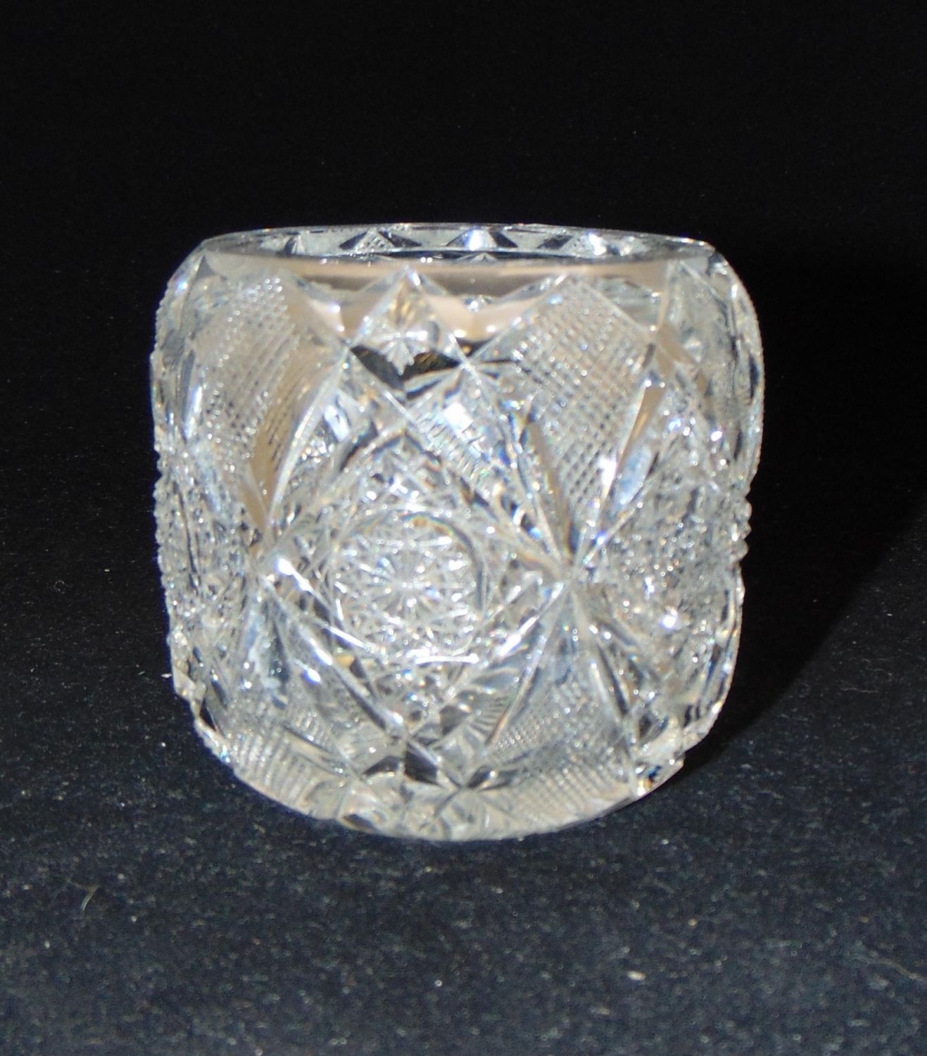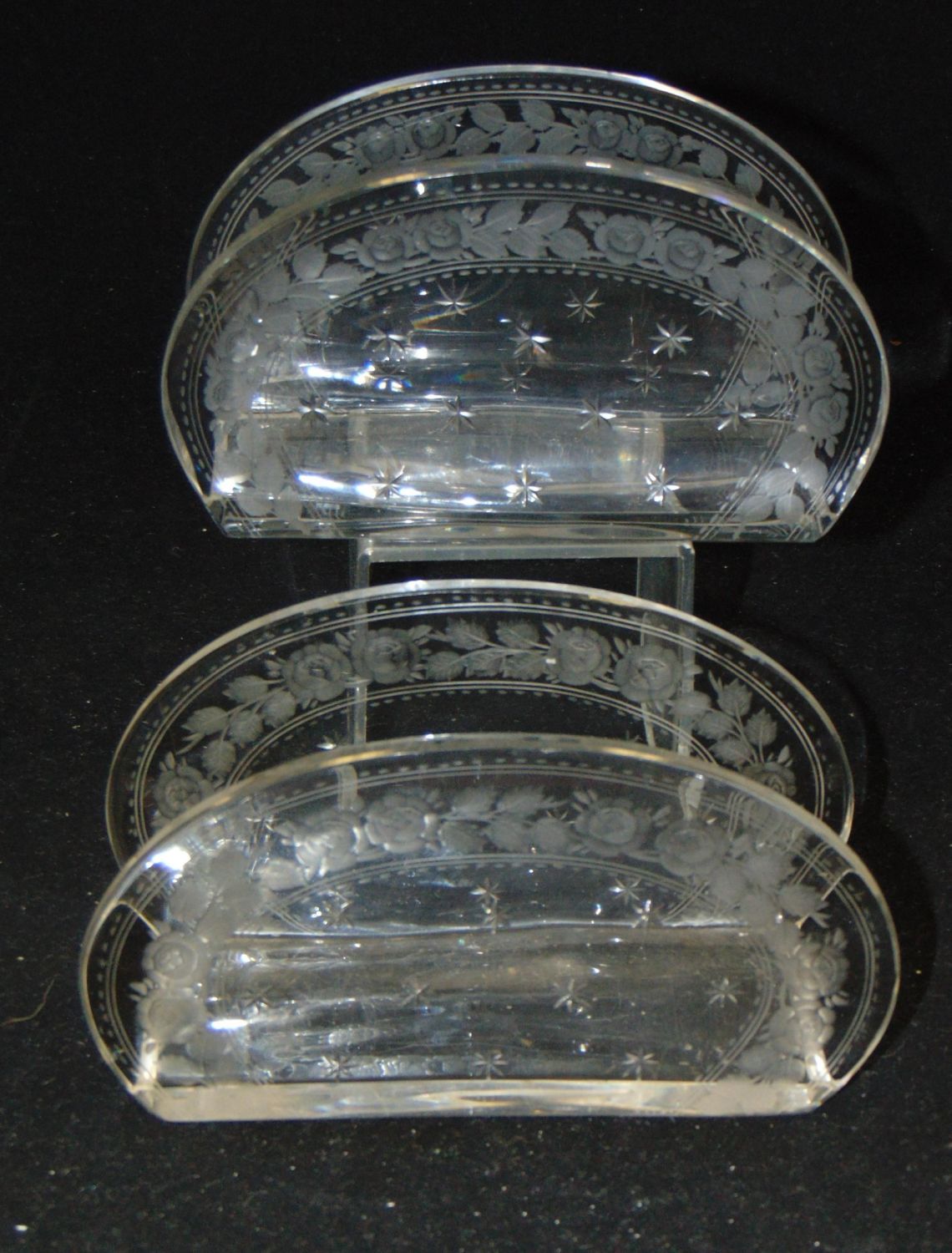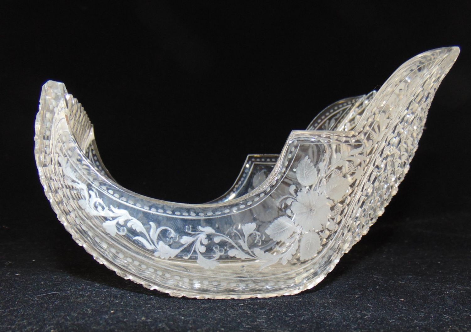 Group of 6 cut glass items including a Dorflinger strawberry and diamond boat tray, two Sinclair tiny diamond napkin holders with etched roses one signed, a limousine vase and rose bowl, longest 9" long. NOTE: cut glass inherently has minor imperfections these are not noted and visual damage we have attempted to note. Condition: good with no defects found