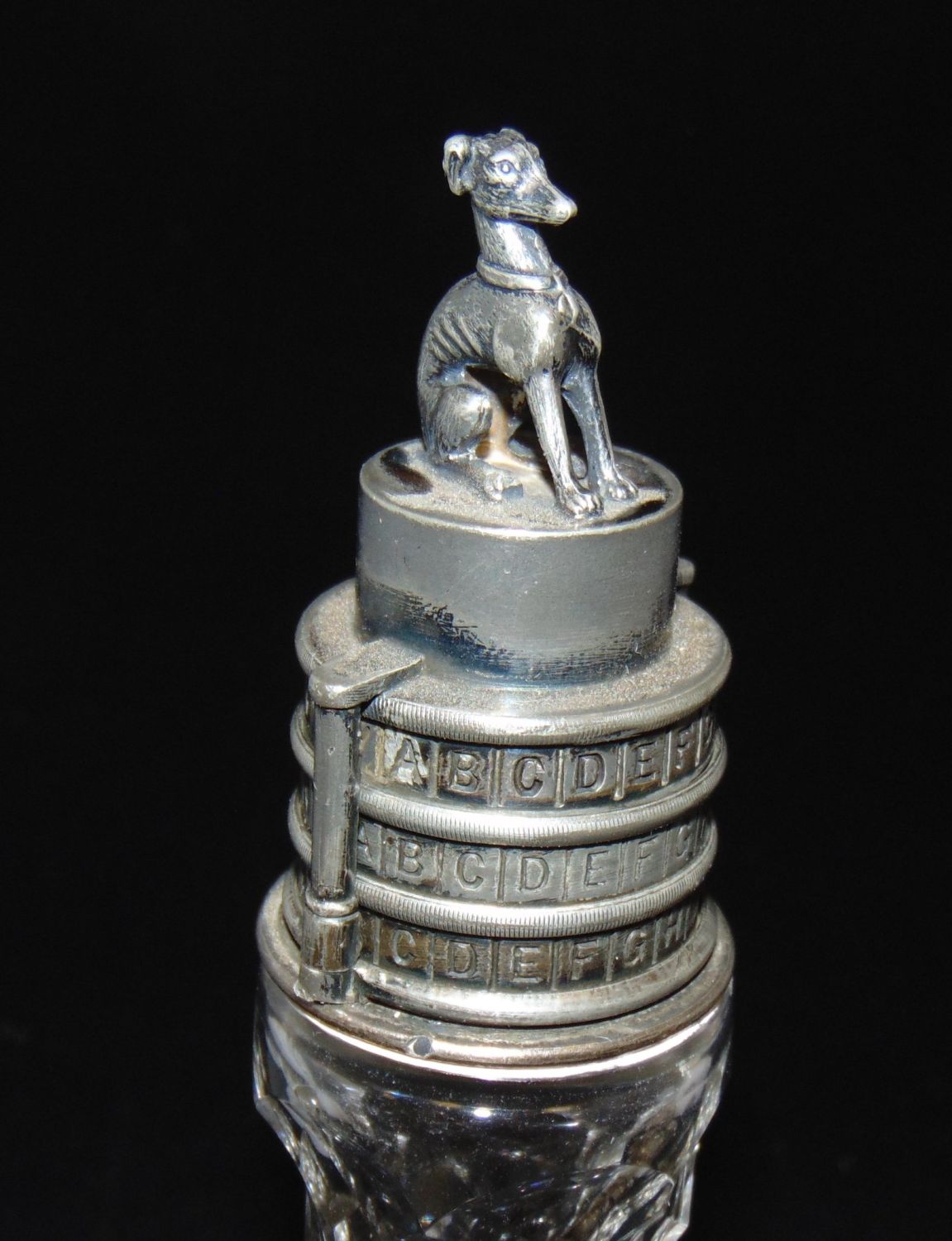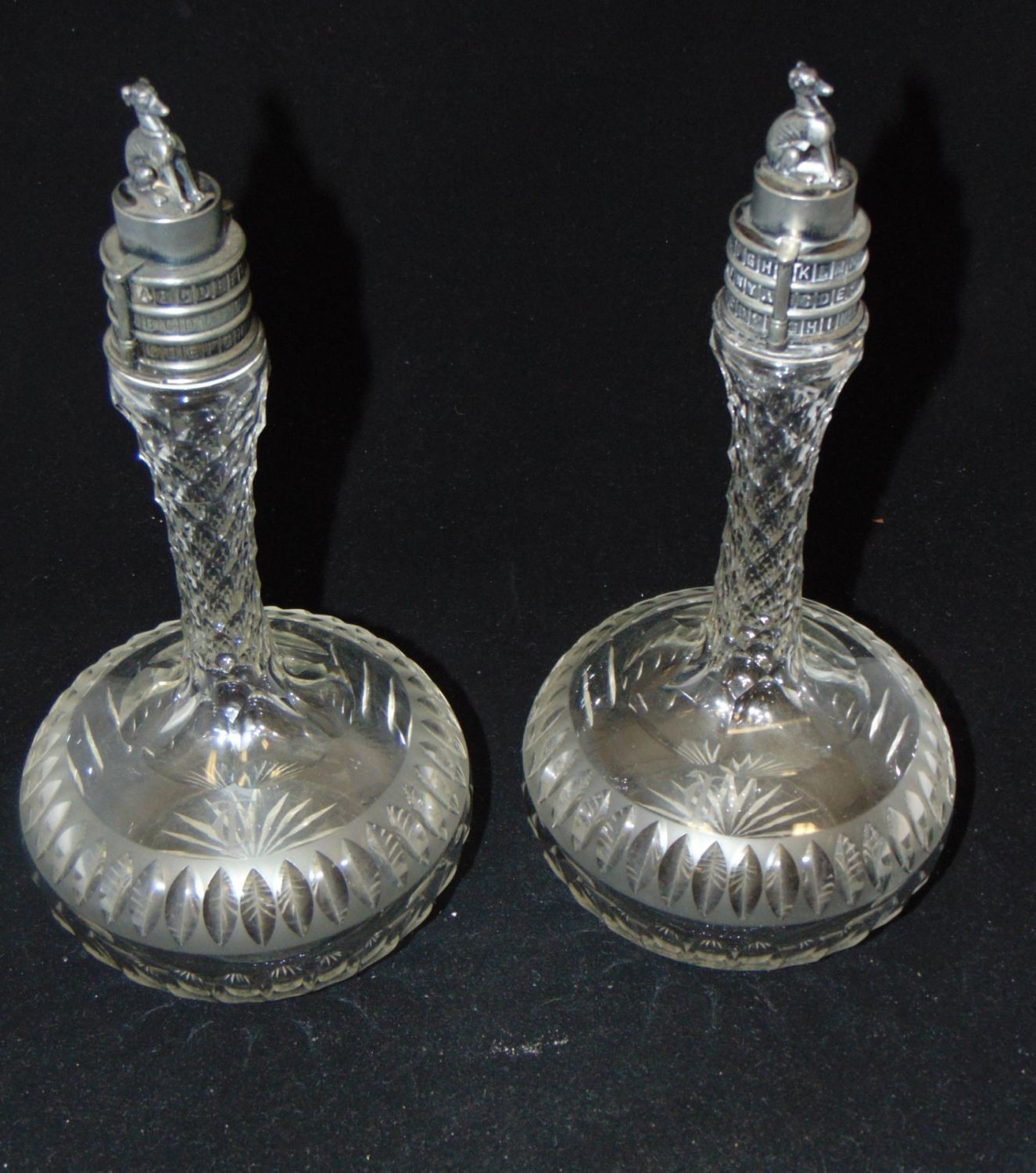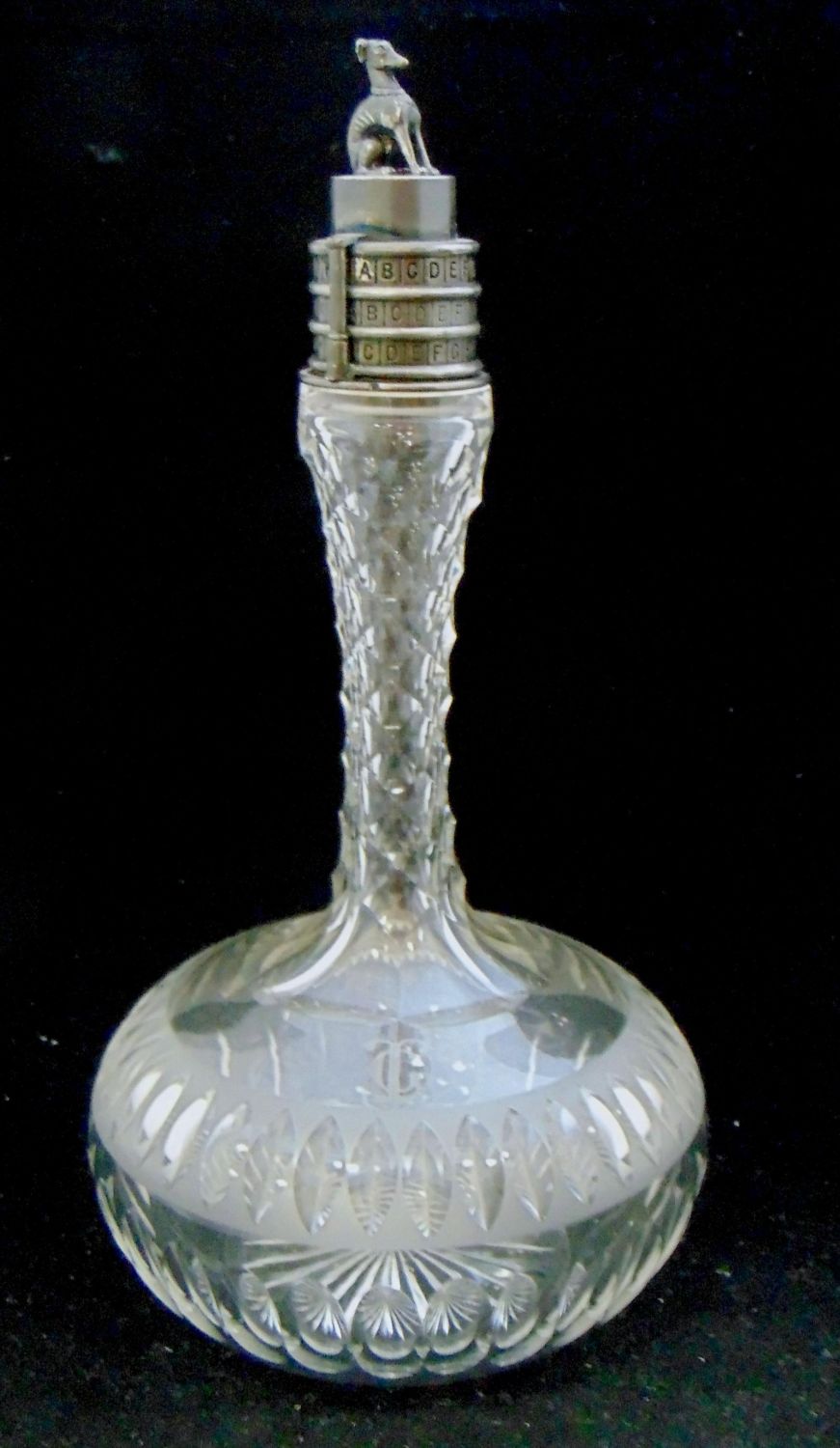 Two cut glass liquor bottled with TC monogram fitted with a triple band alphabet combination stopper with dog finial, 11 1/2" ht. Condition: good with no defects, stoppers are in locked position we do not know the combination.