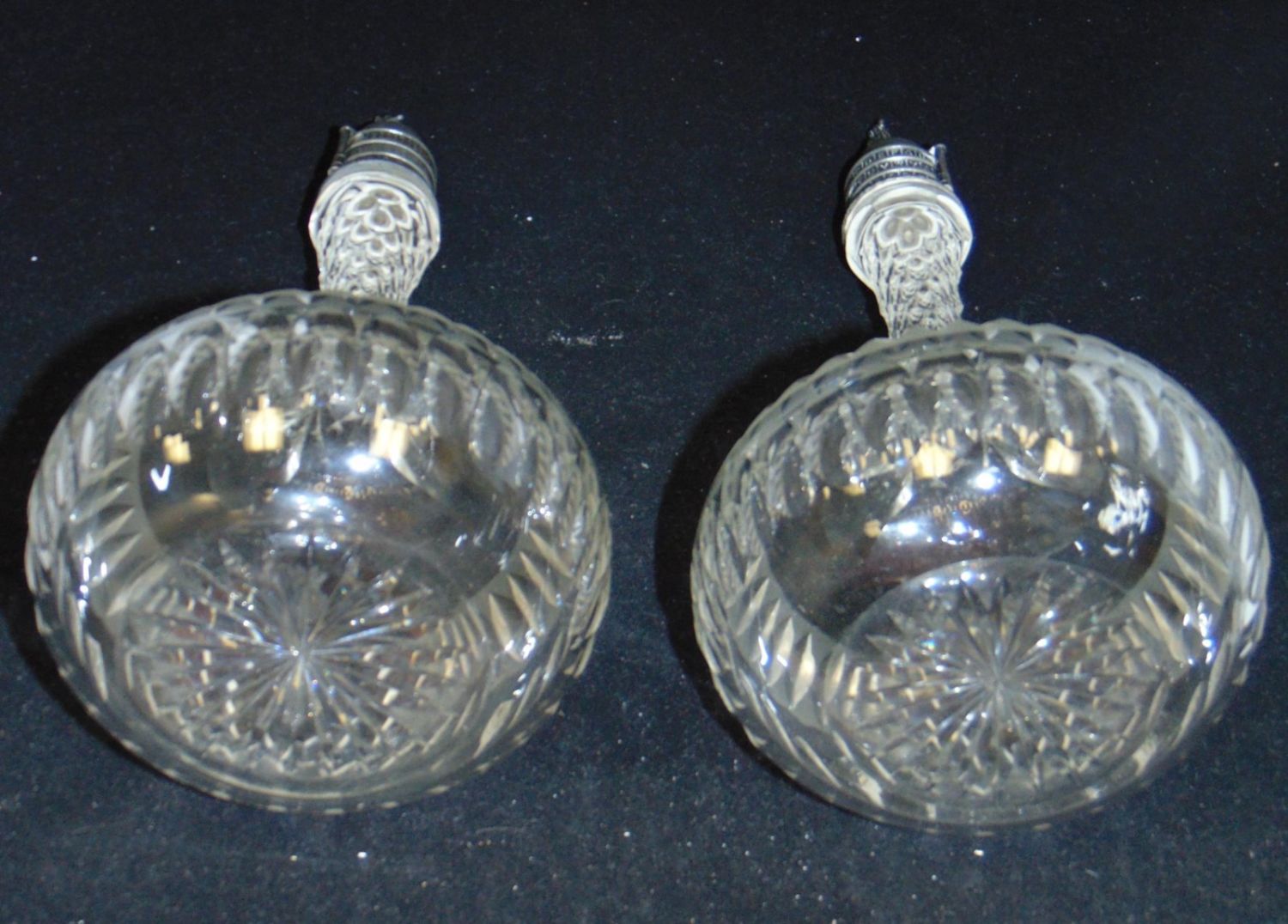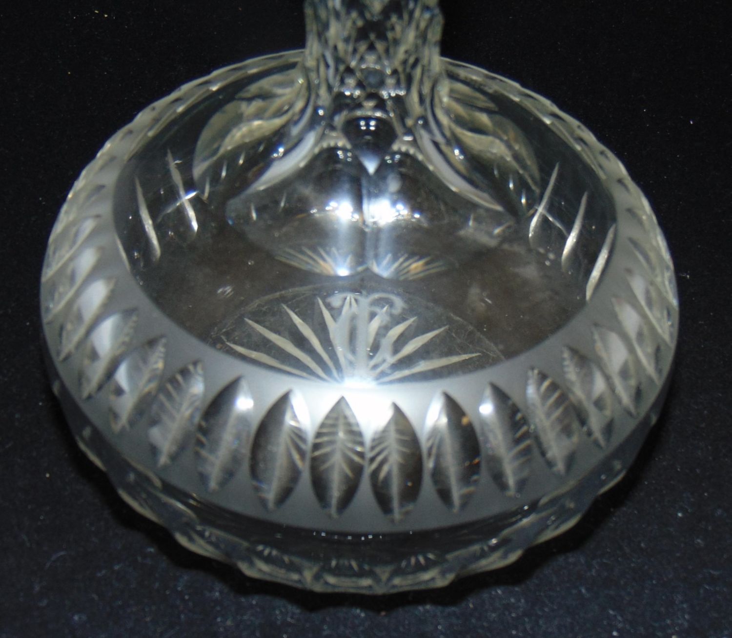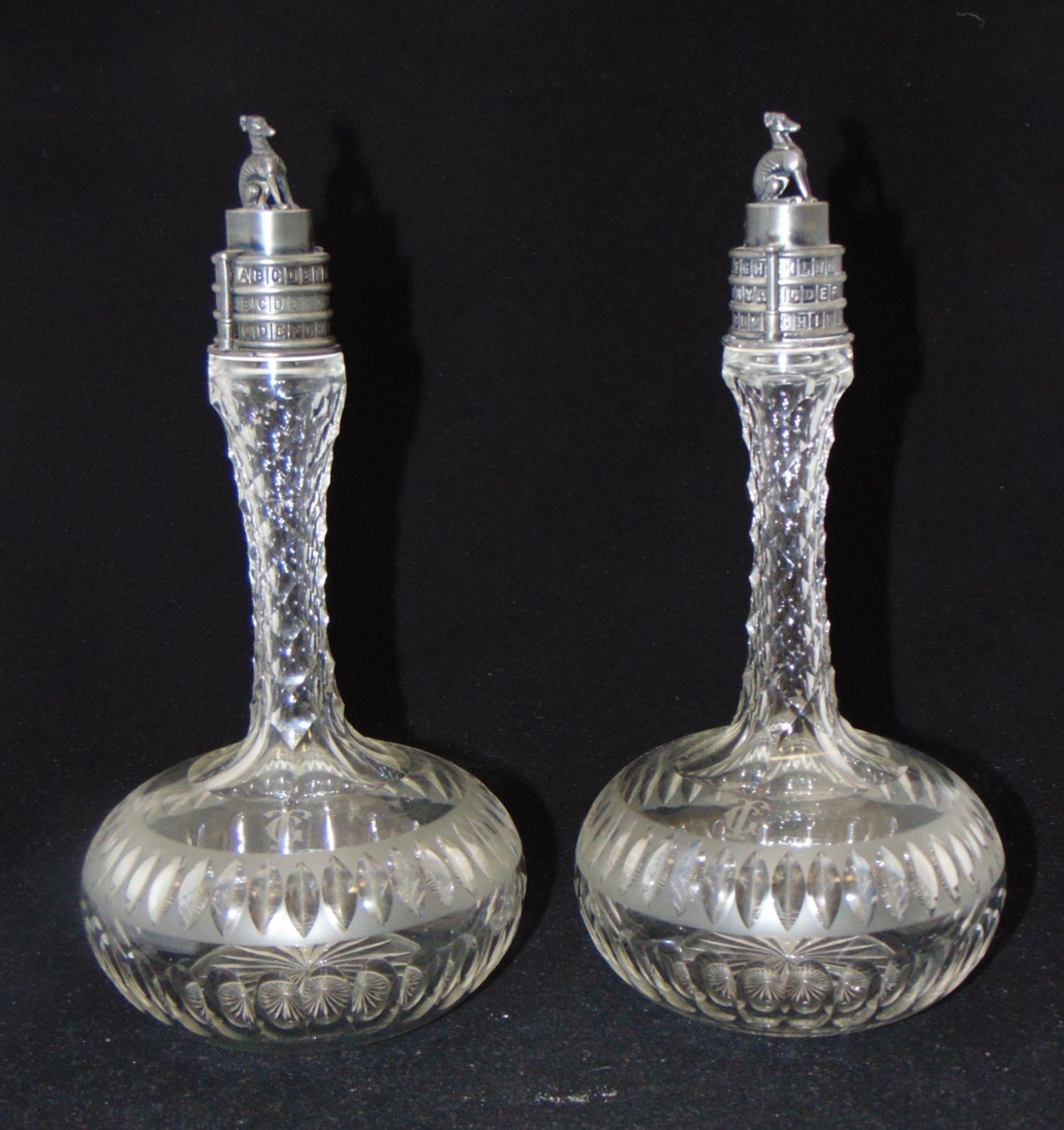 Two cut glass liquor bottled with TC monogram fitted with a triple band alphabet combination stopper with dog finial, 11 1/2" ht. Condition: good with no defects, stoppers are in locked position we do not know the combination.