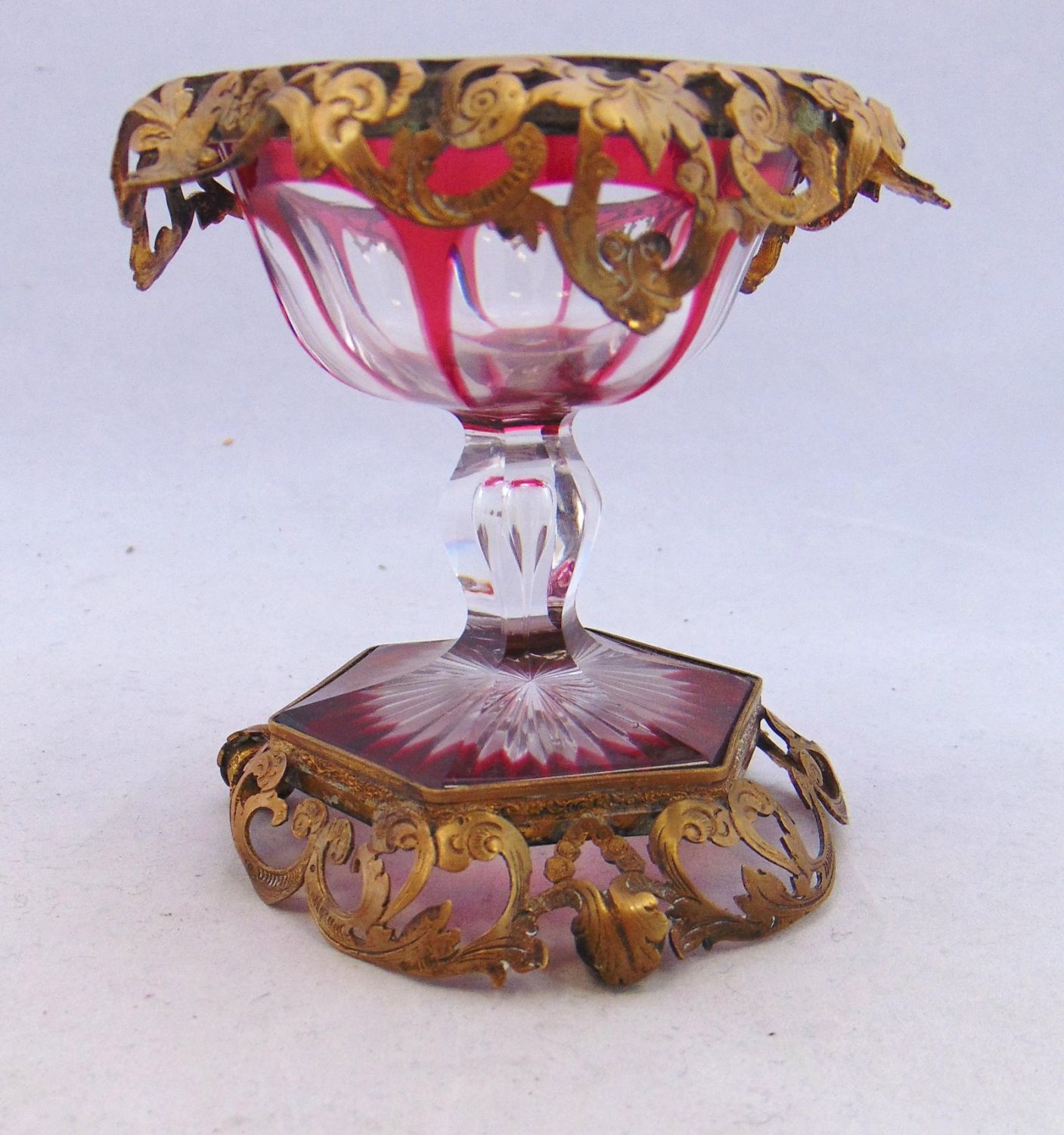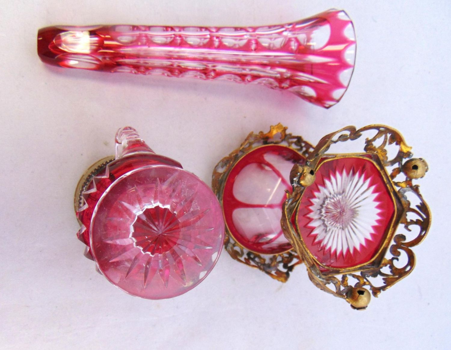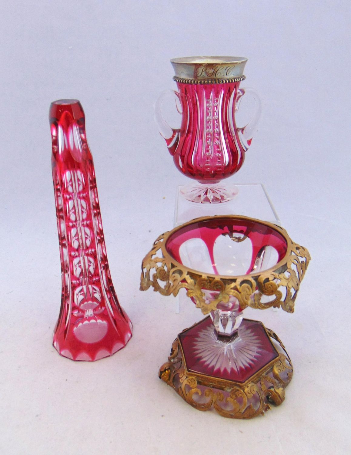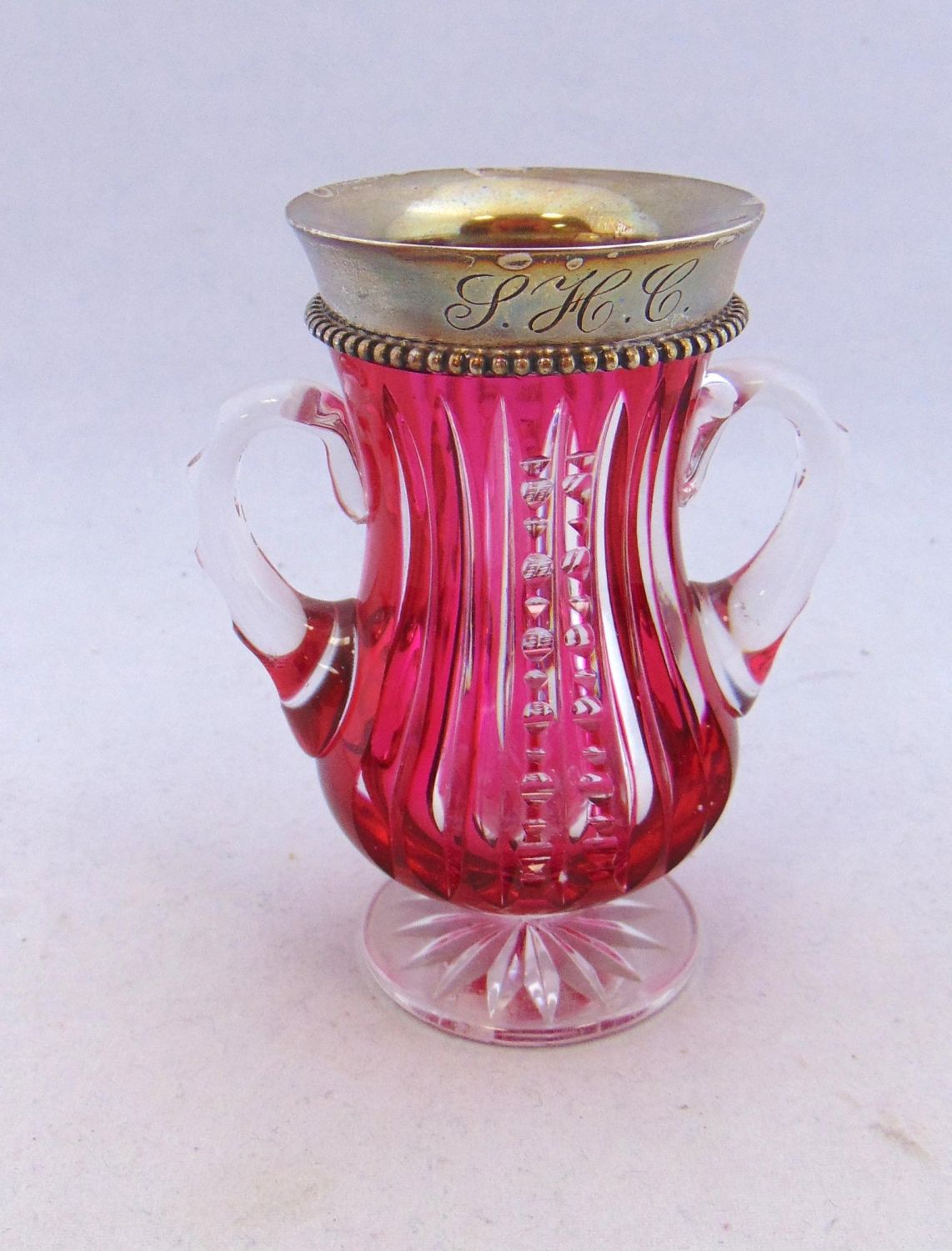Including a Dorflinger Automobile vase, a two handled sterling rim footed urn with a Miter cut, and a European compote with a metal scrolling foot and rim, tallest 6 1/2" ht. NOTE: cut glass inherently has minor imperfections these are not noted and visual damage we have attempted to note. Condition: good with no defects, metal foot and rim with bent metal appears to be on purpose.