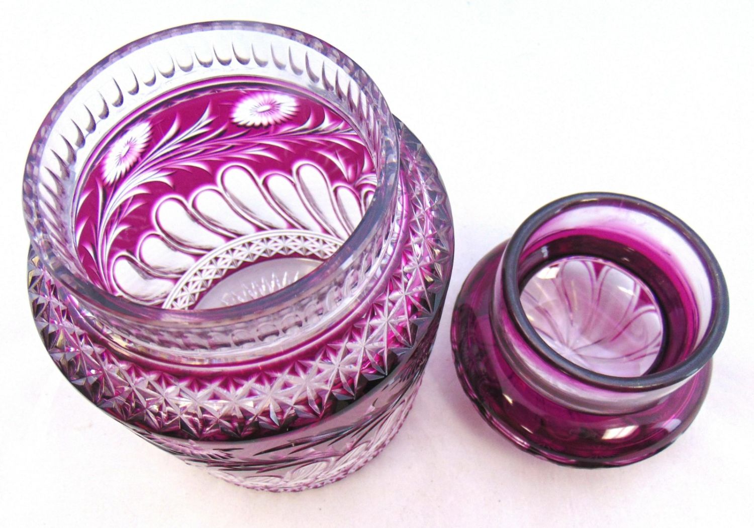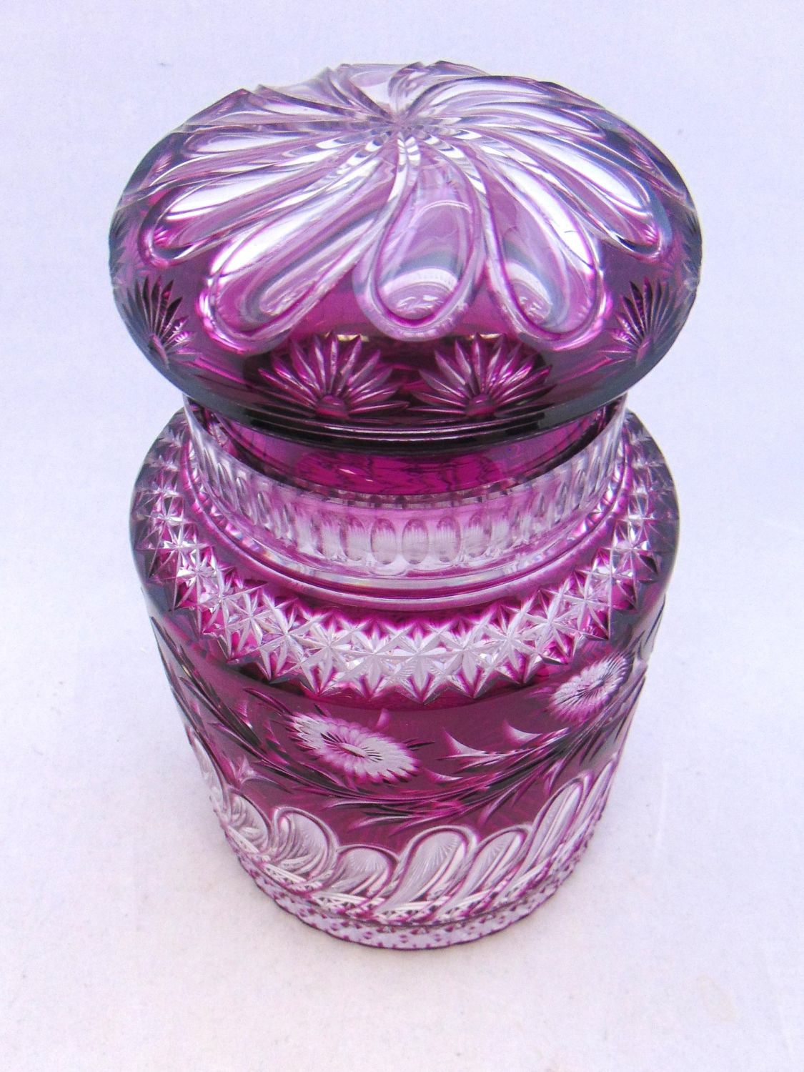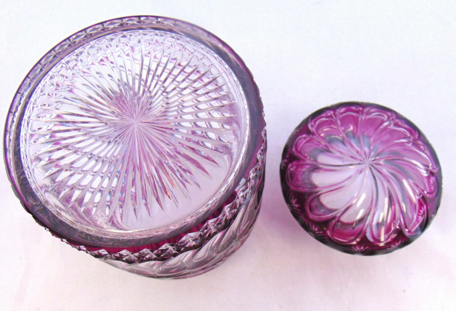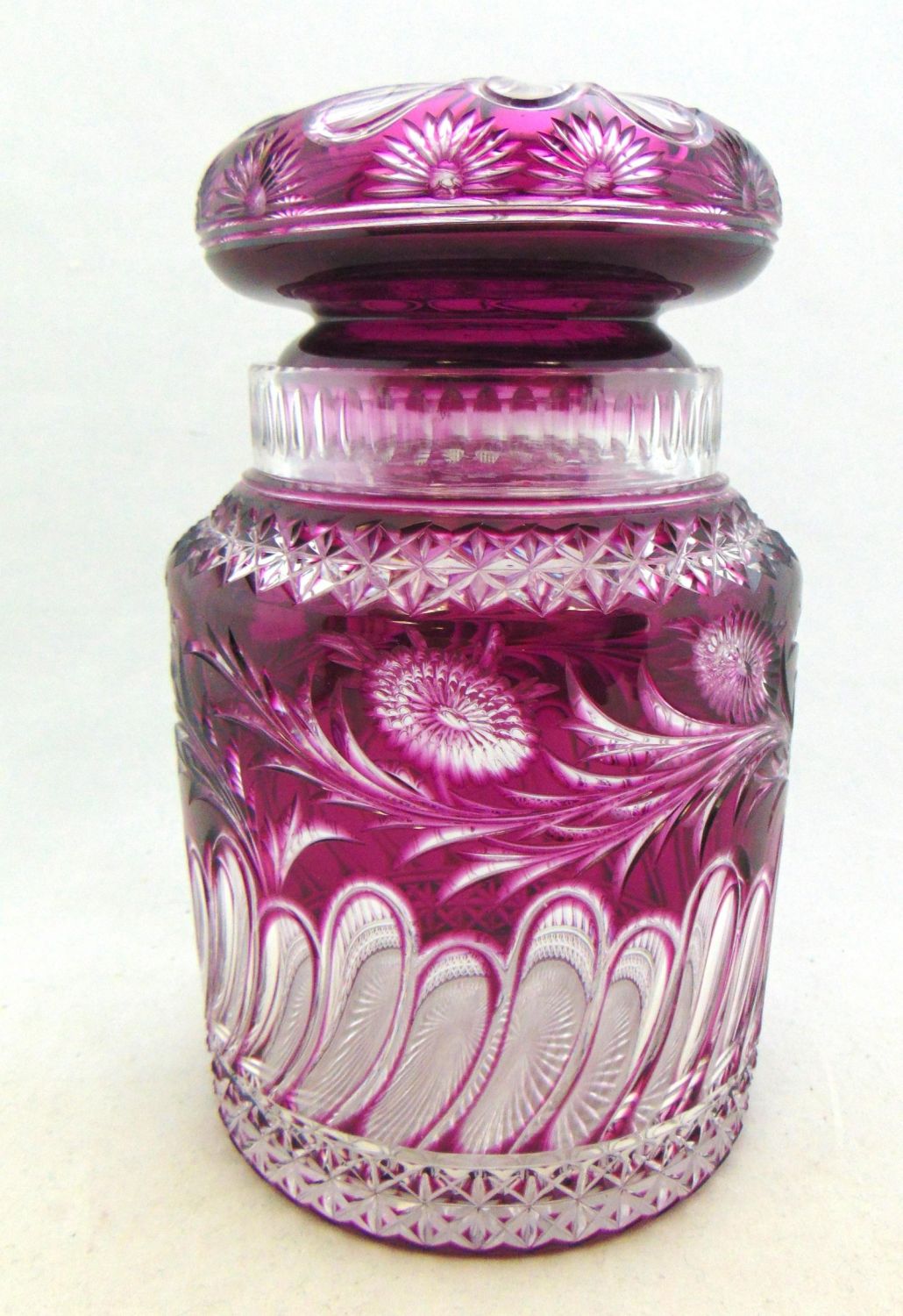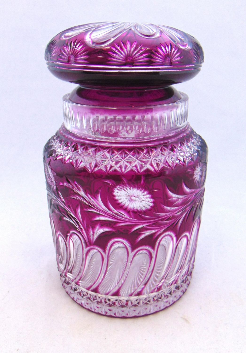 Stevens and Williams purple cut to clear Humidor with scrolling fingers and stemmed flowers, matching lid 8" ht. Condition: good with no defects found.
