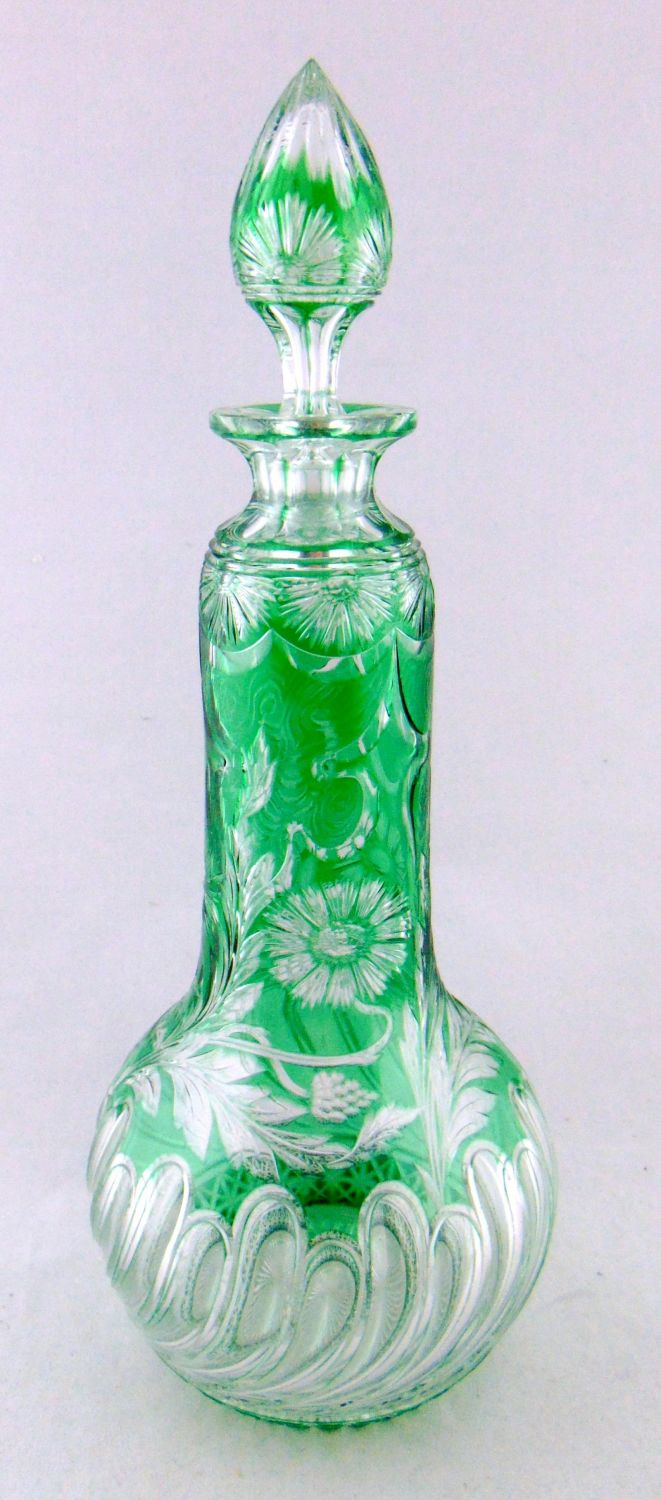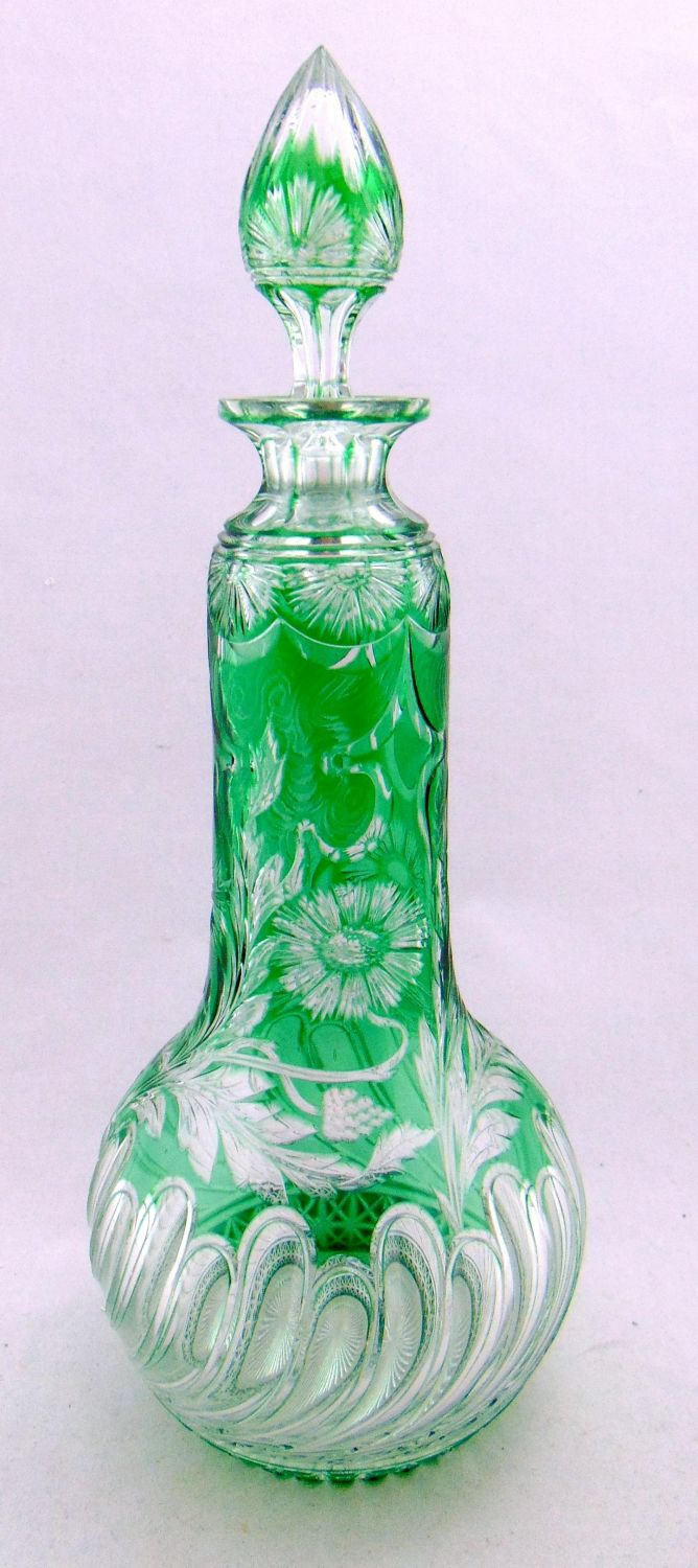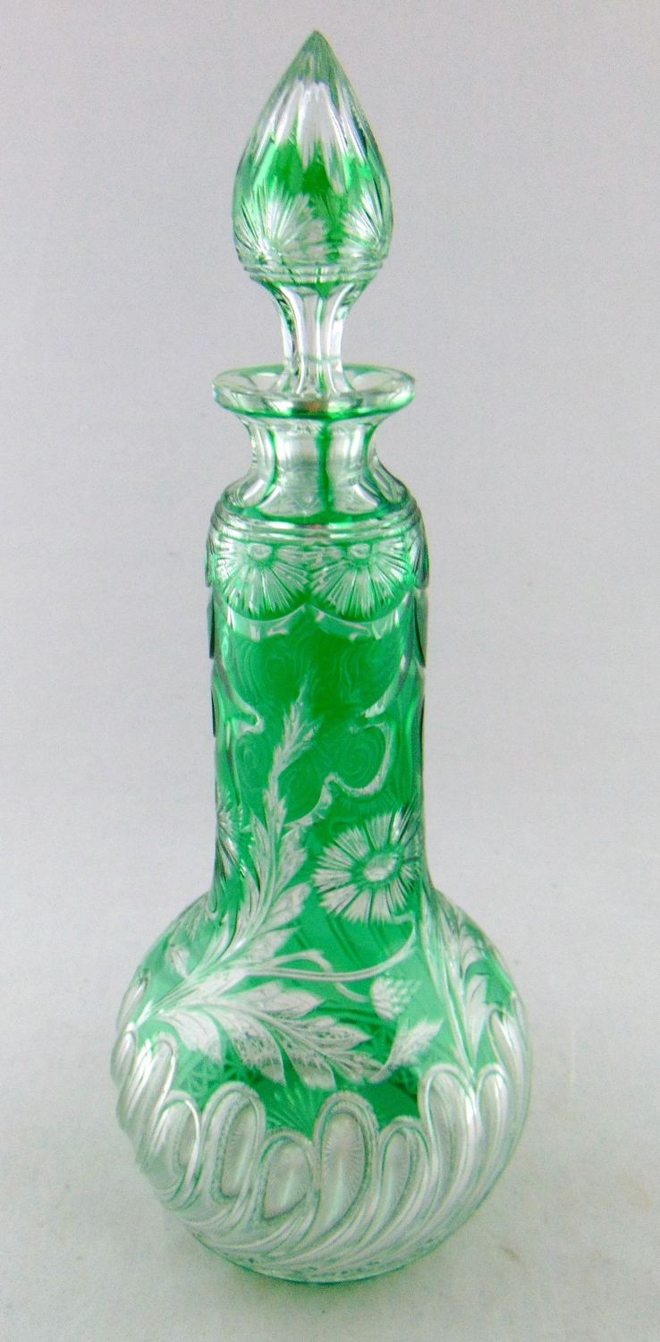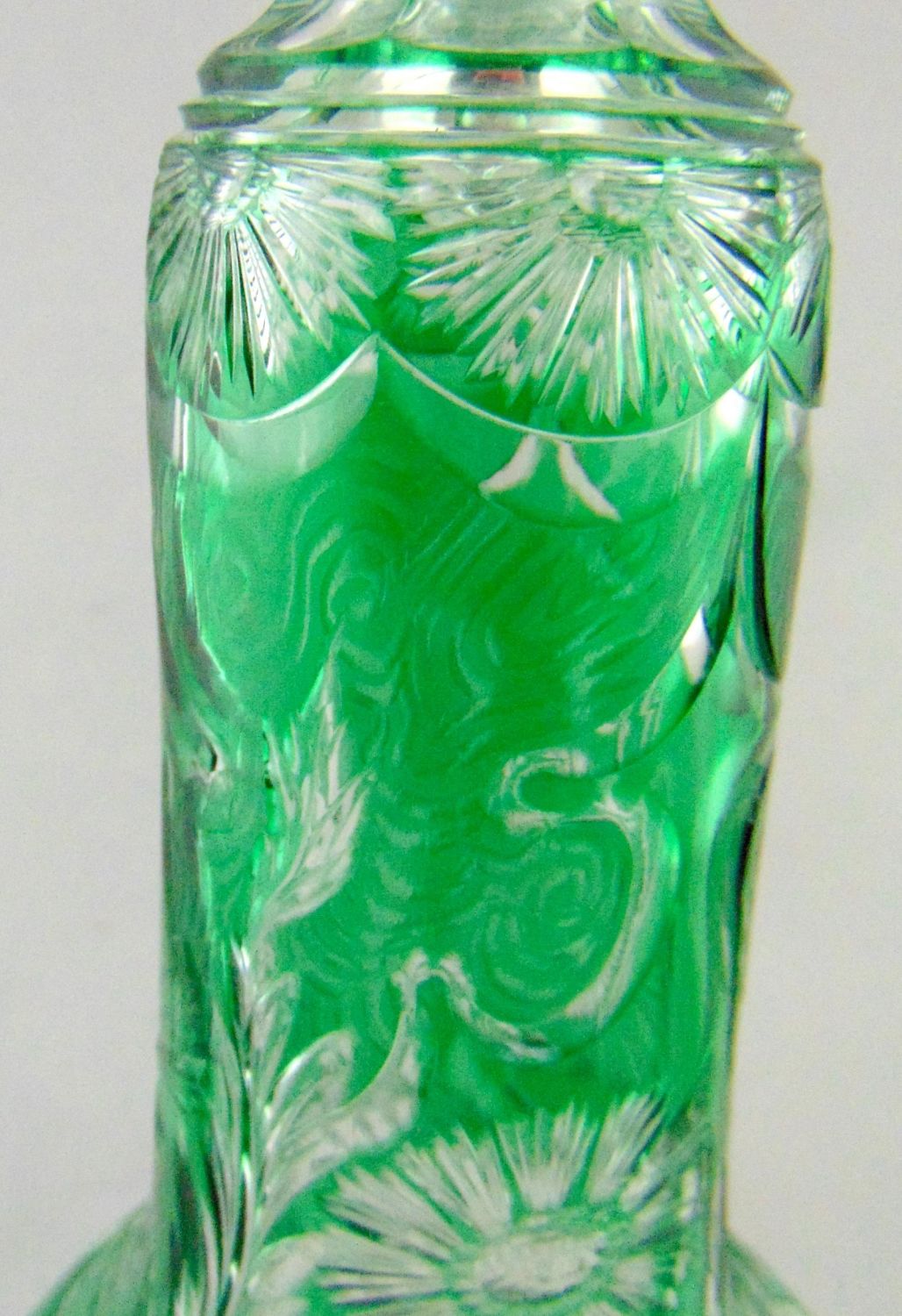 Stevens and Williams cut glass decanter in green to clear with finger and leafy stemmed flowers, very rare acid scrolling in the green panels, matching sun burst stopper, 13" ht. NOTE: cut glass inherently has minor imperfections these are not noted and visual damage we have attempted to note. Condition: good with no defect found