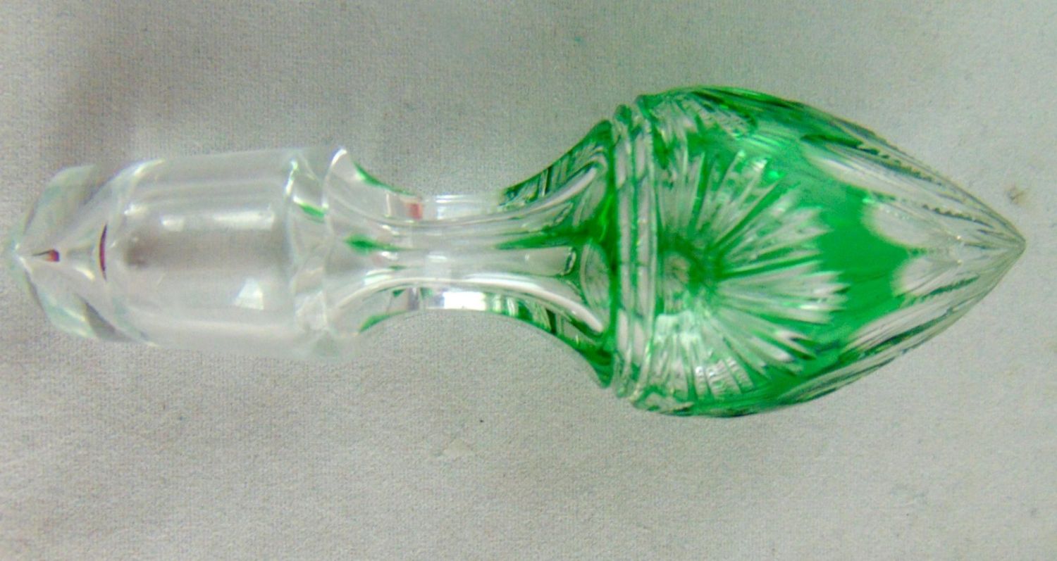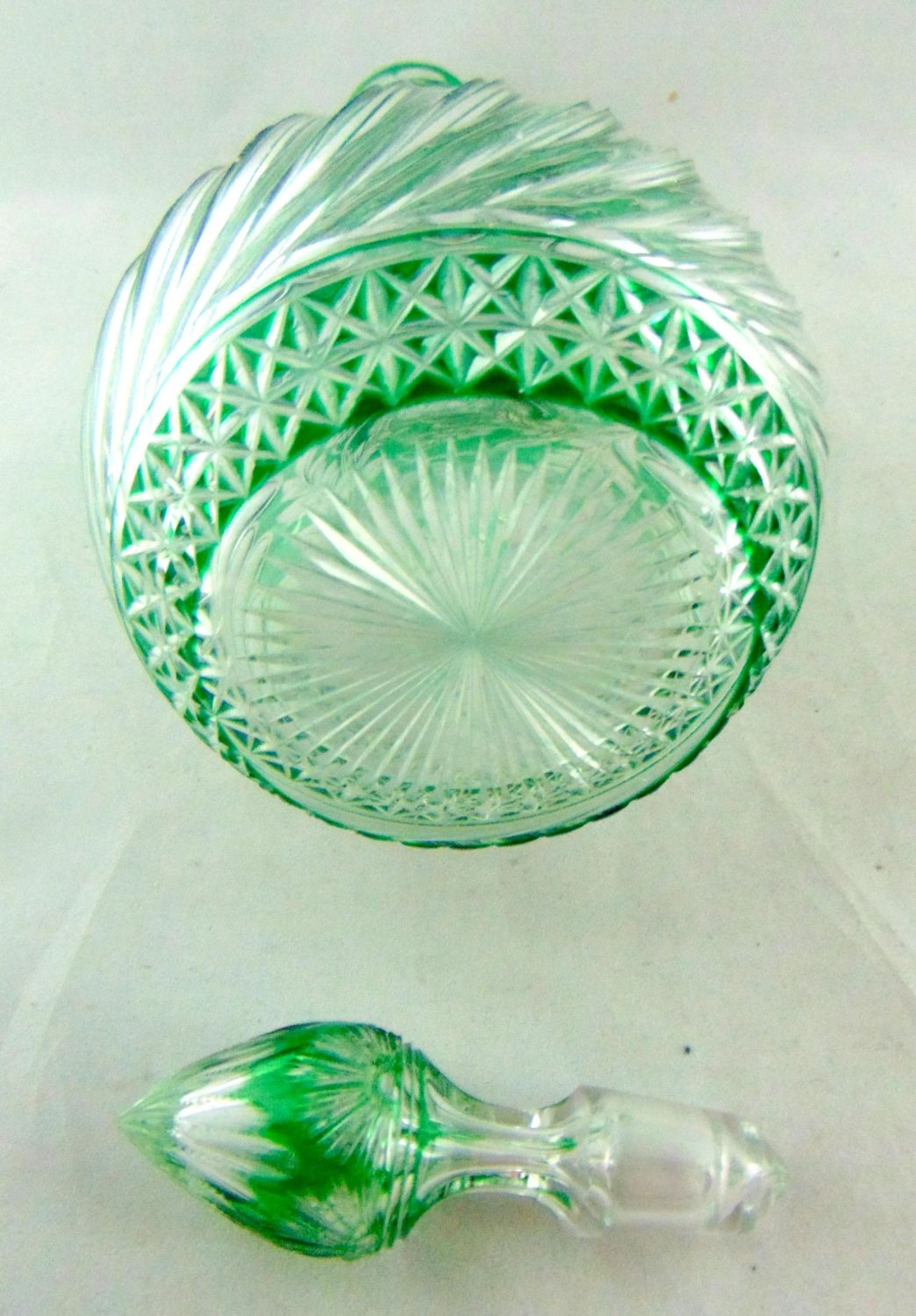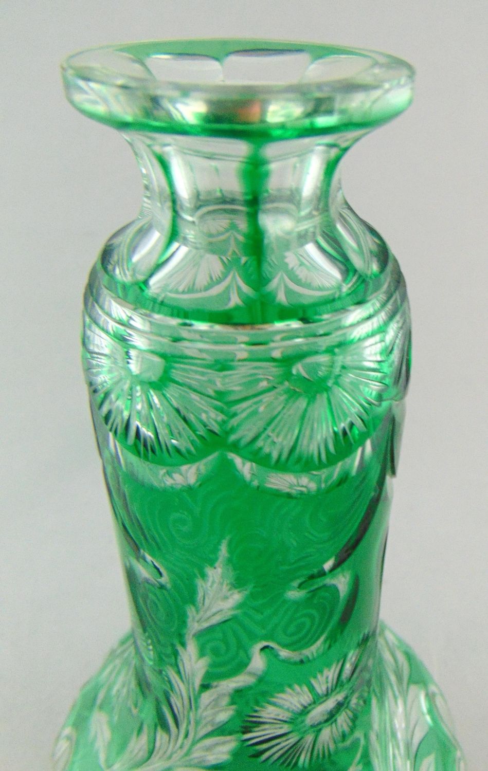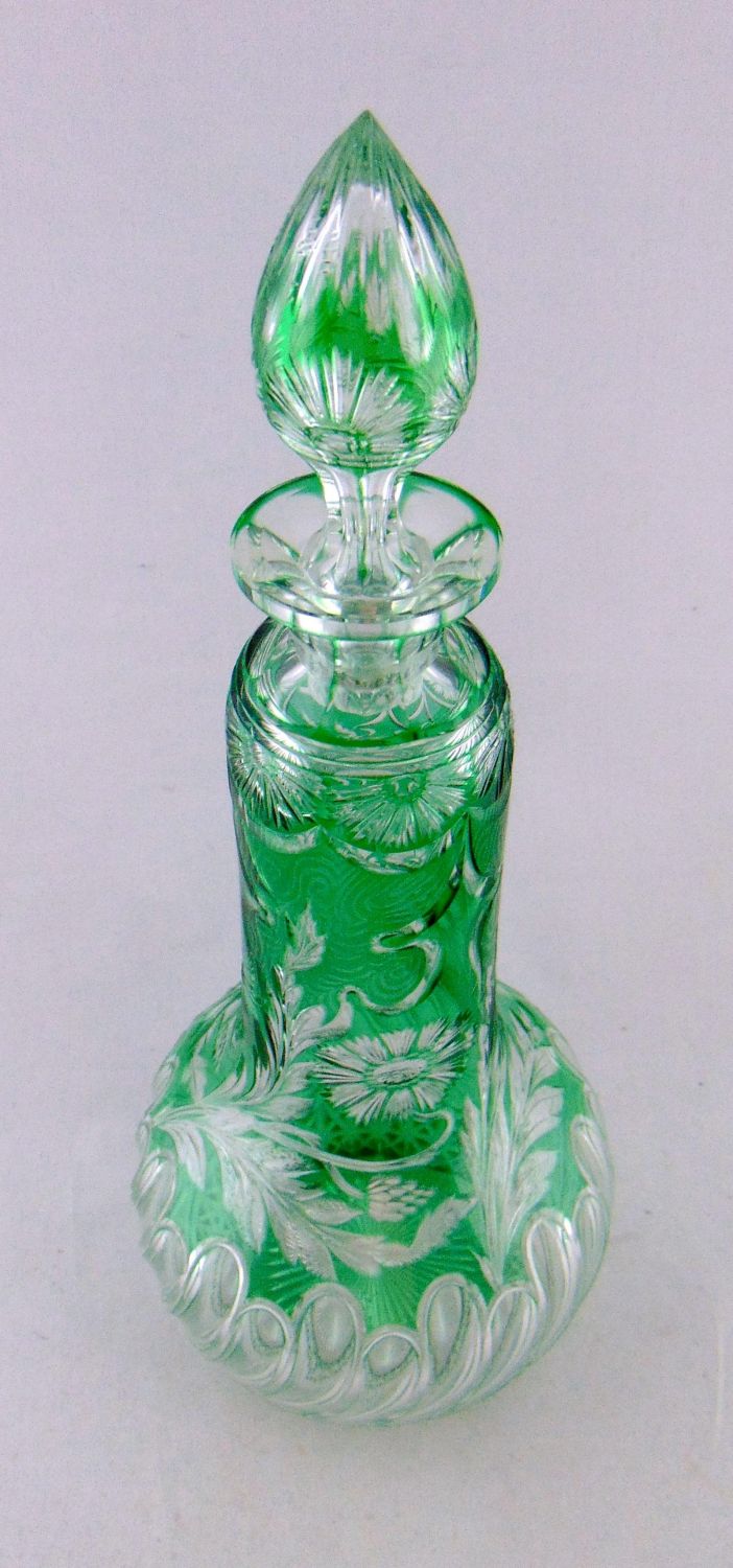 Stevens and Williams cut glass decanter in green to clear with finger and leafy stemmed flowers, very rare acid scrolling in the green panels, matching sun burst stopper, 13" ht. NOTE: cut glass inherently has minor imperfections these are not noted and visual damage we have attempted to note. Condition: good with no defect found