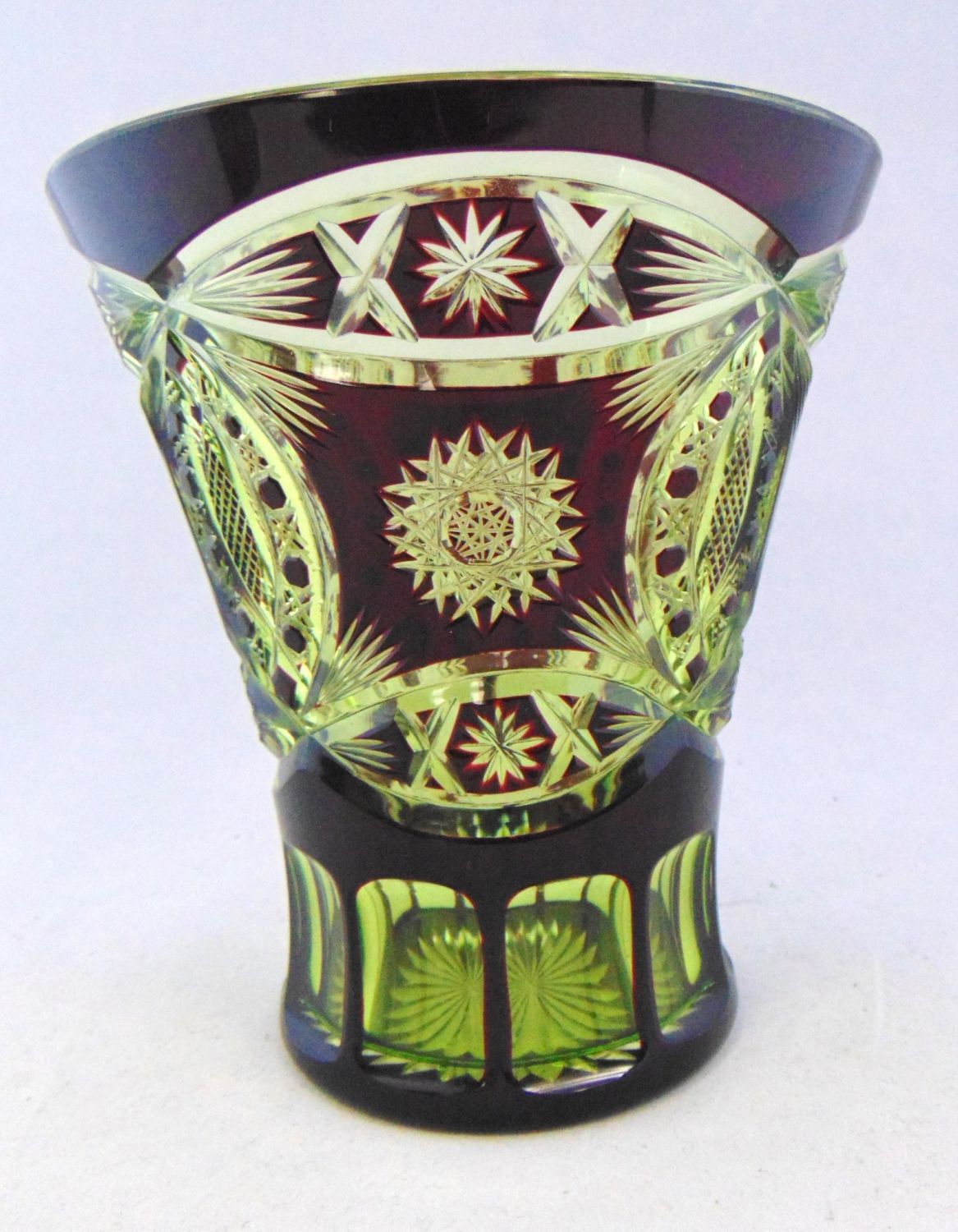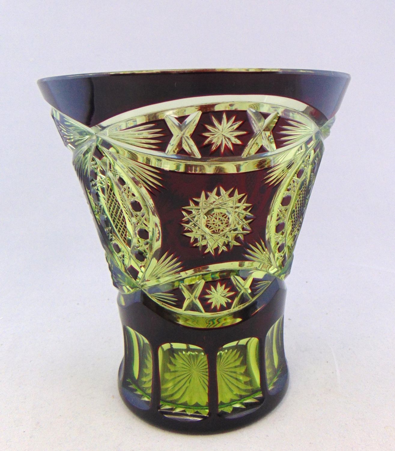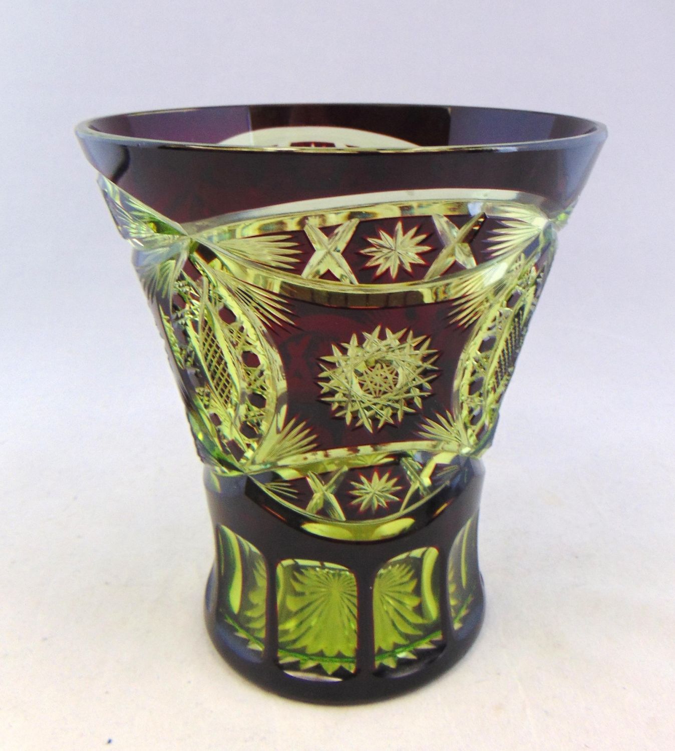 Wide trumpet form in ruby cut to yellow, 6″ ht. Condition: good with no defects found.