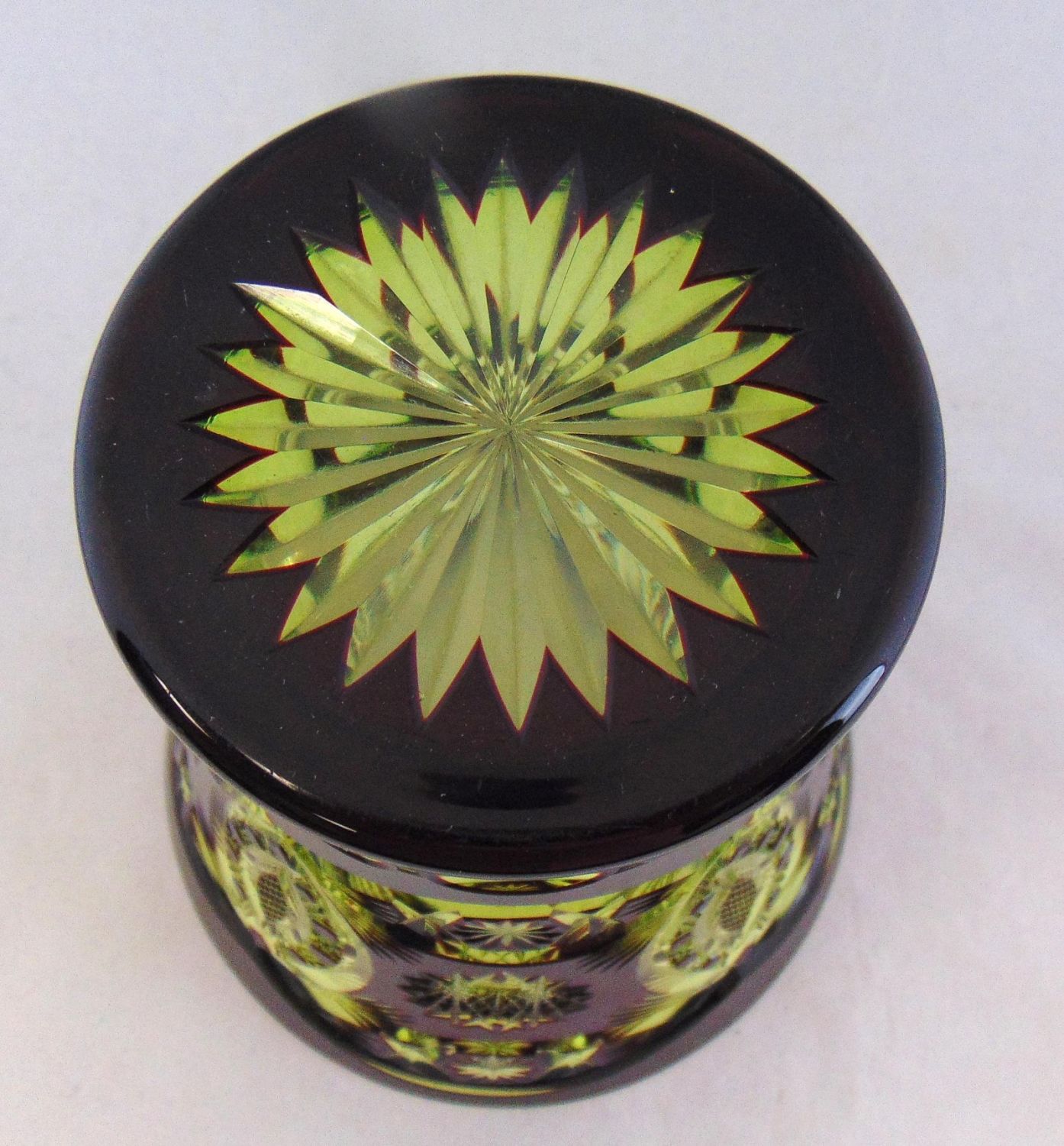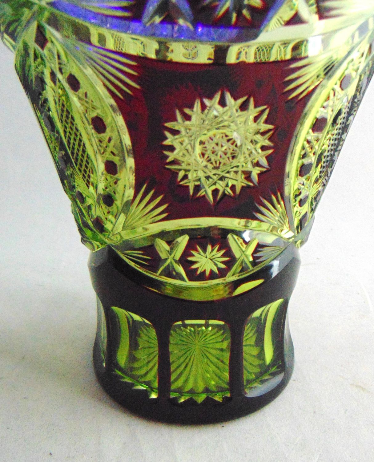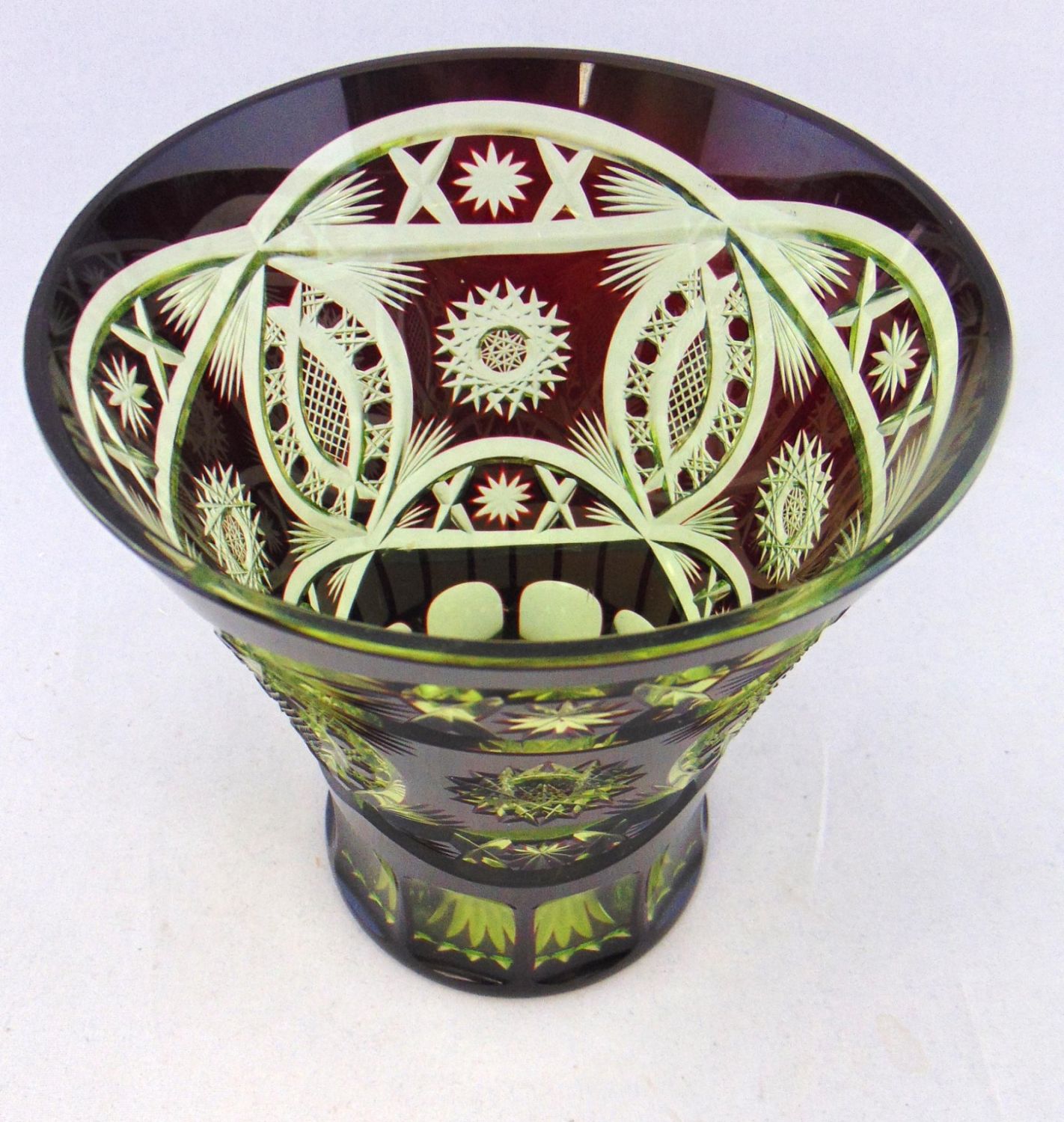 Wide trumpet form in ruby cut to yellow, 6″ ht. Condition: good with no defects found.
