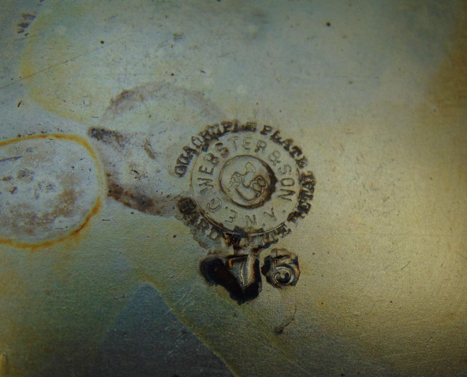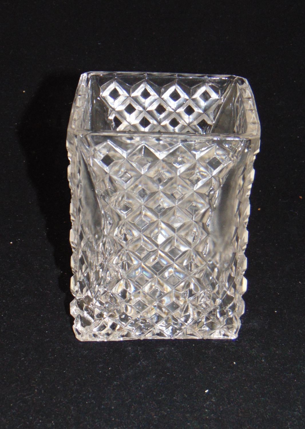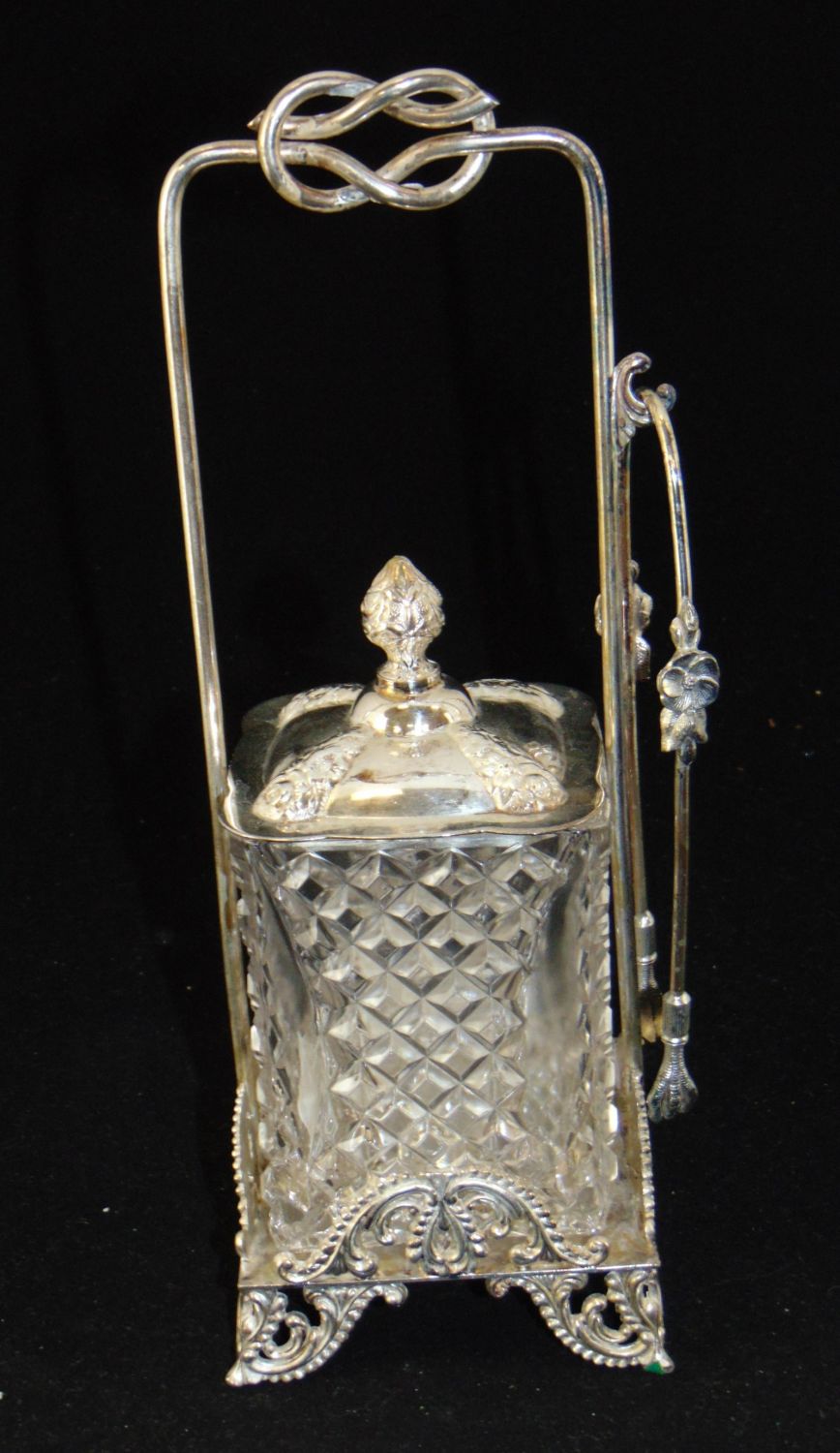 Rectangular form block cut glass jar set in a marked Webster caddy, 11" ht. Condition: good with no defects found.
