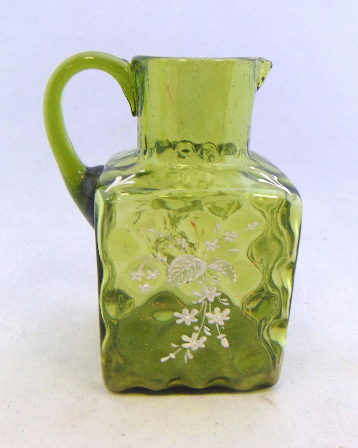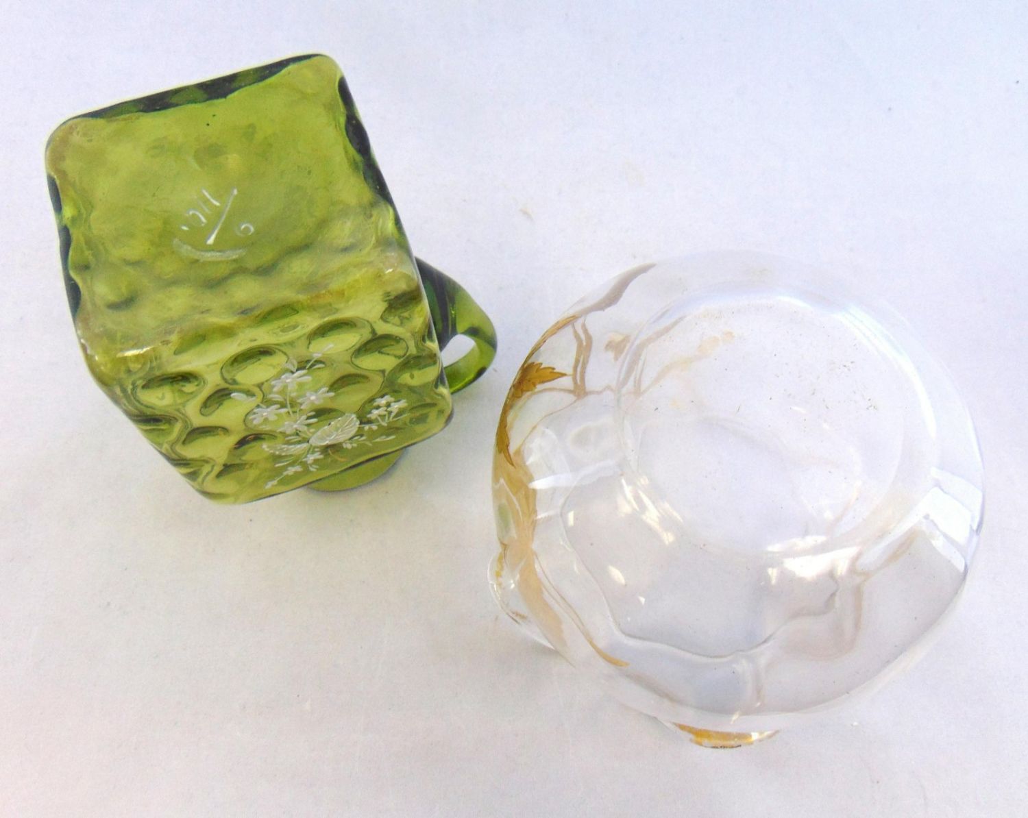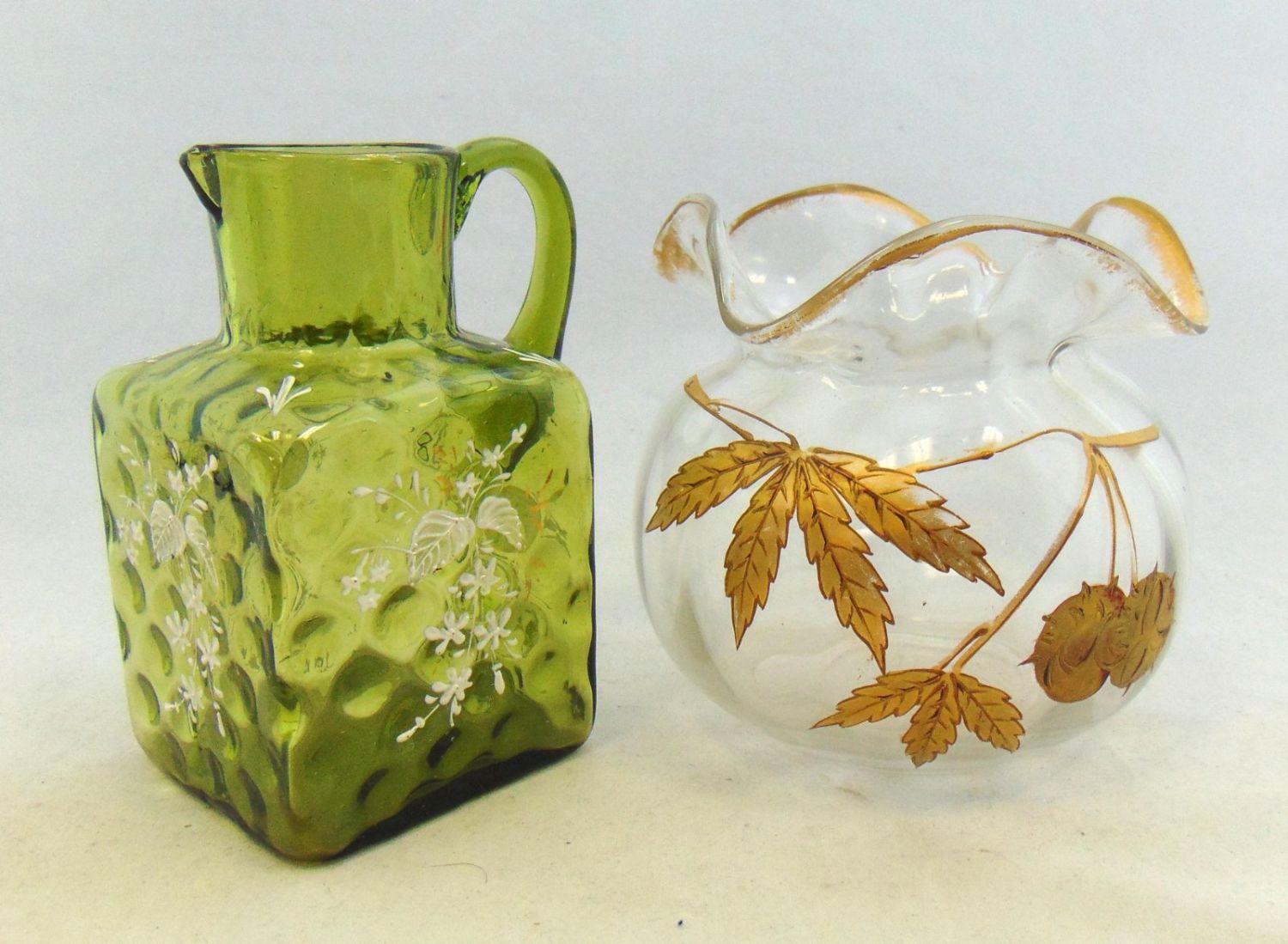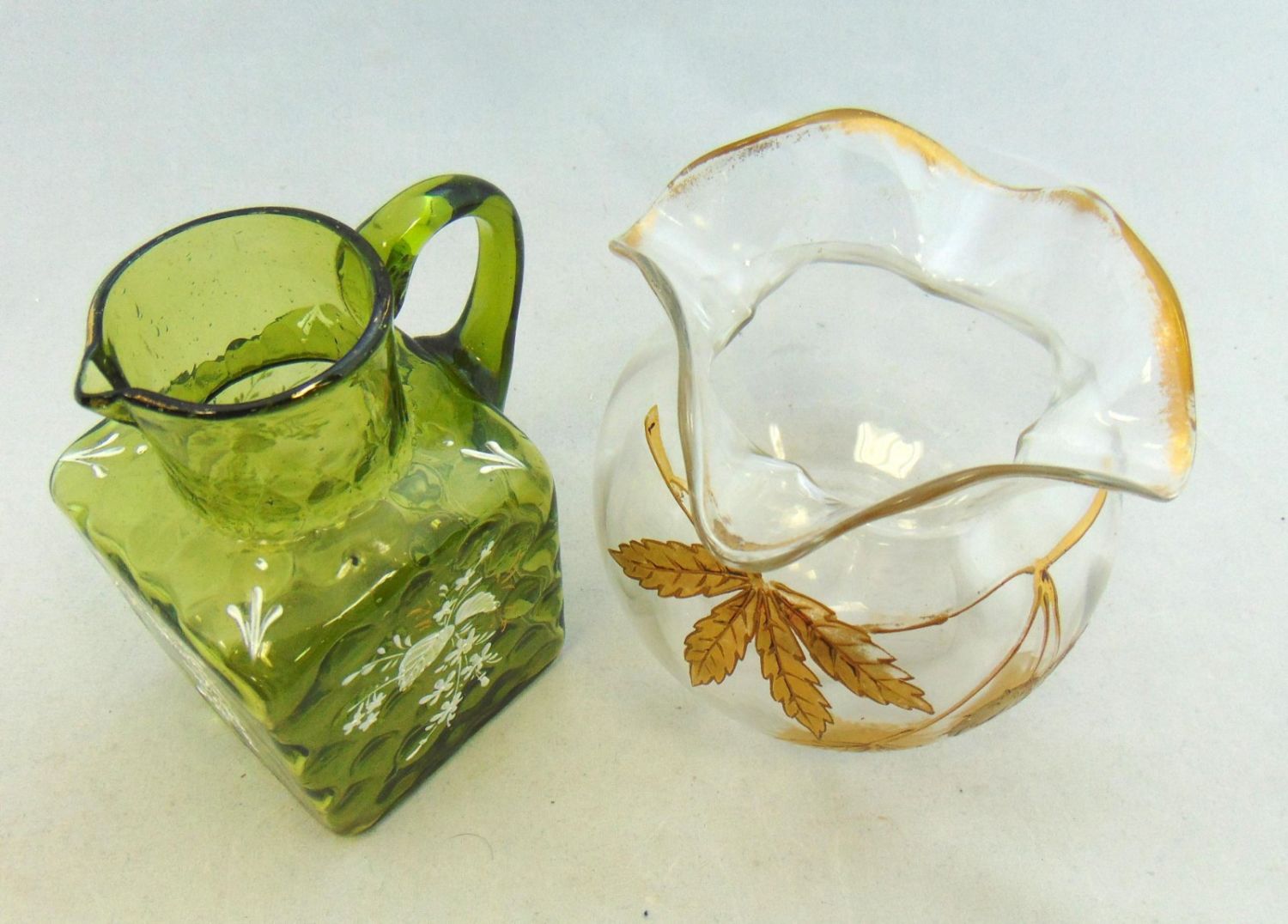 Including a green coin spot pitcher with white flowers together with a optic ribbed clear rose bowl with gold enameled chestnuts, tallest 5 1/4" ht. Condition: good with no defects found.