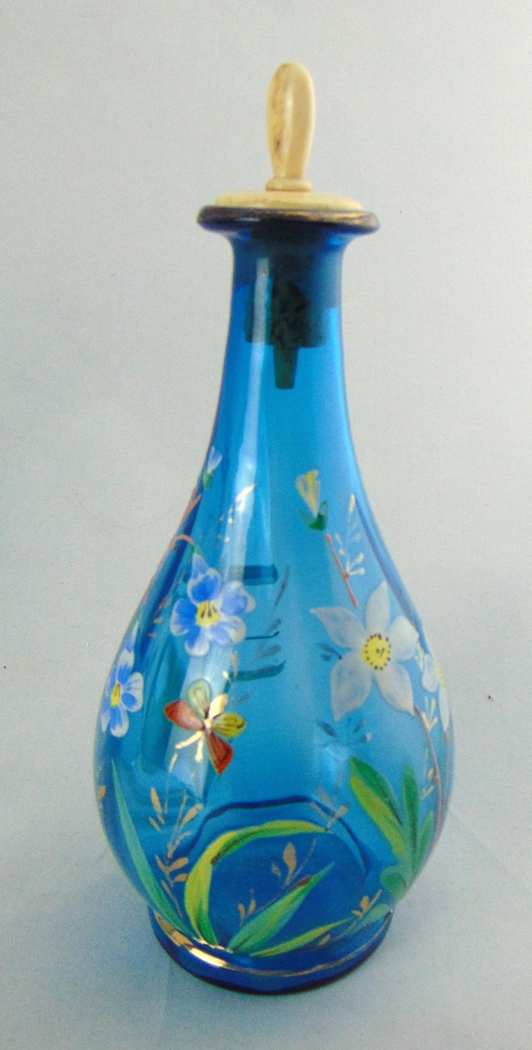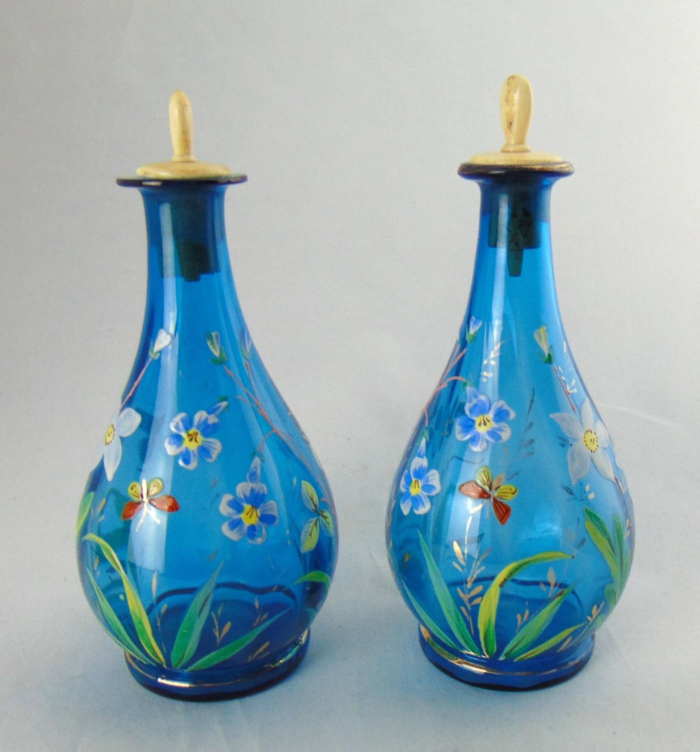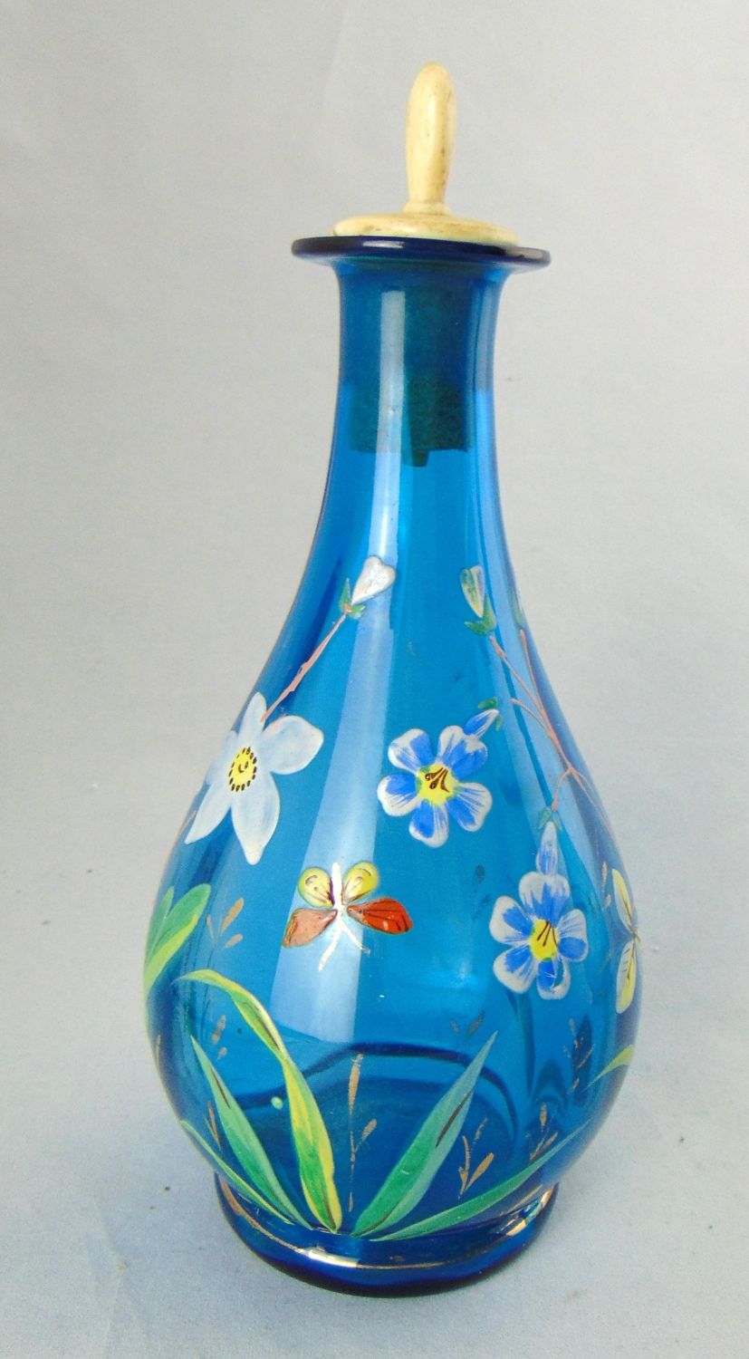 Bulbous form in translucent blue glass decorated with enameled flowers fitted with bone stoppers, 8" ht. Condition: good with no defects found.