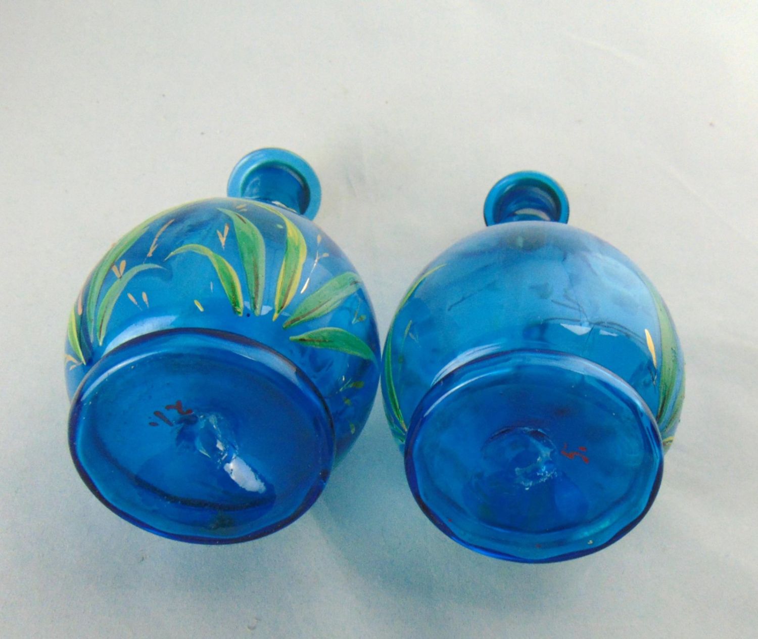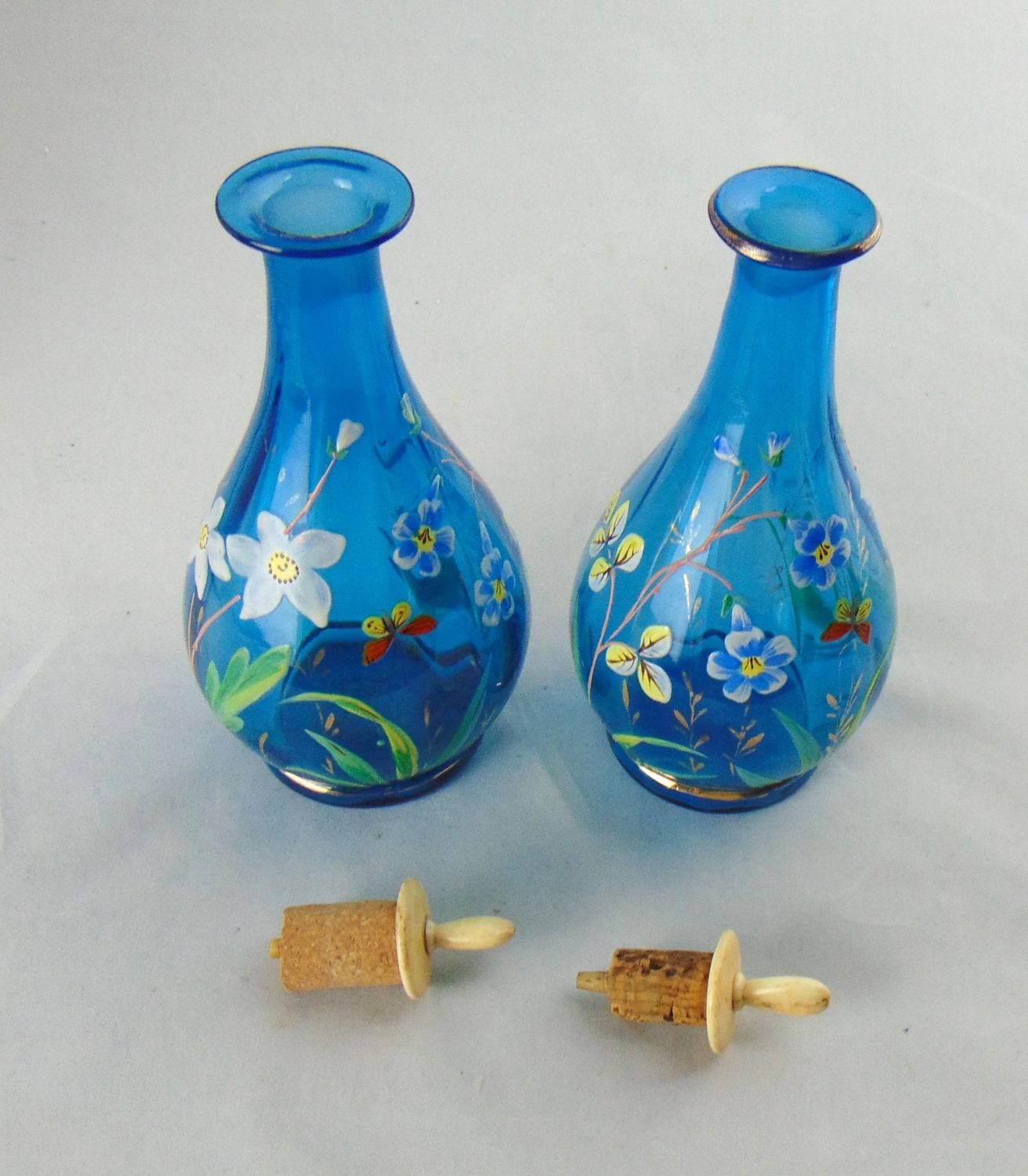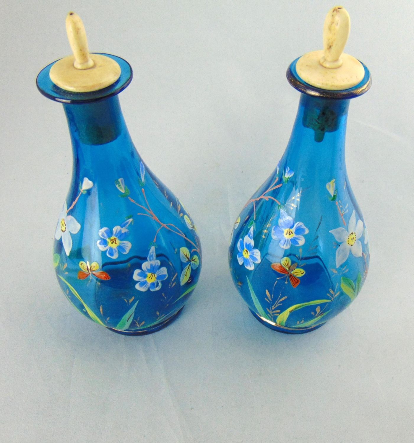 Bulbous form in translucent blue glass decorated with enameled flowers fitted with bone stoppers, 8" ht. Condition: good with no defects found.