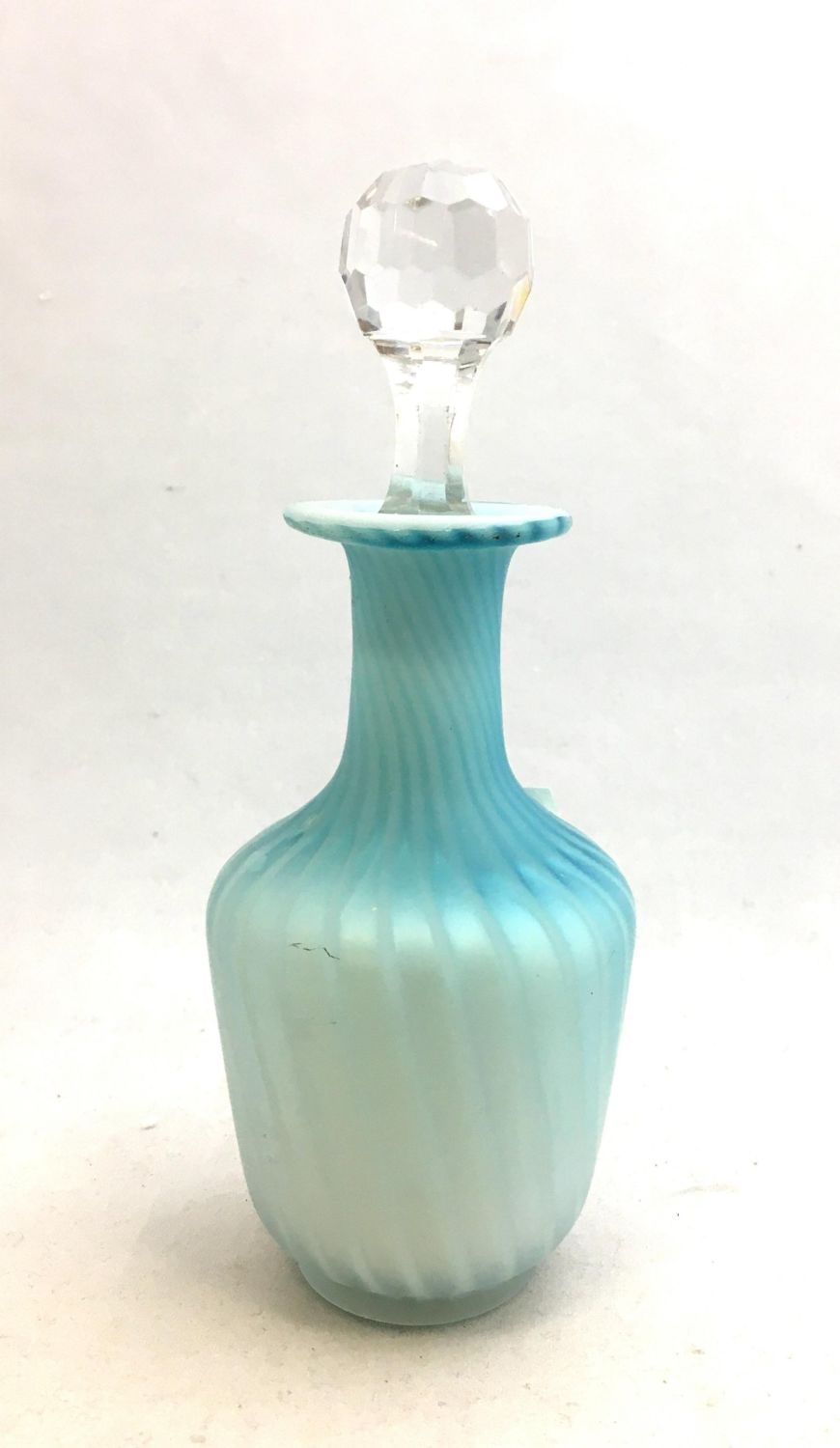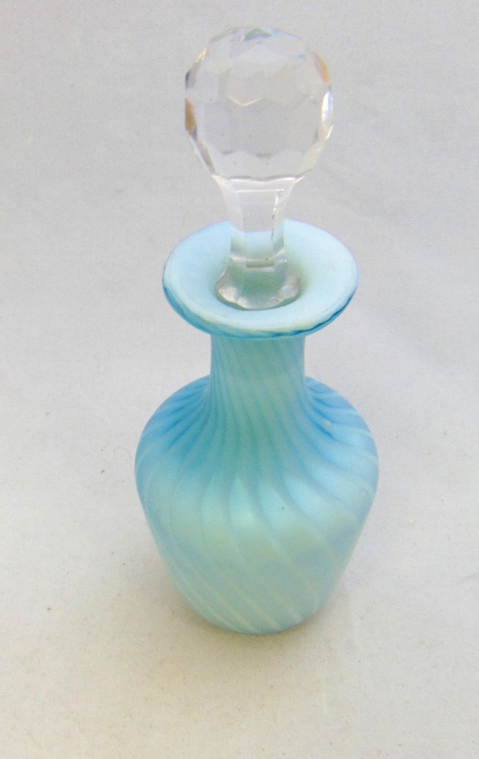 Blue Mother of Pearl glass bottle in a swirl pattern fitted with a faceted stopper, 7" ht. Condition: good with no defects found.