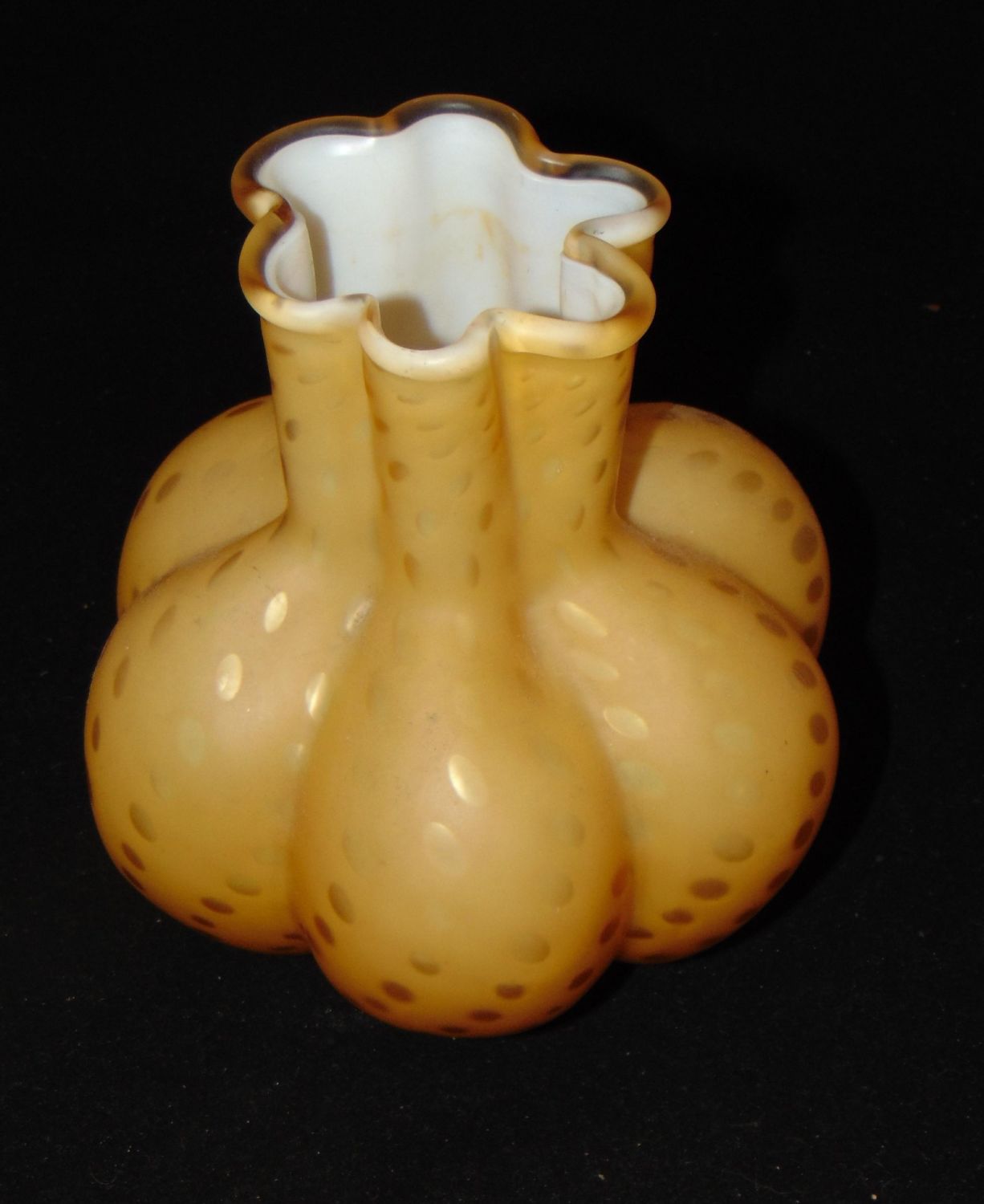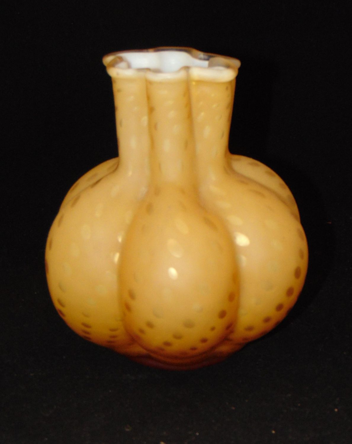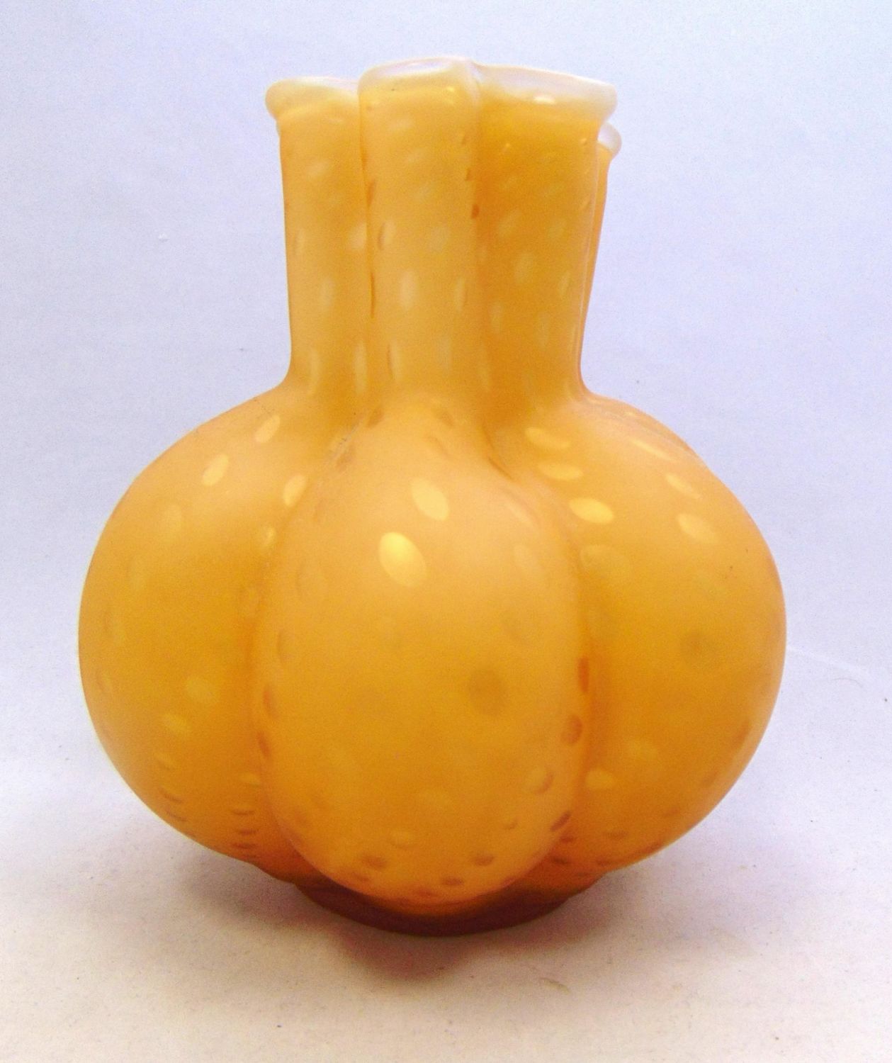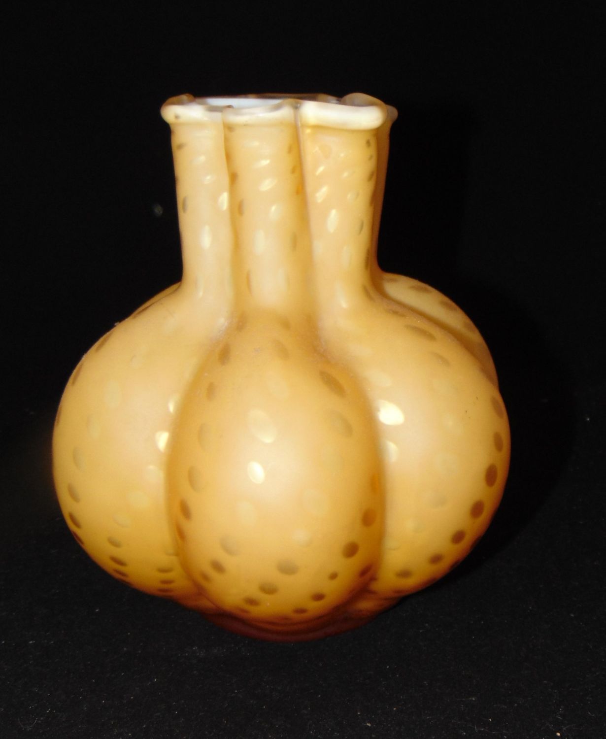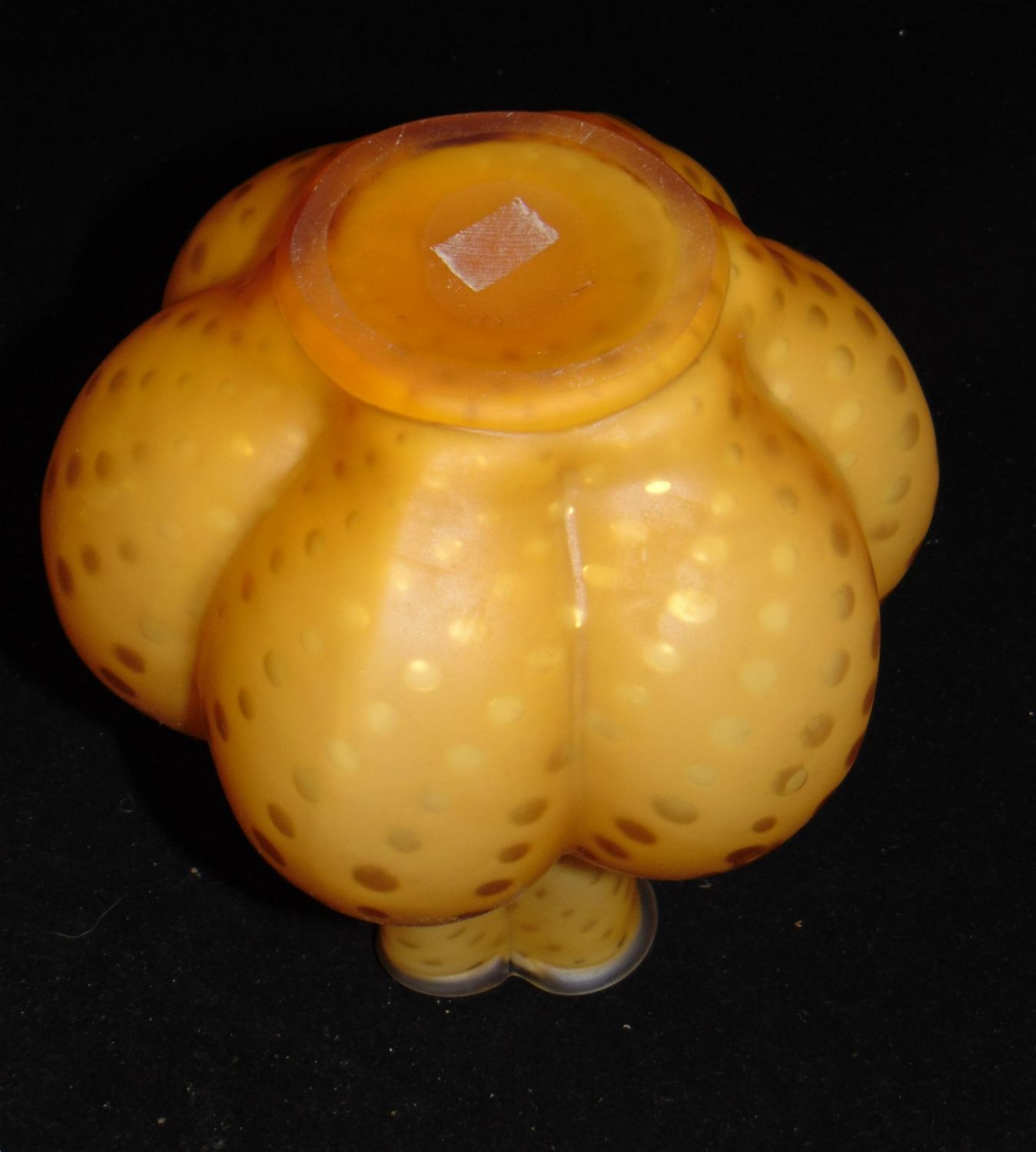Ovoid melon ribbed form in amber glass decorated with the raindrop pattern, 7 1/2" ht. Condition: good with no defects found.