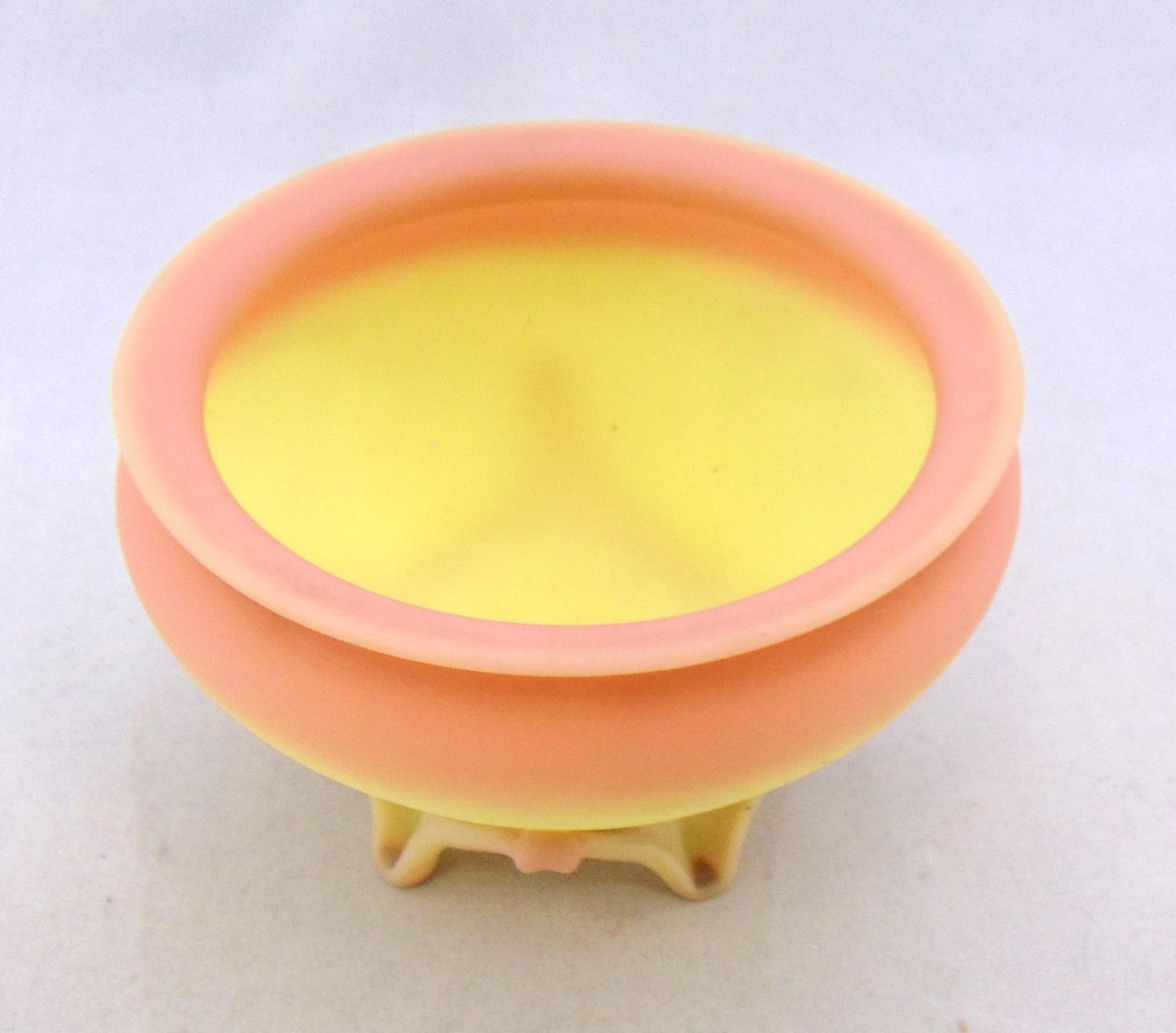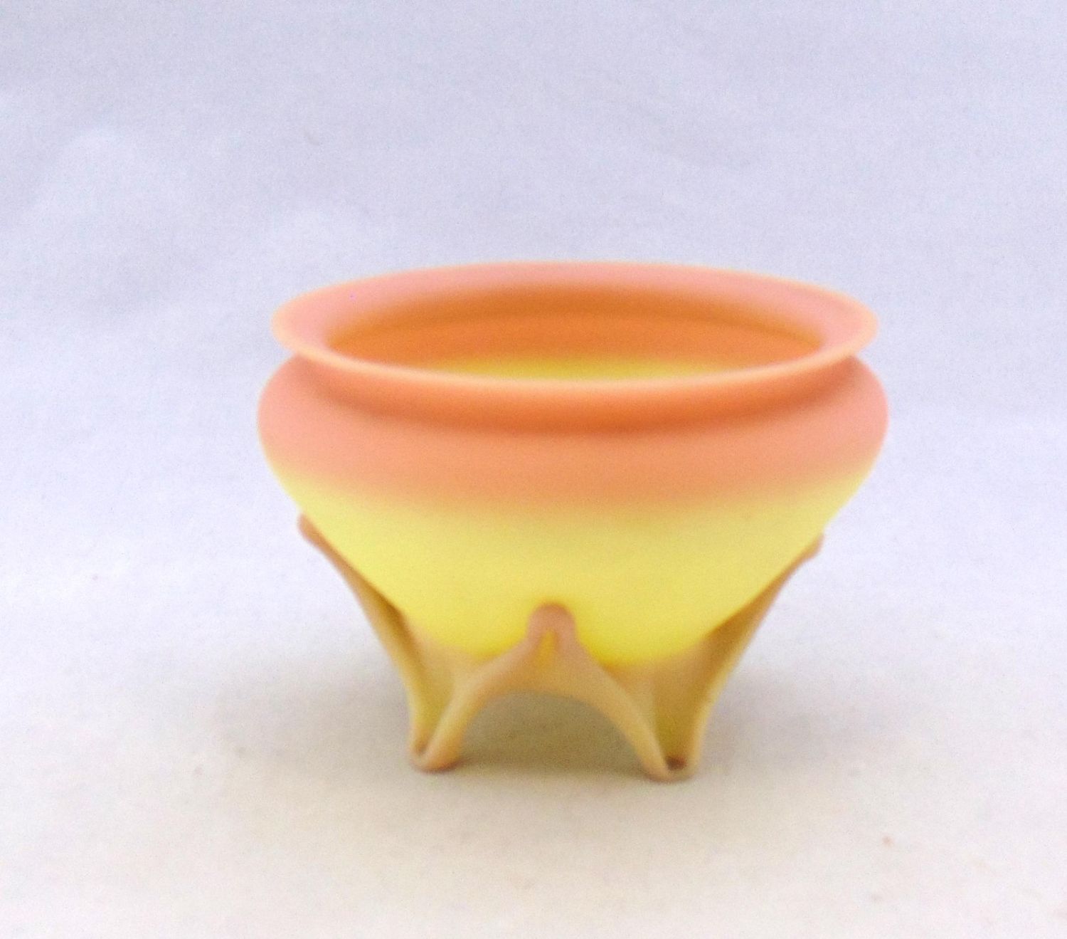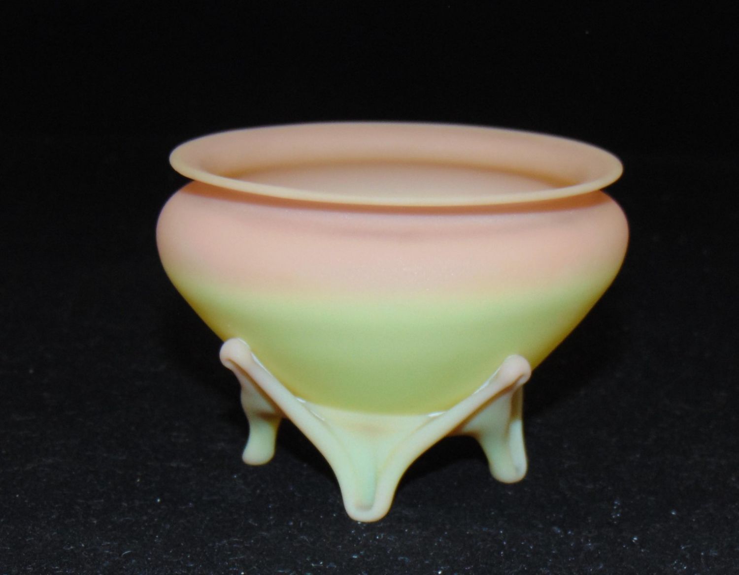 Mt. Washington Burmese sugar bowl with wishbone feet and applied raspberry punt, 3 1/2" wide. PROVENANCE: Earlys Auction. Condition: good with no defects found.