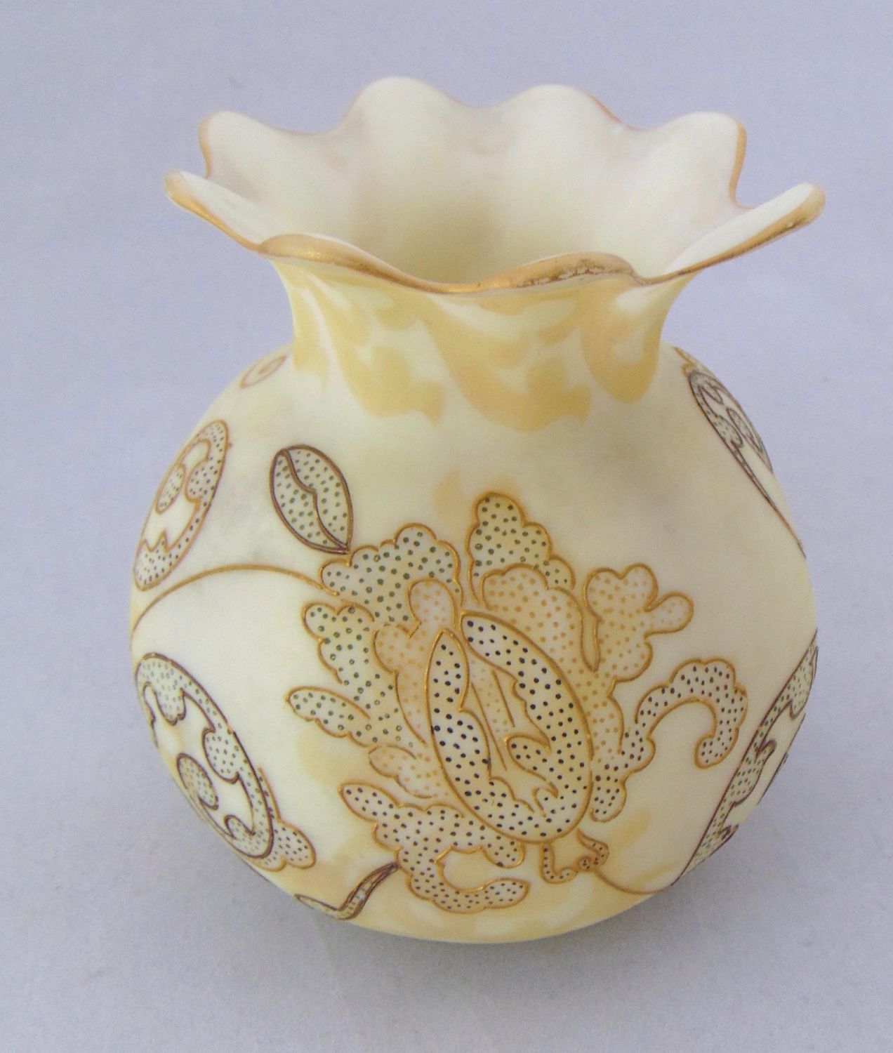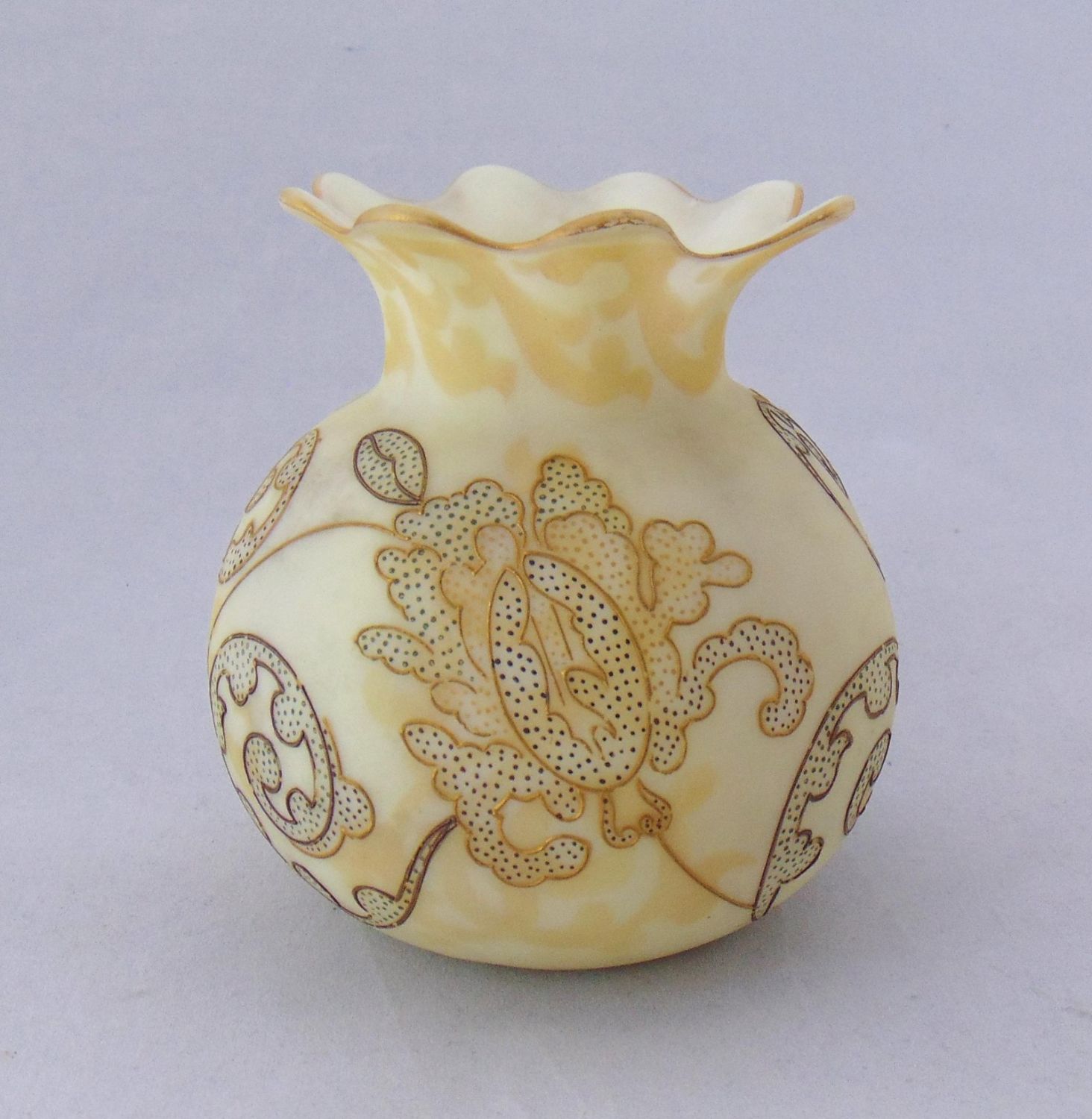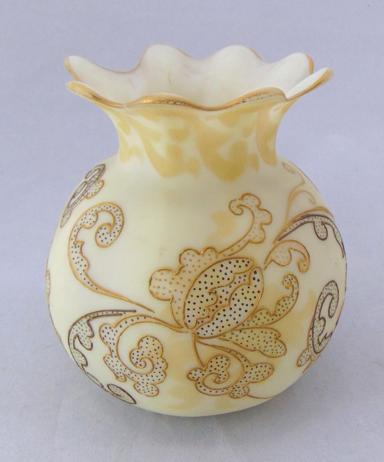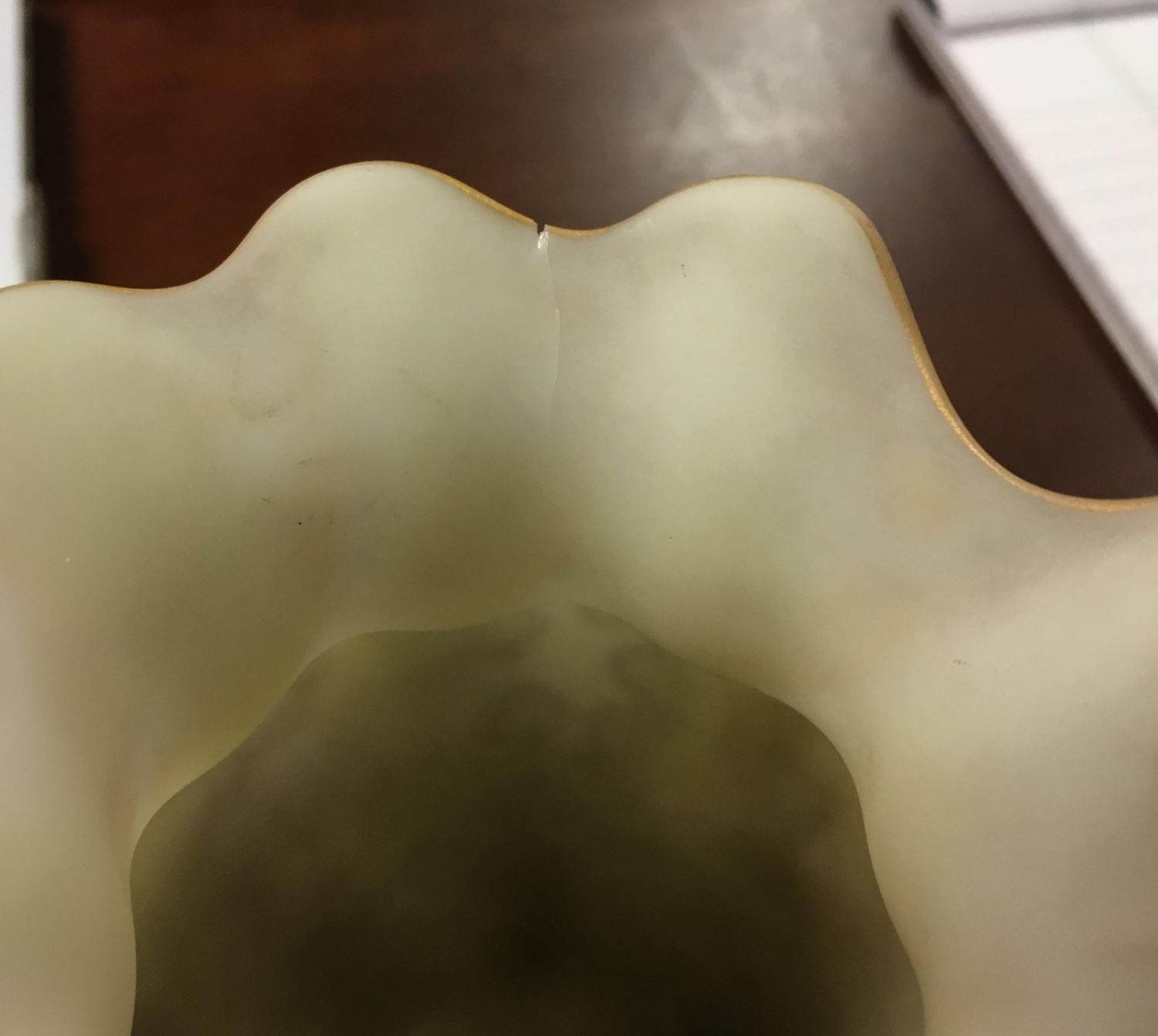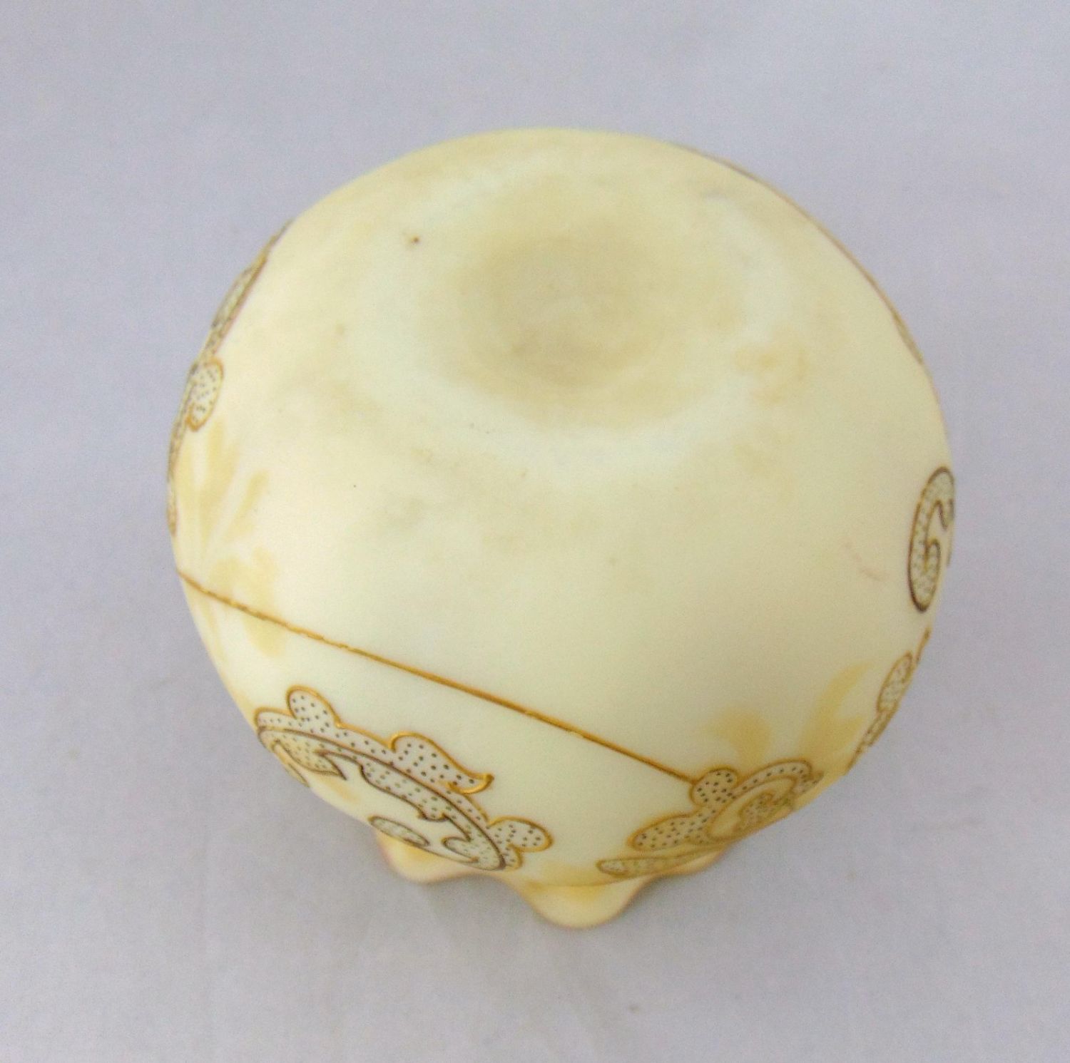 Ovoid form in cream colored glass decorated with a scrolling gold trimmed blue and red flower design in the pointillism dŽcor, 4 1/2" ht. Condition: rim crack