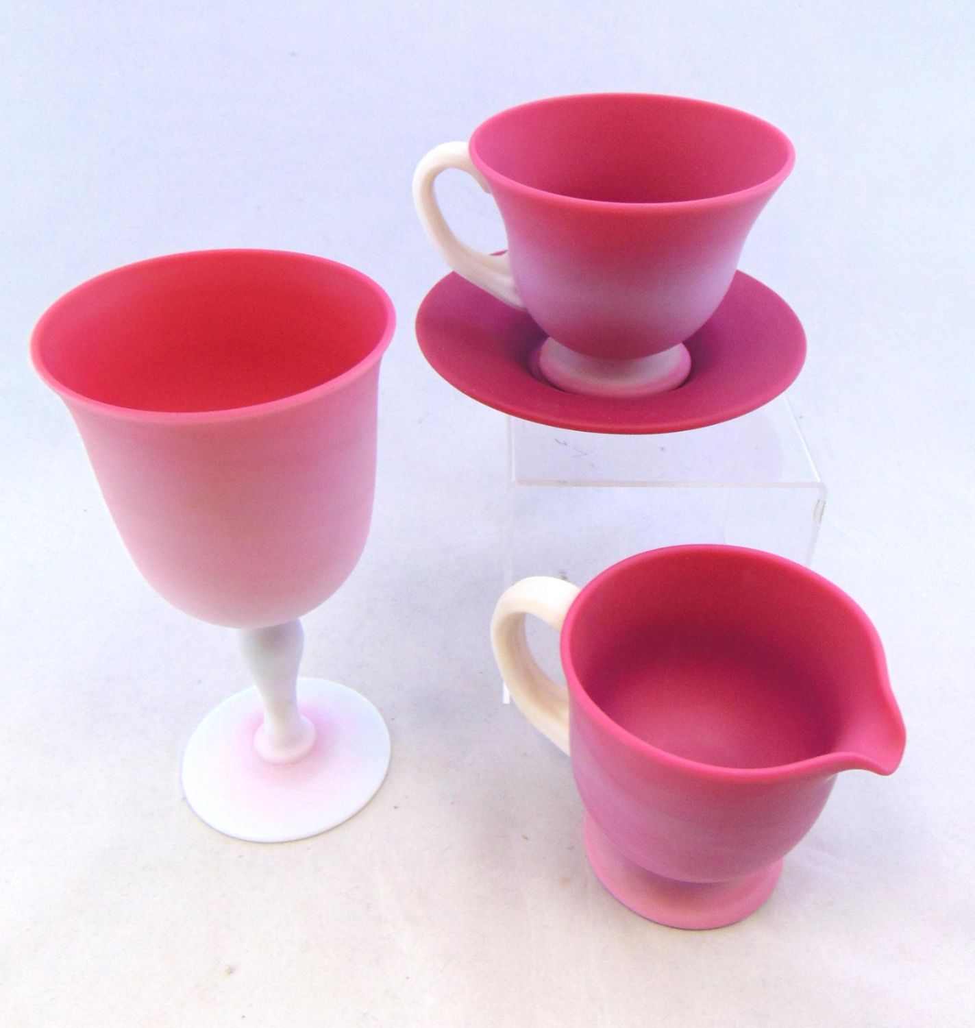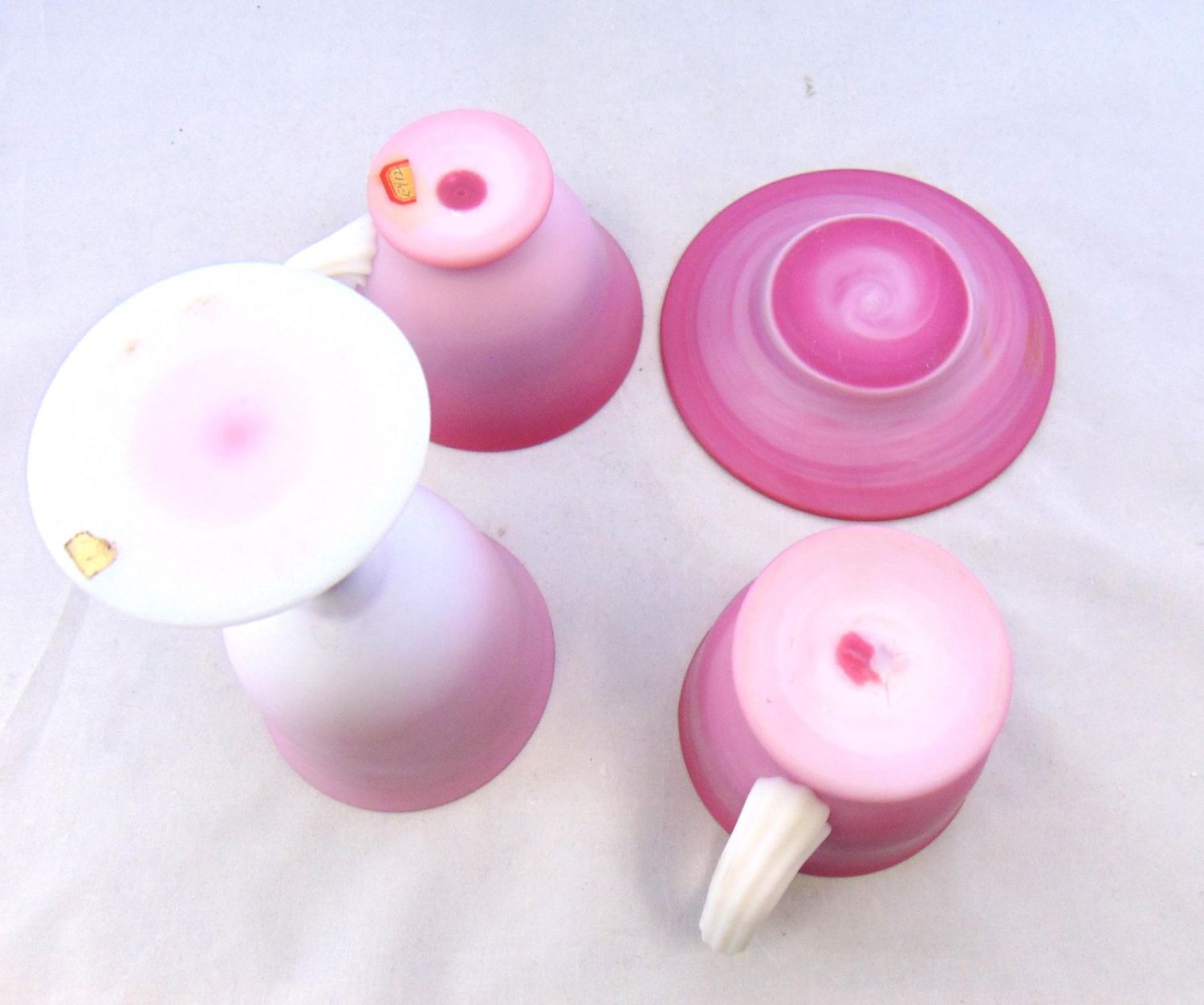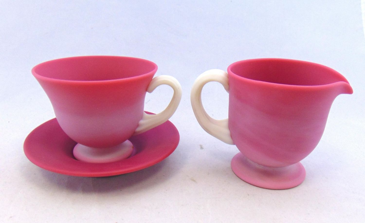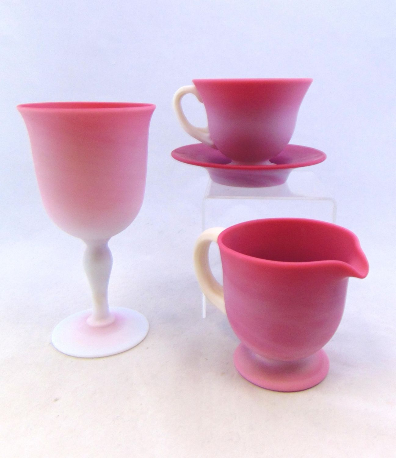 Three Gunderson Peachblow glass items including a creamer, goblet and a cup and saucer, tallest 6 3/4" ht. Condition: good with no defects found.