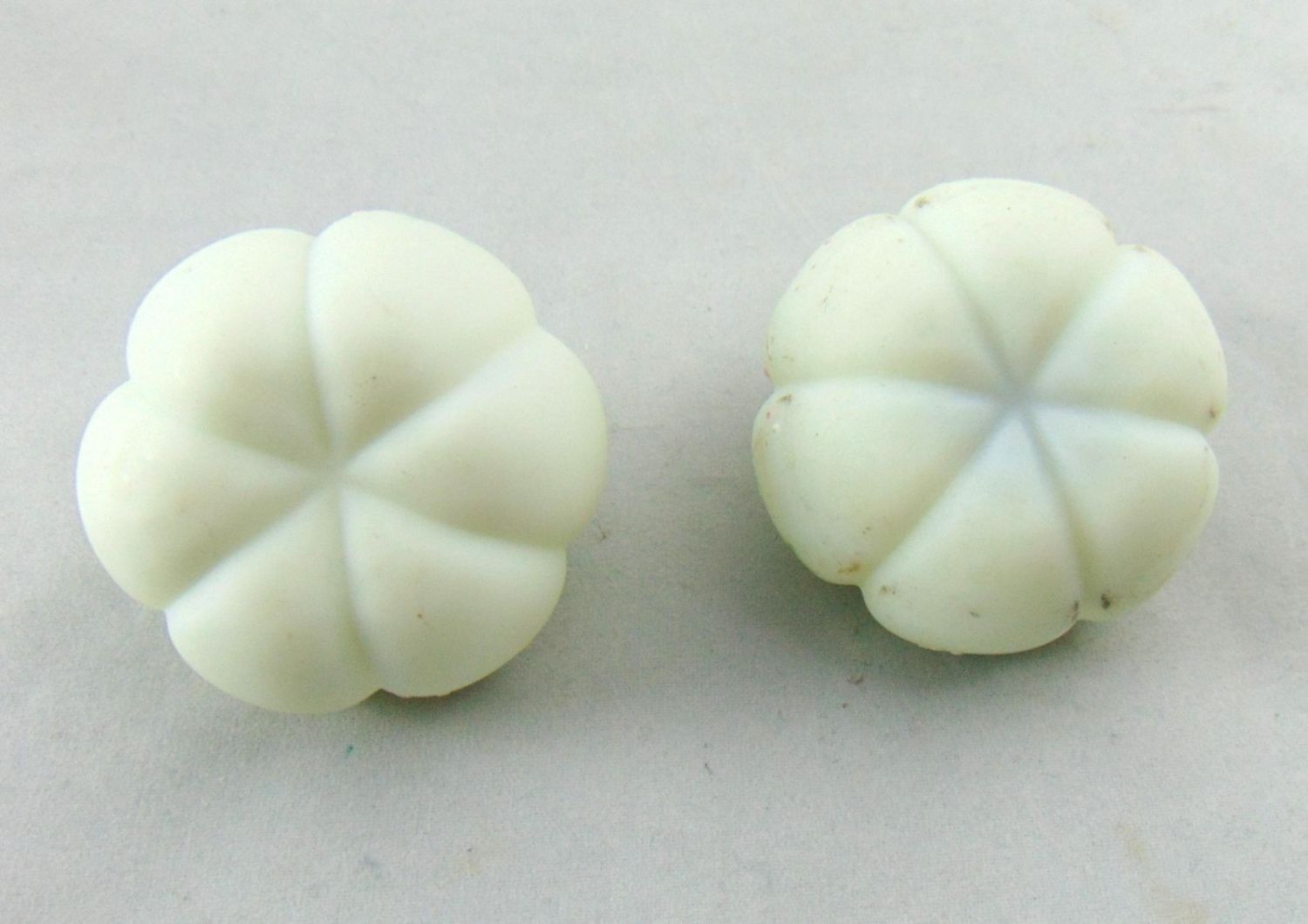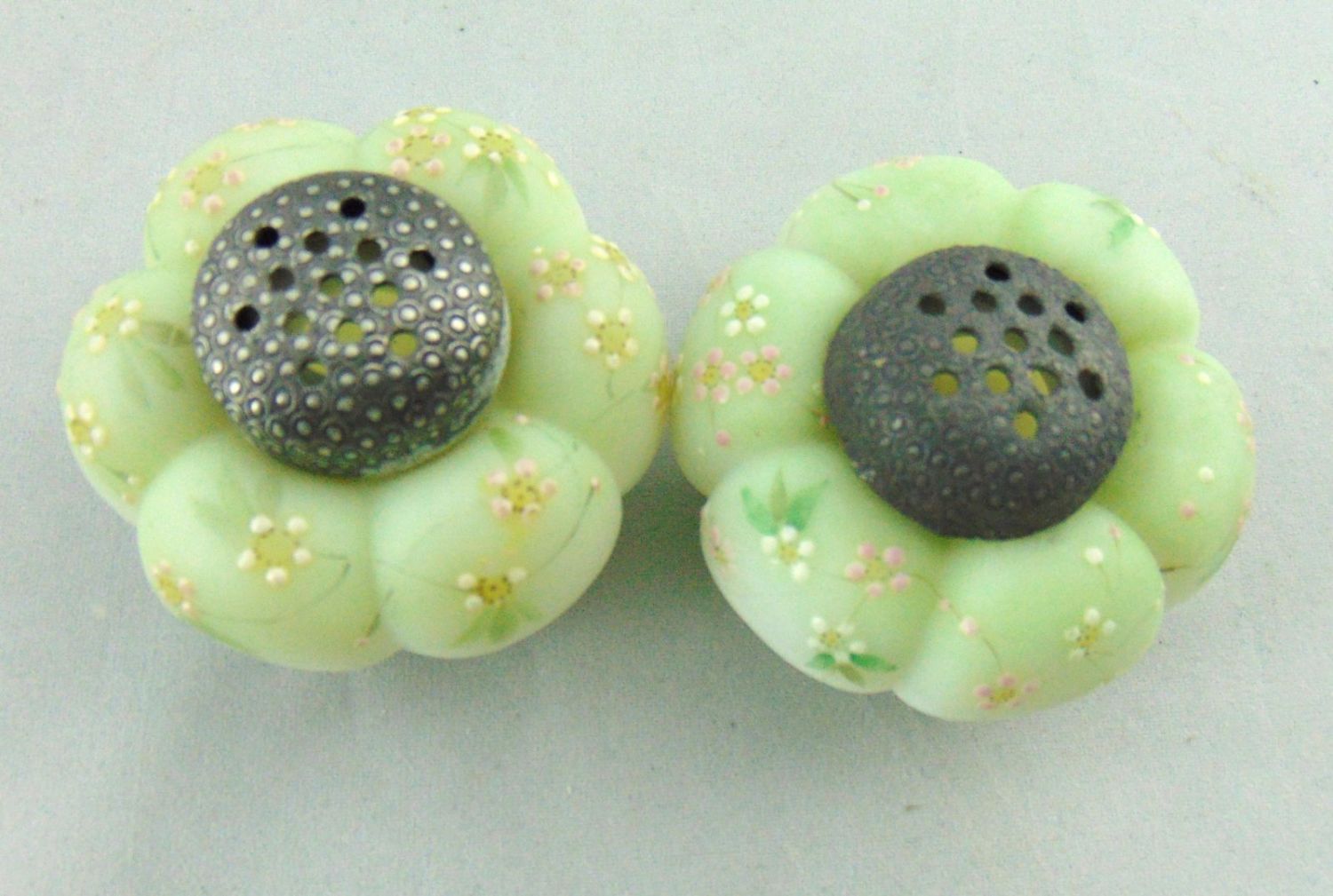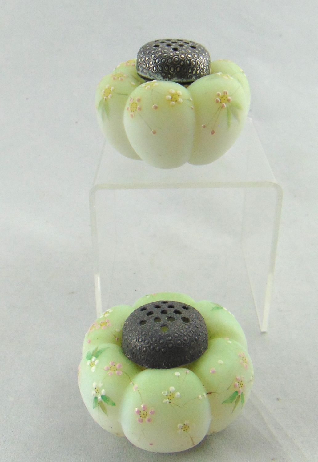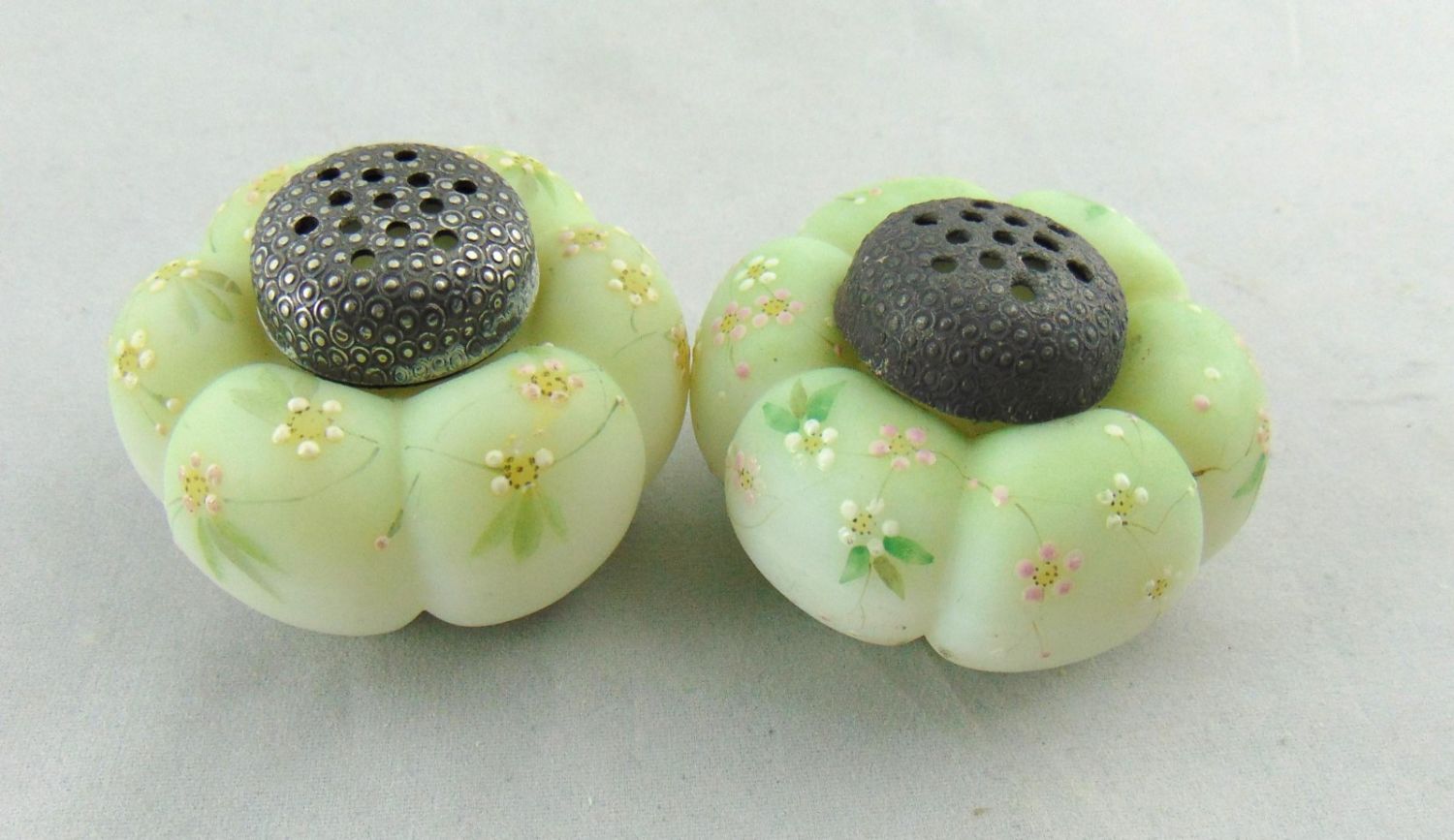 Mt. Washington tomato salt shakers in green glass with pink daisies, 2" wide. Condition: one top stuck one loose.
