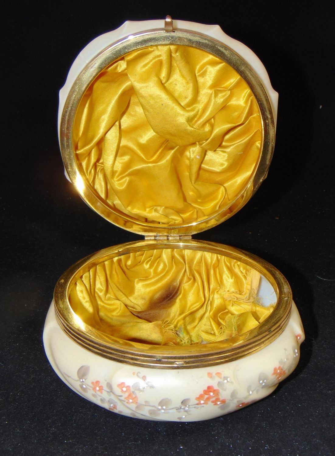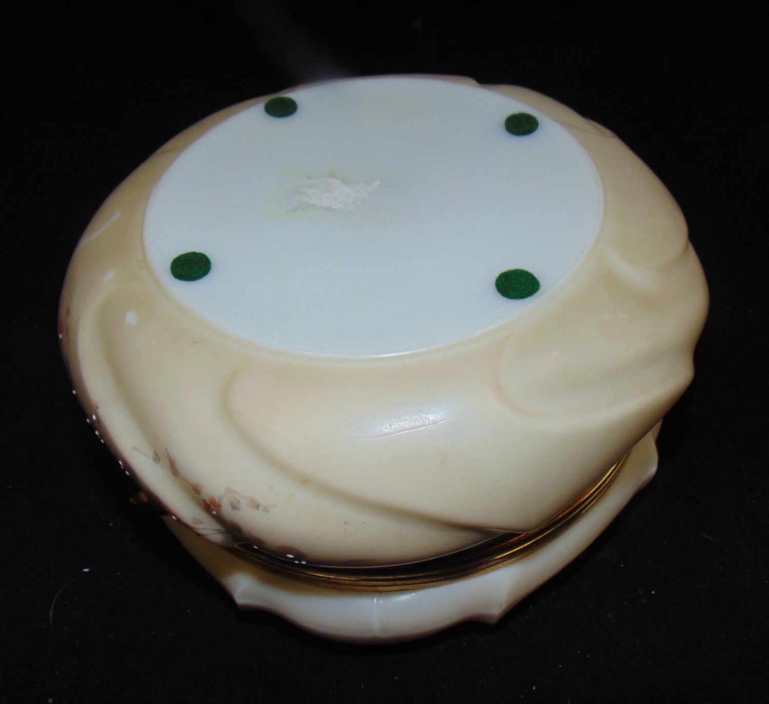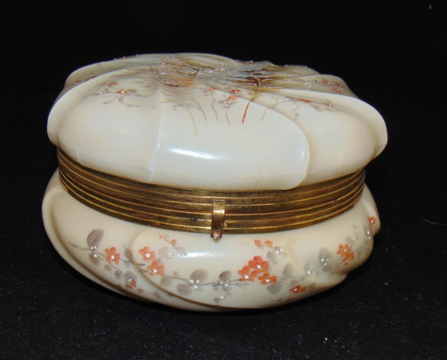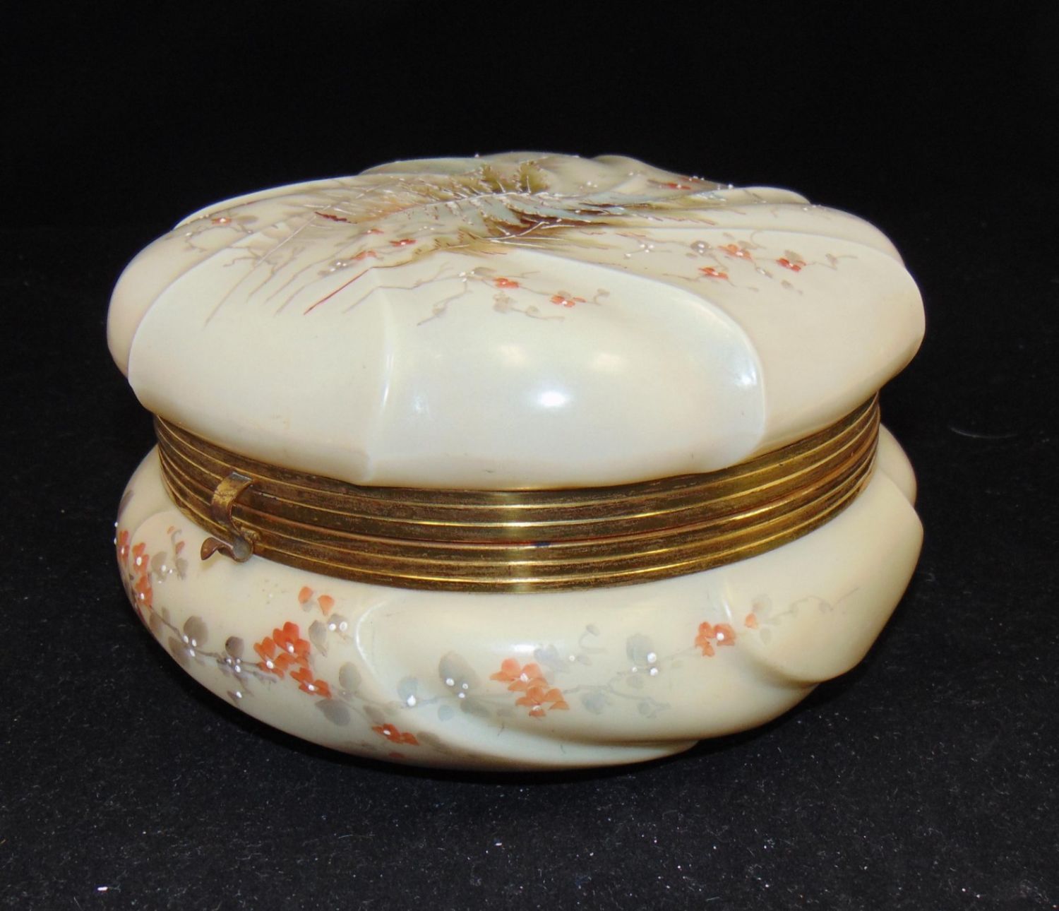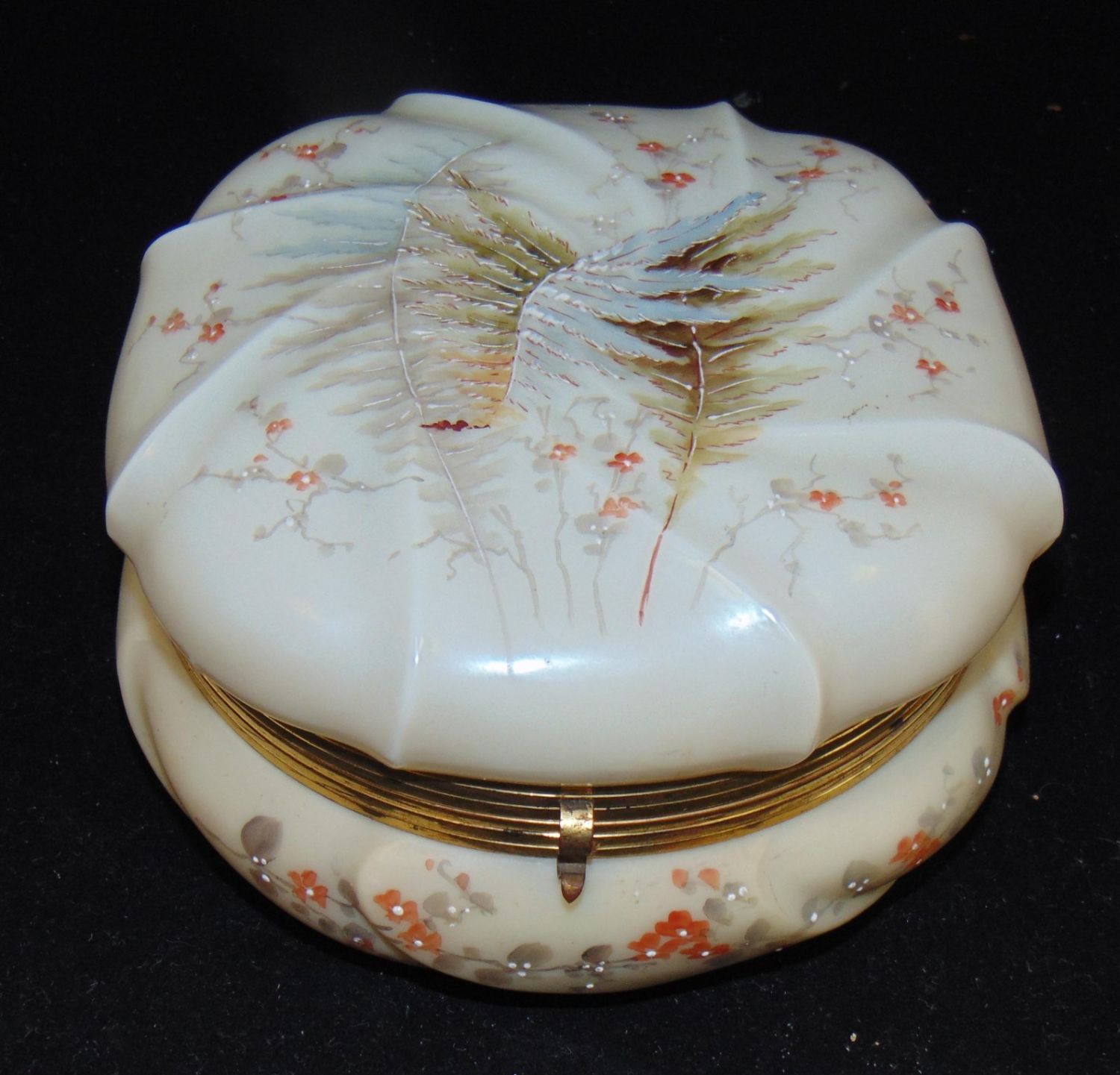 Ovoid Wave Crest Helmschmeid Swirl dresser box decorated with ferns, 7" wide. Condition: lining torn, glass is good