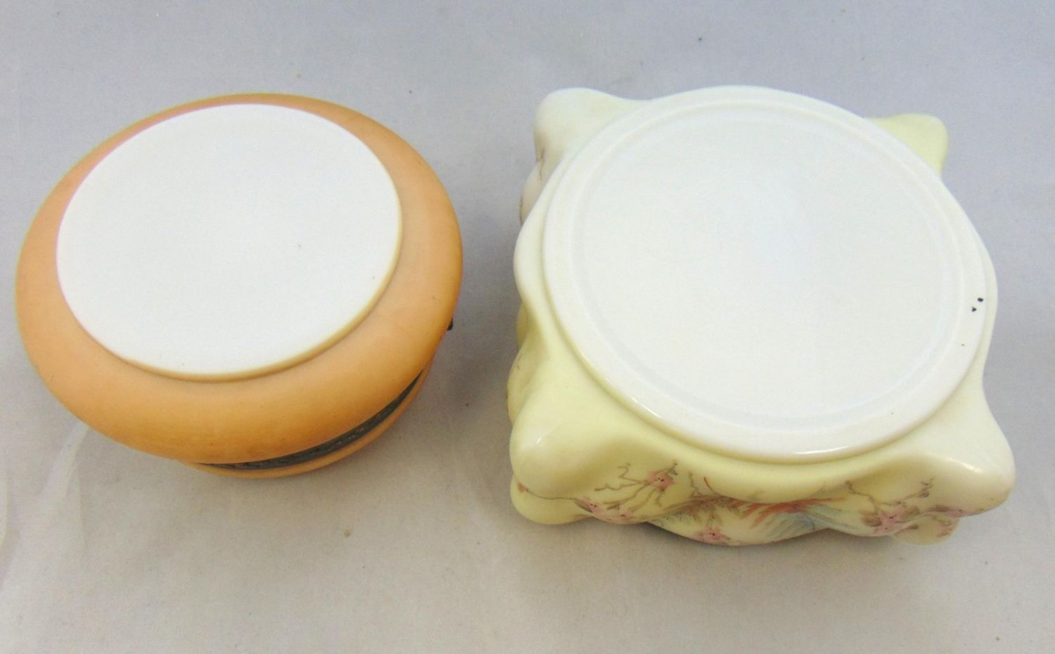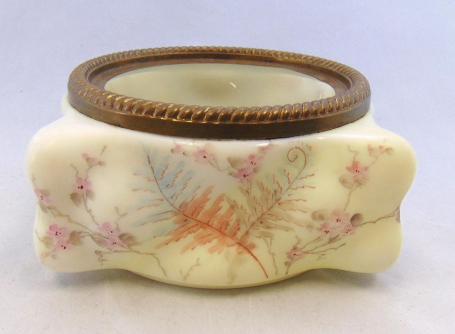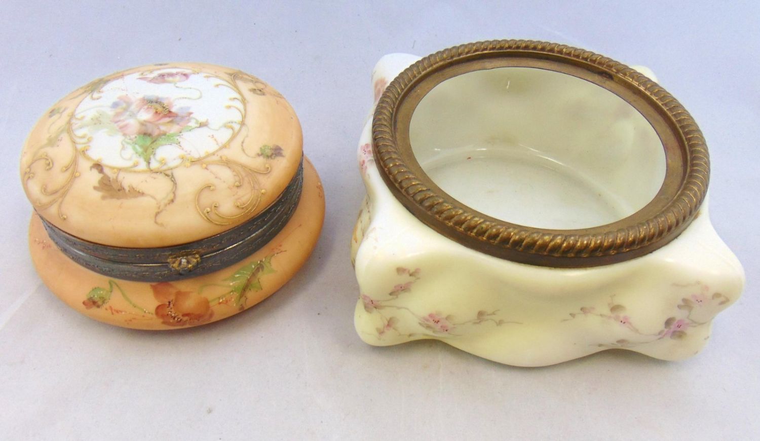 Including a Wave Crest egg crate ferner together with a dresser box decorated with a gold scrolling medallion of mums, probably by Pairpoint, largest 7" wide. Condition: good with no defects found