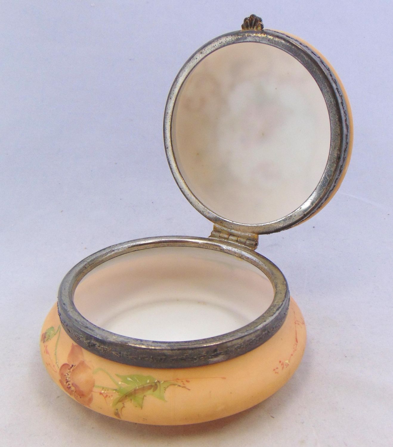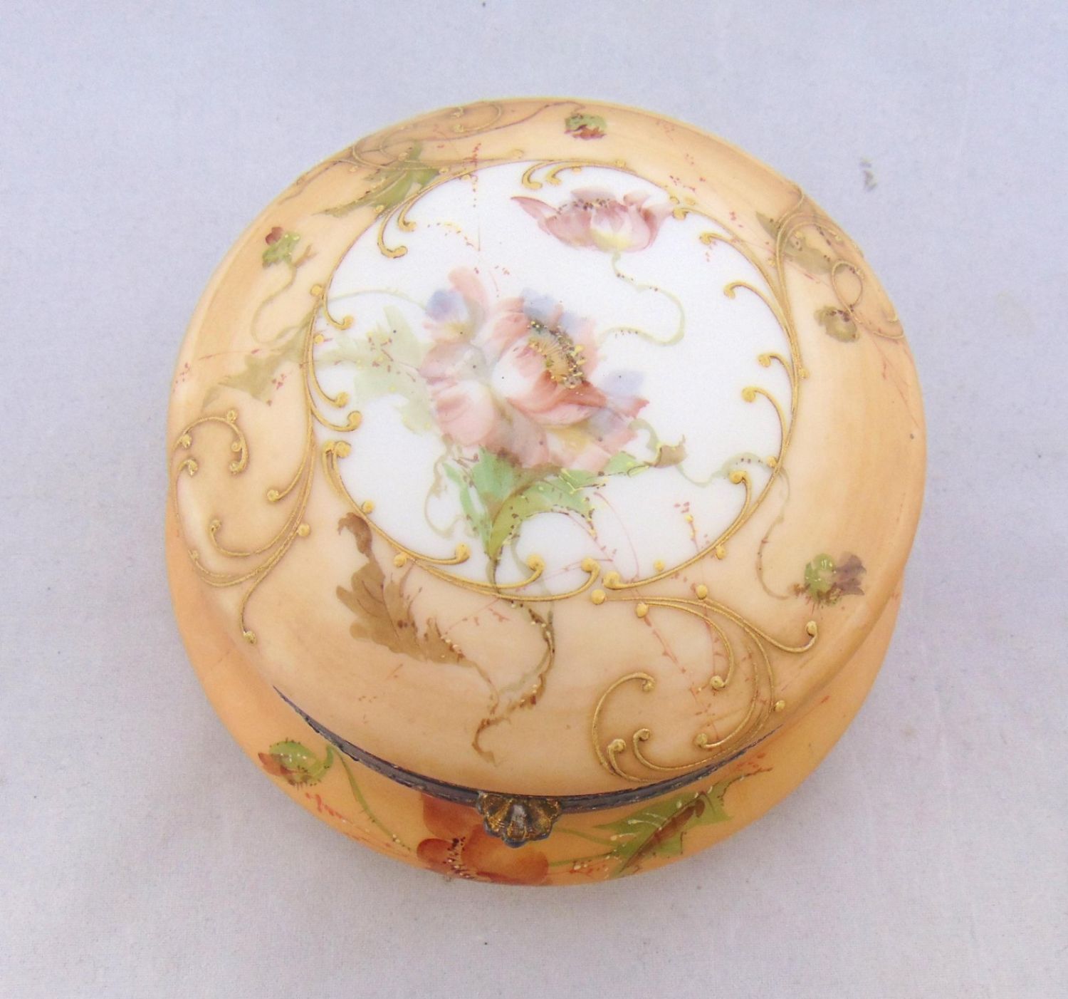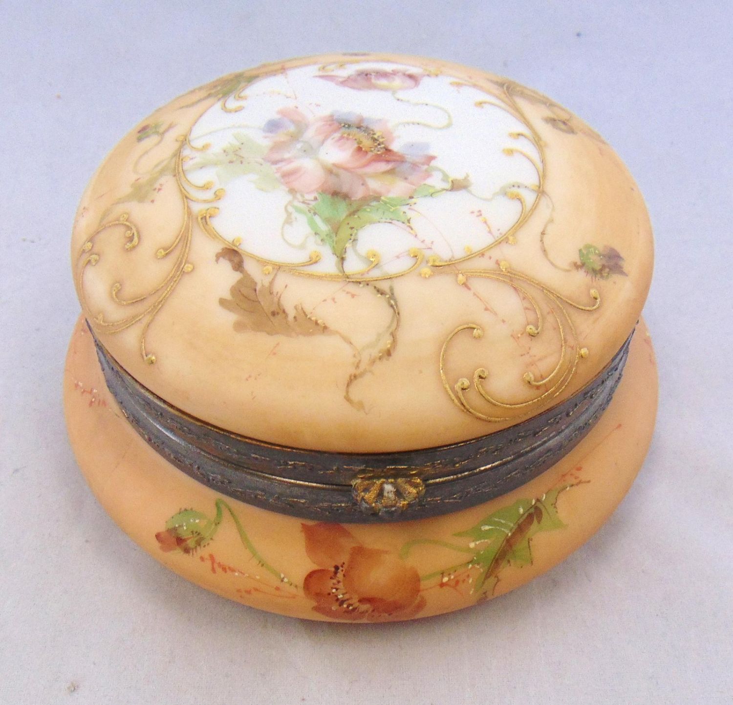 Including a Wave Crest egg crate ferner together with a dresser box decorated with a gold scrolling medallion of mums, probably by Pairpoint, largest 7" wide. Condition: good with no defects found