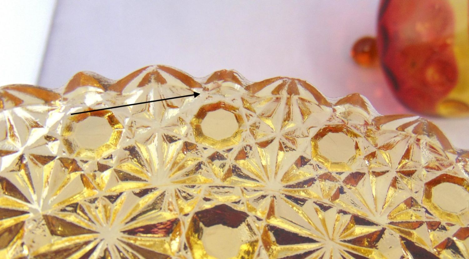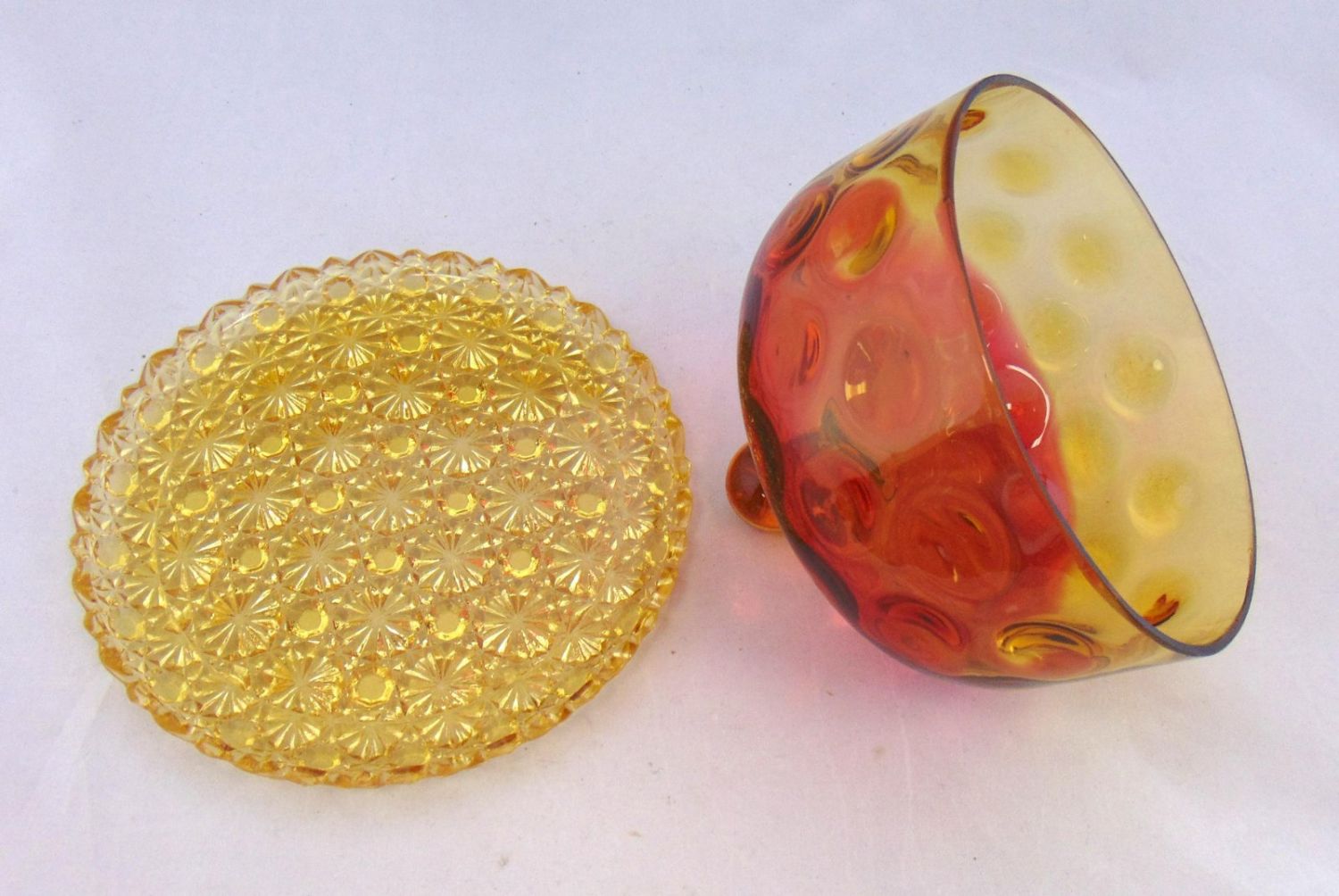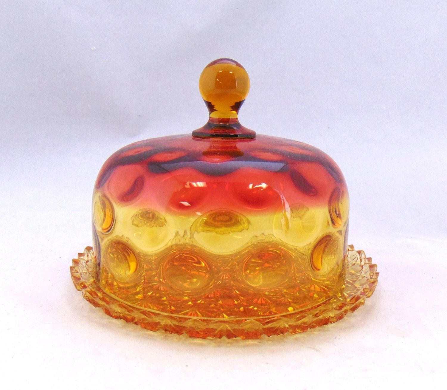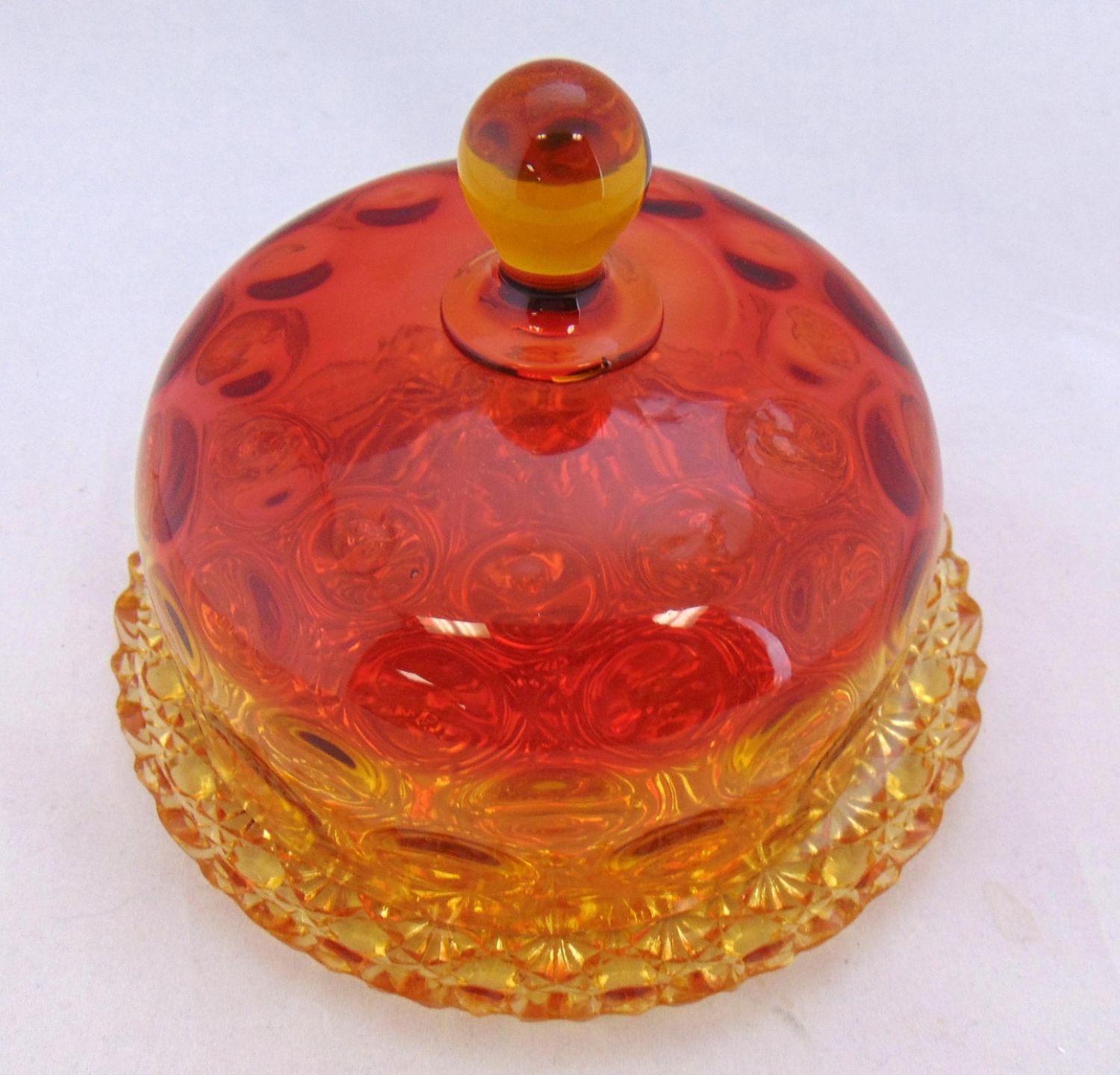 Amberina doom covered butter in the coinspot pattern set on an amber daisy and button tray, 7" wide. Condition: minor roughness to the teeth of the tray, see picture.