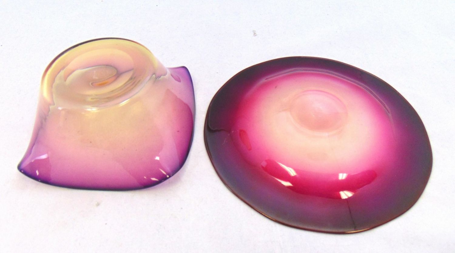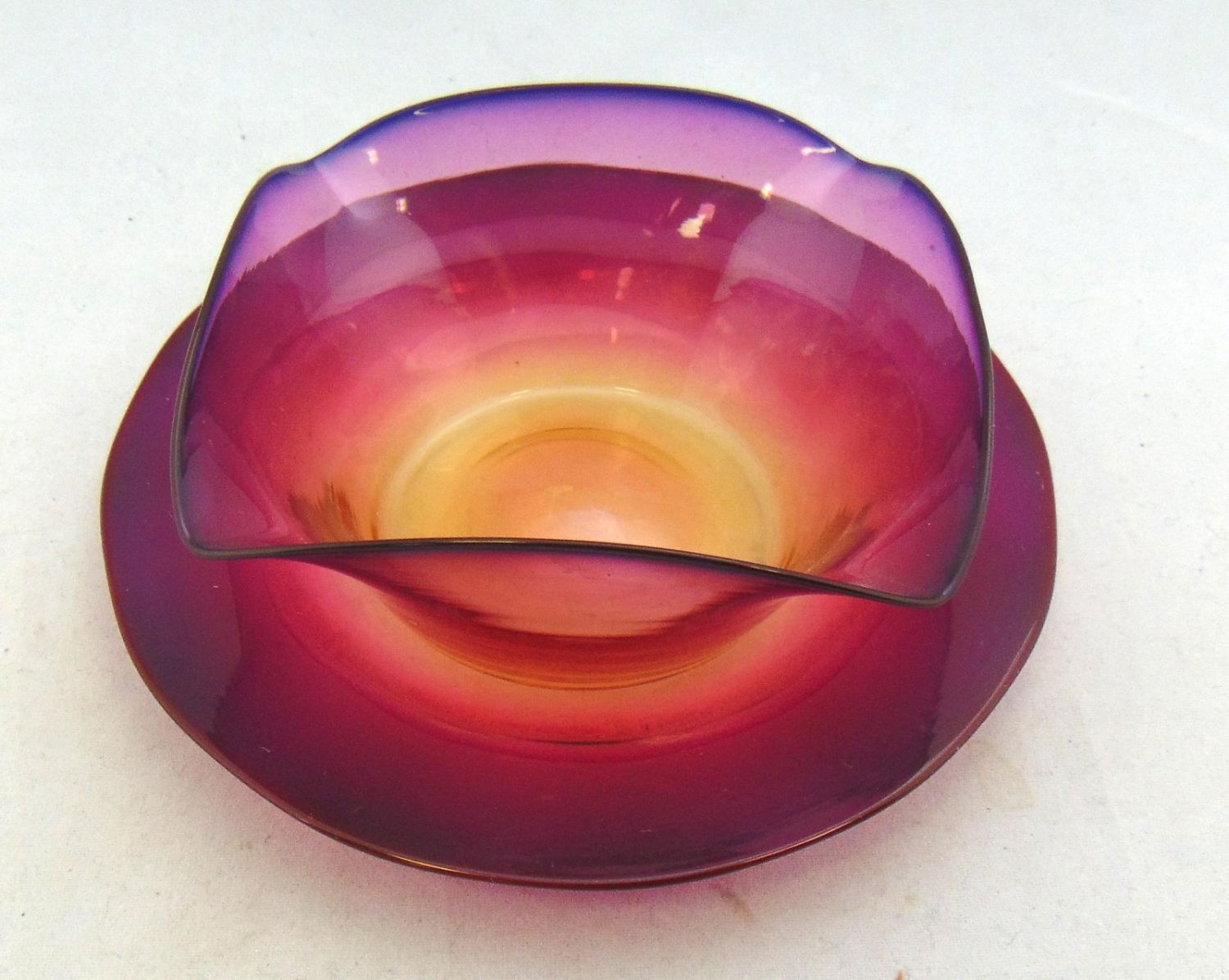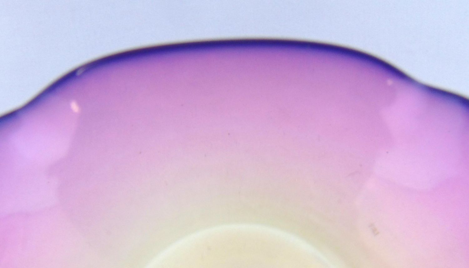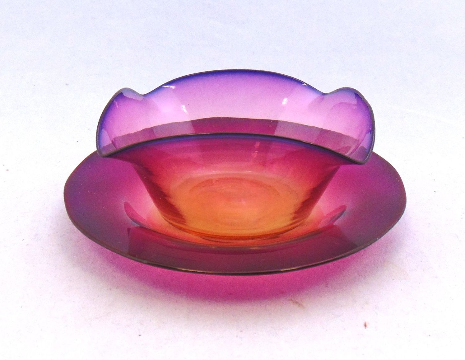 Webb Alexandrite finger bowl and underplate, with a subtle blue hue rim, 6" wide. Condition: good with no defects found.