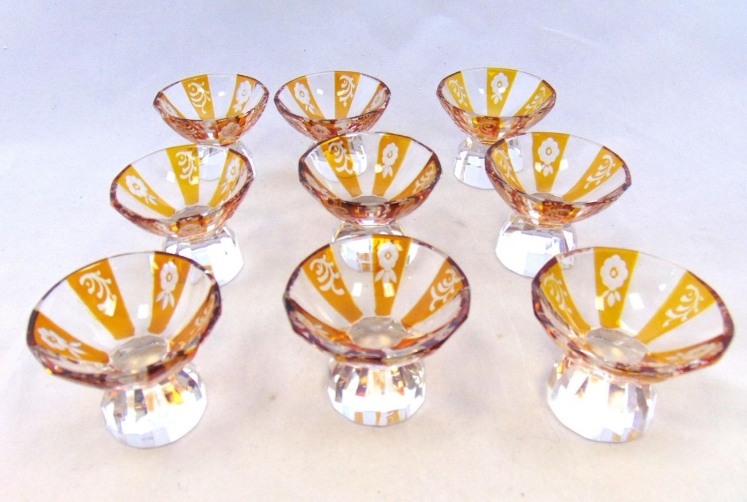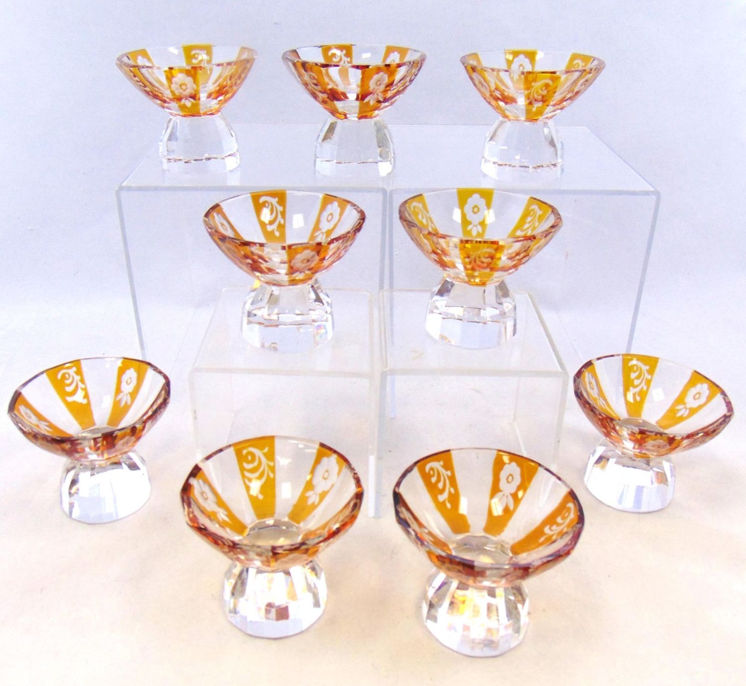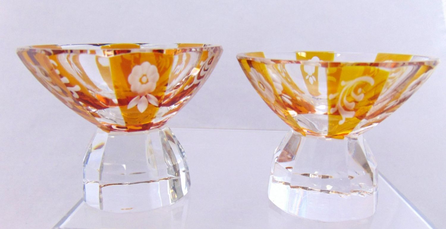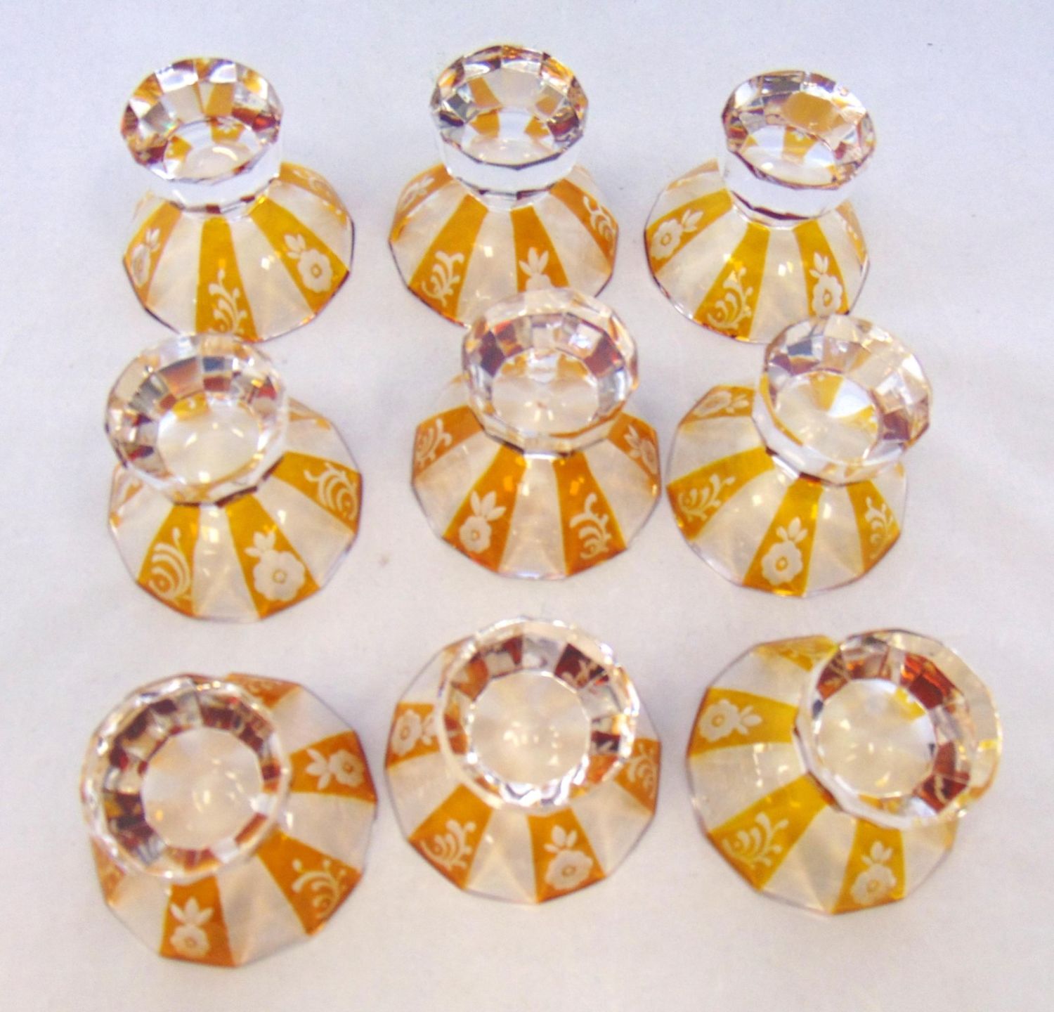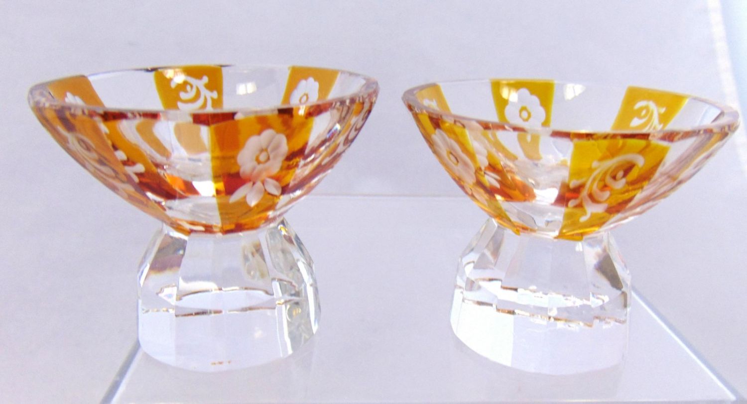 Set of nine amber flashed cut glass salts with pedestal faceted feet, 2" ht. Condition: good with no defects found.