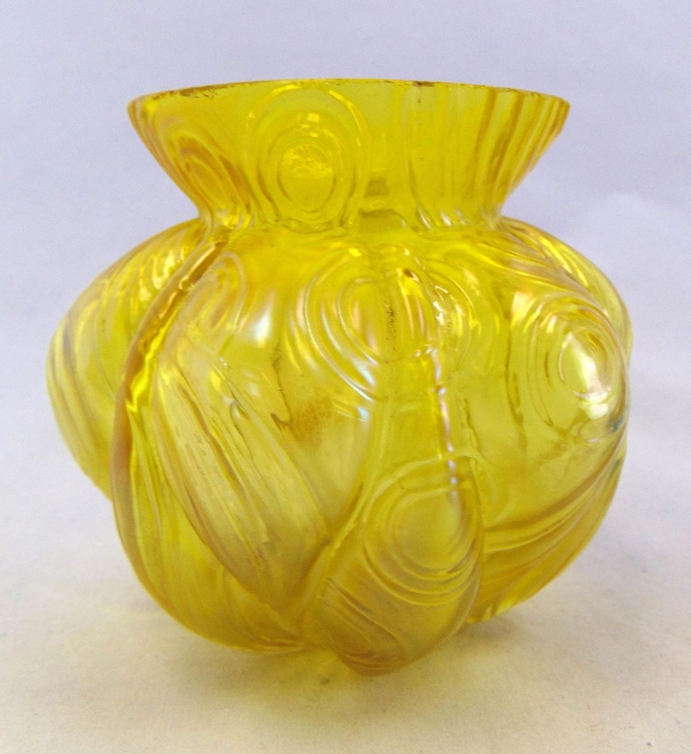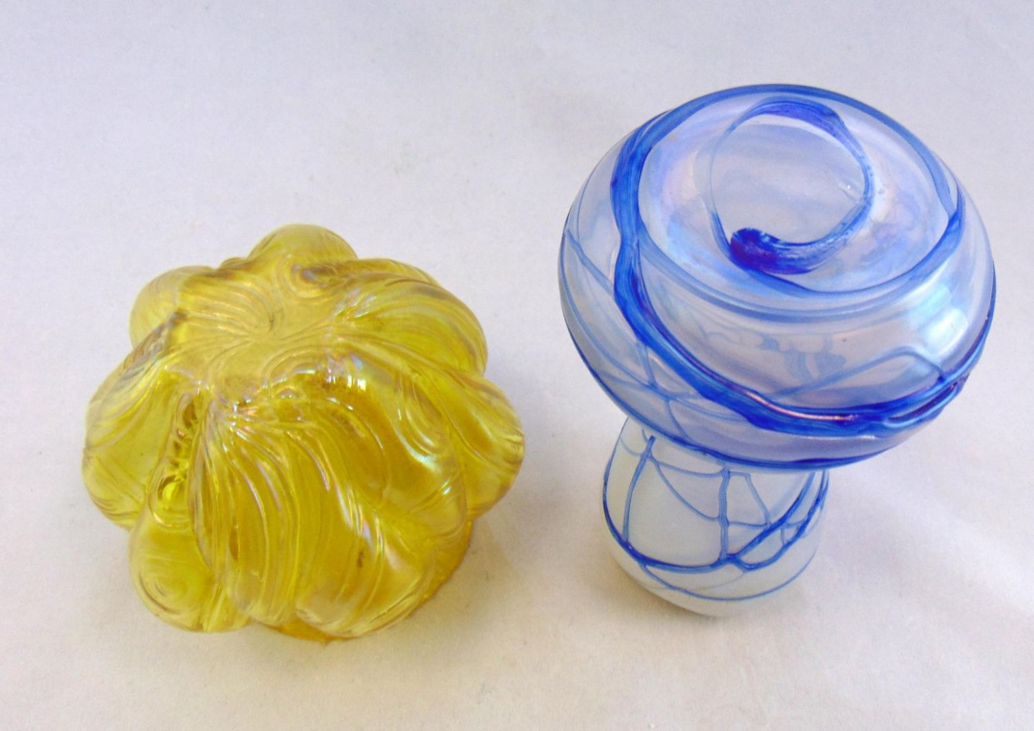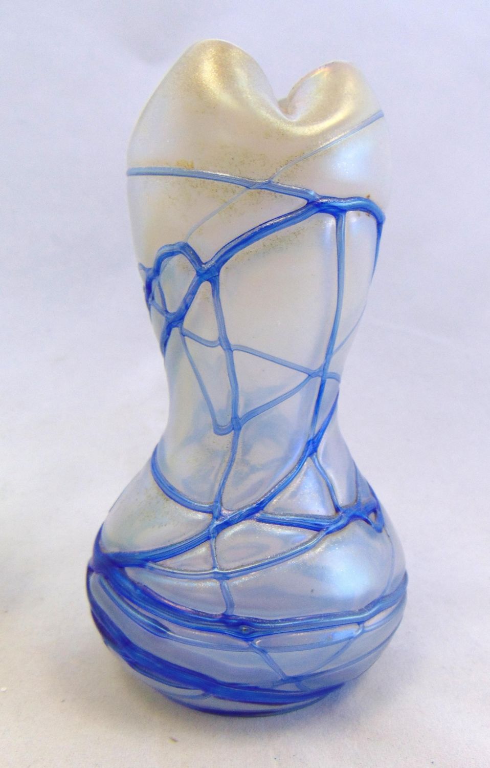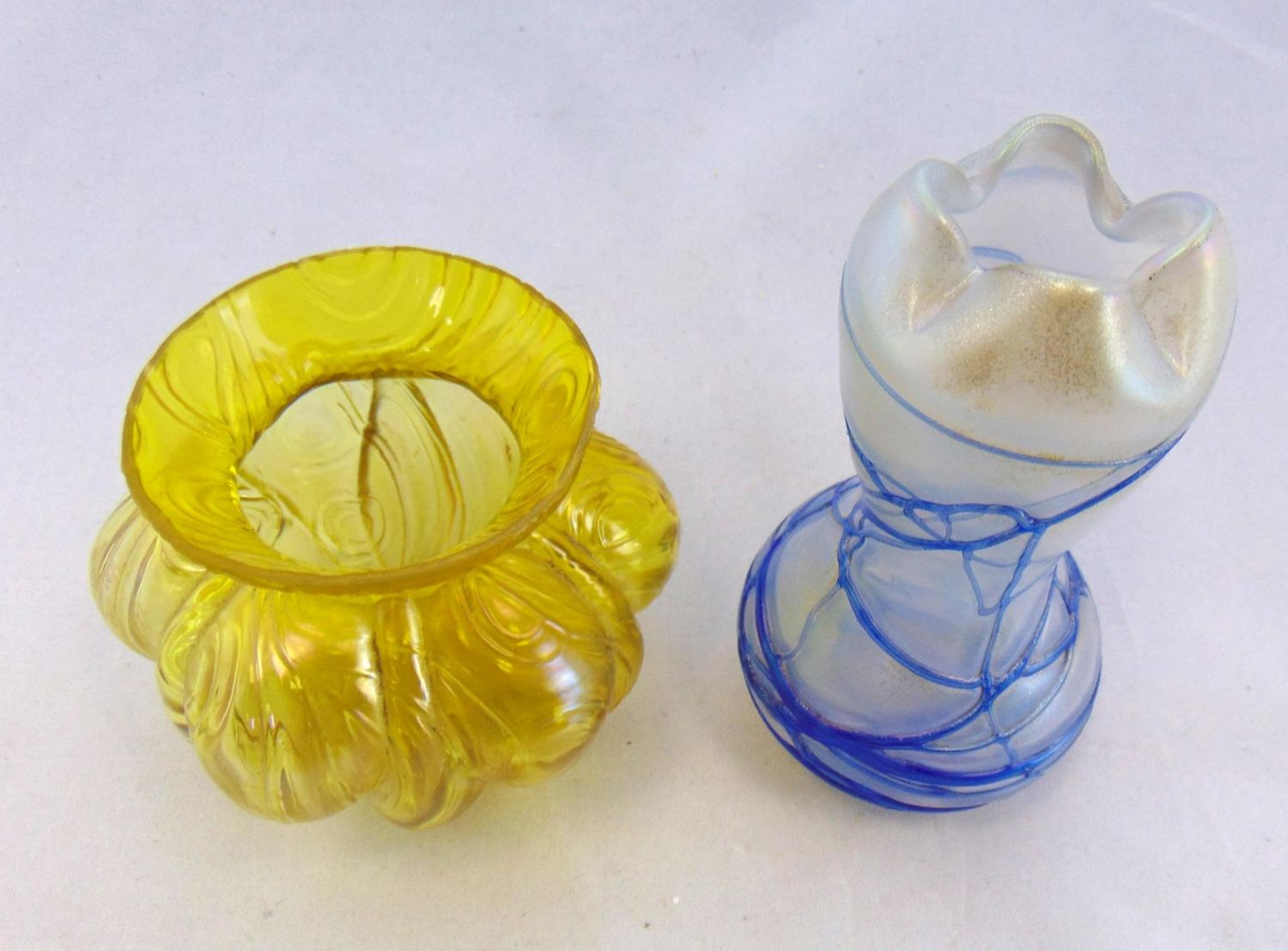 Including a Loetz Rusticana amber vase together with an attributed Palme Konig white vase with blue threading, 5 1/4′ ht. Condition: good with no defects found.