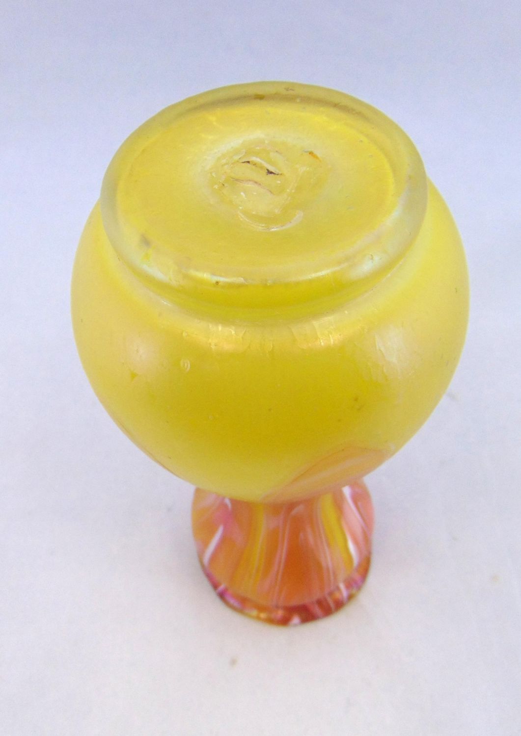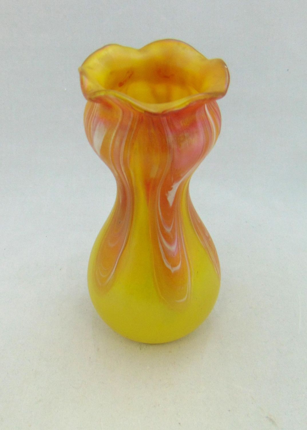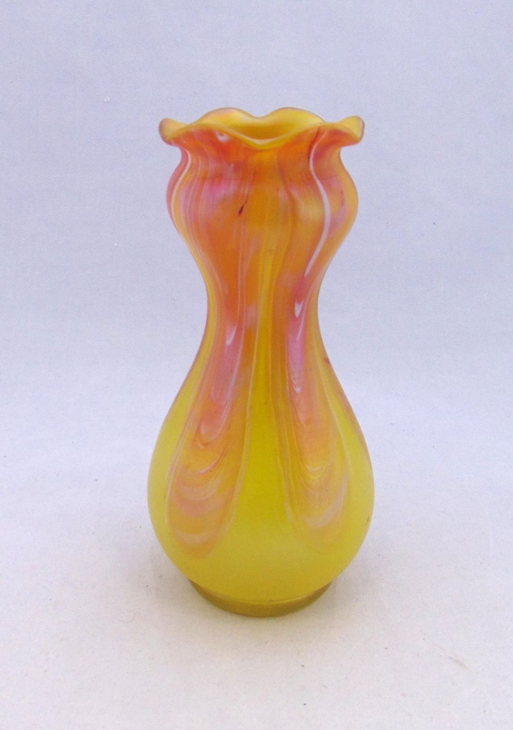 Corset form yellow Rindskopf glass vase with a pink pulled feather, 7 1/4" ht. Condition: good with no defects found.