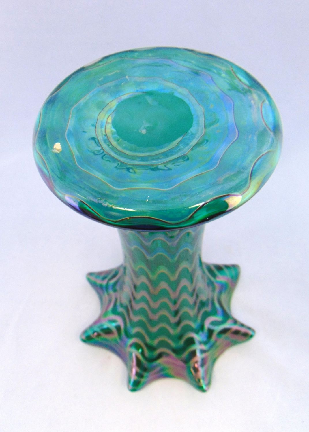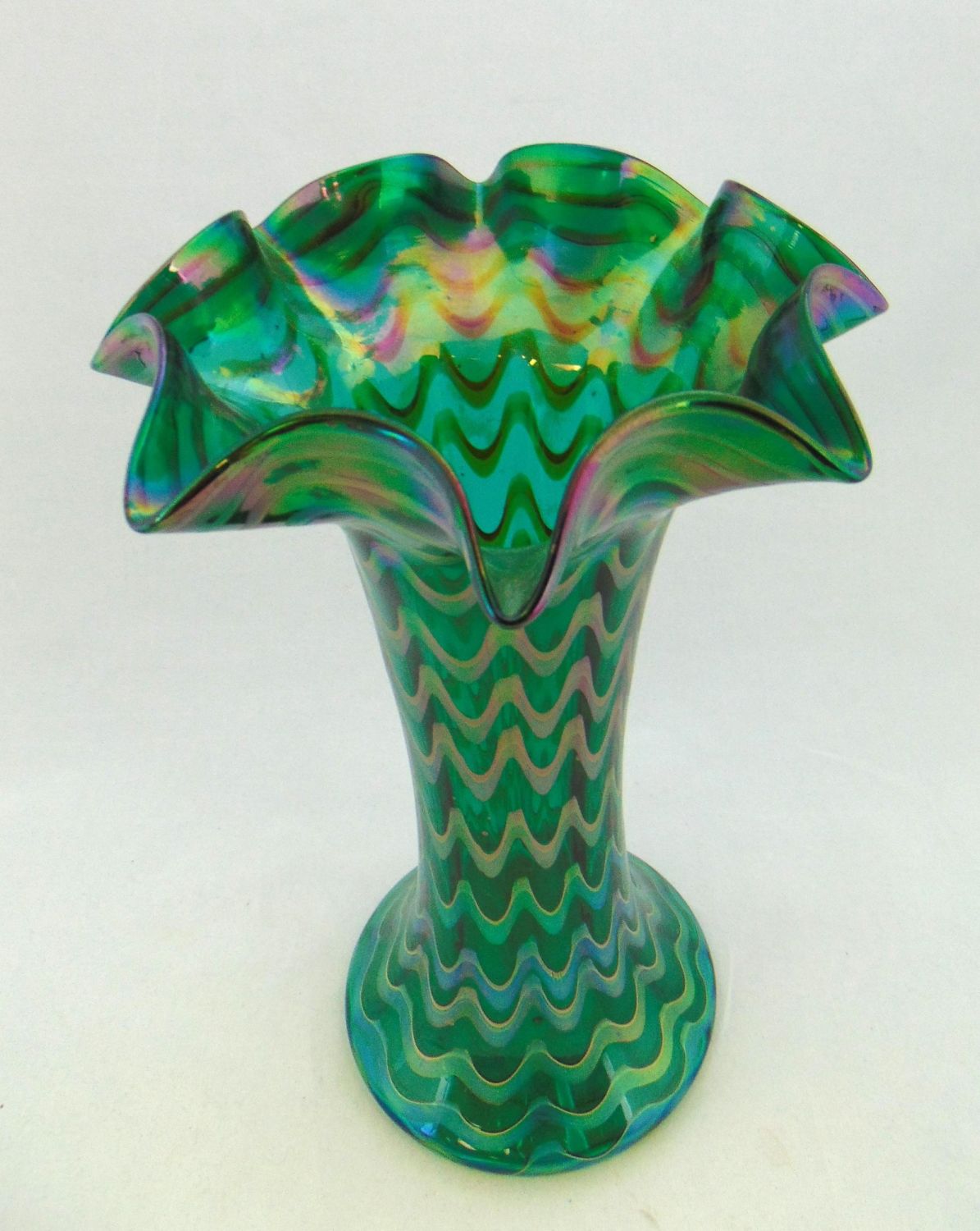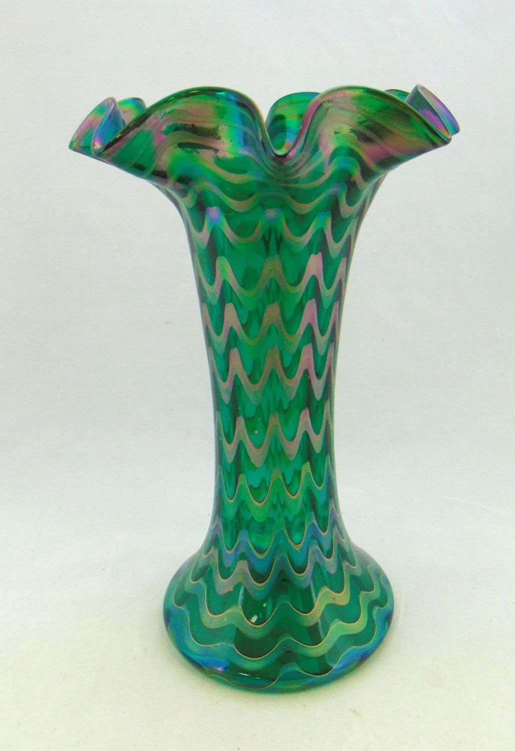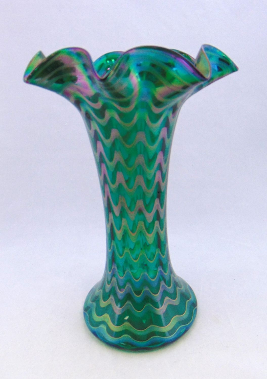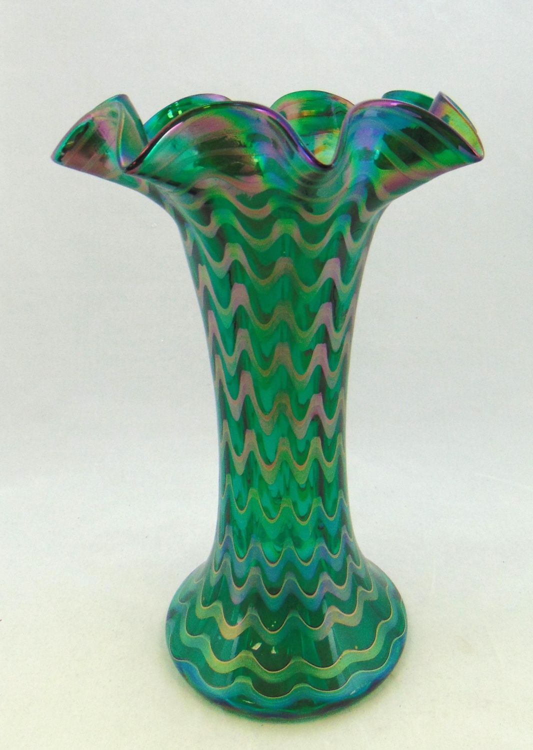 Corset form green glass vase with a spreading scalloped rim with an iridescent gold wave pattern, 11 1/2" ht. Condition: good with no defects found