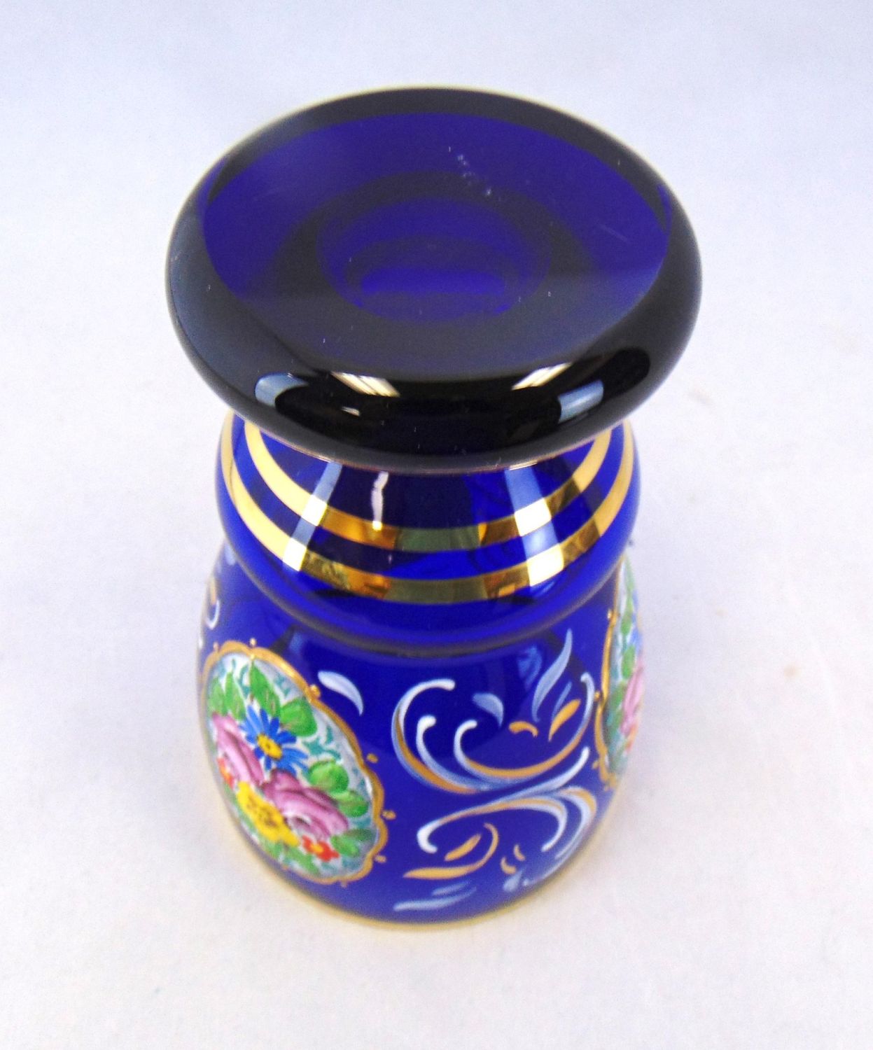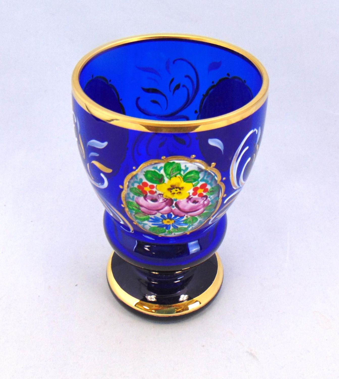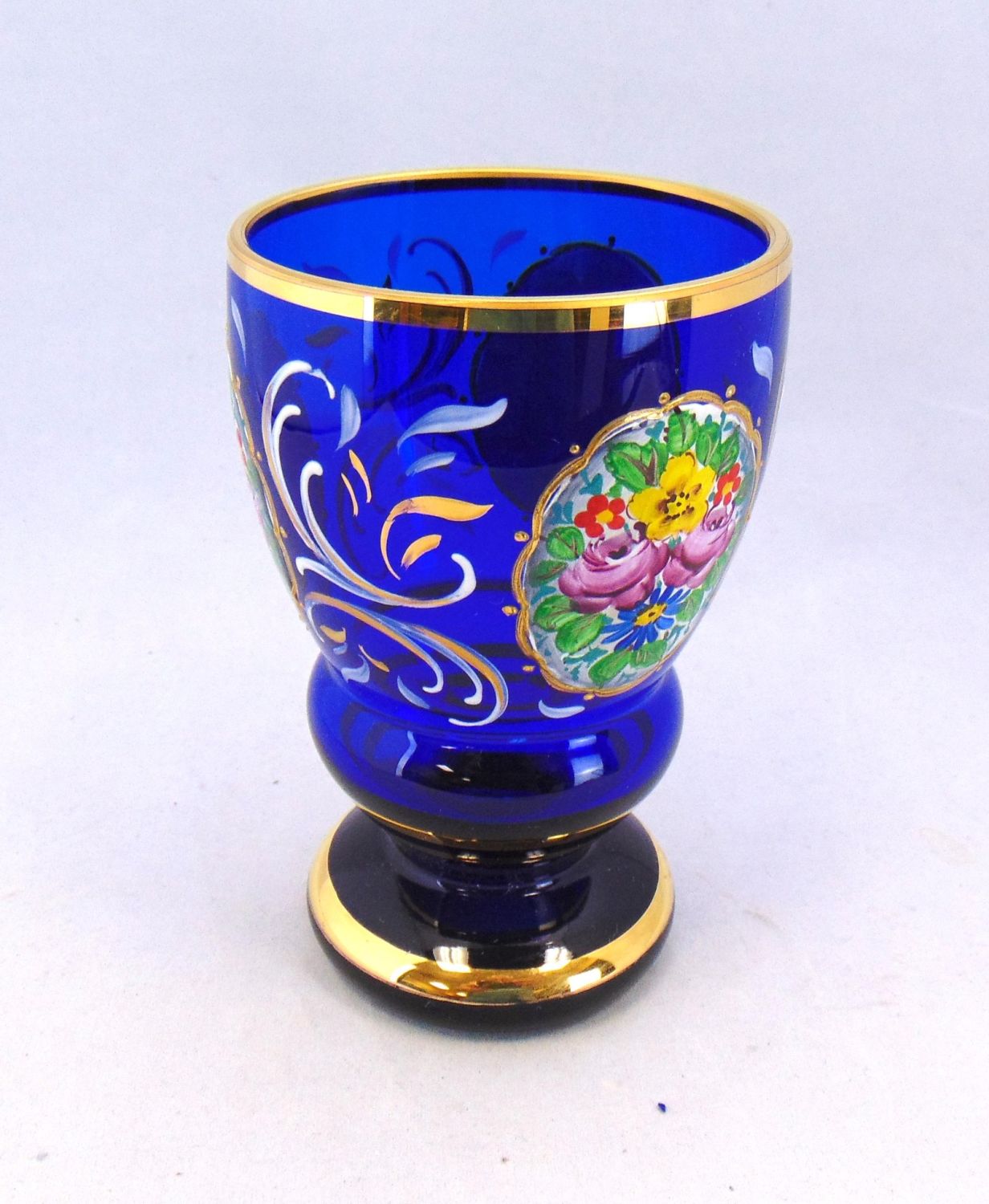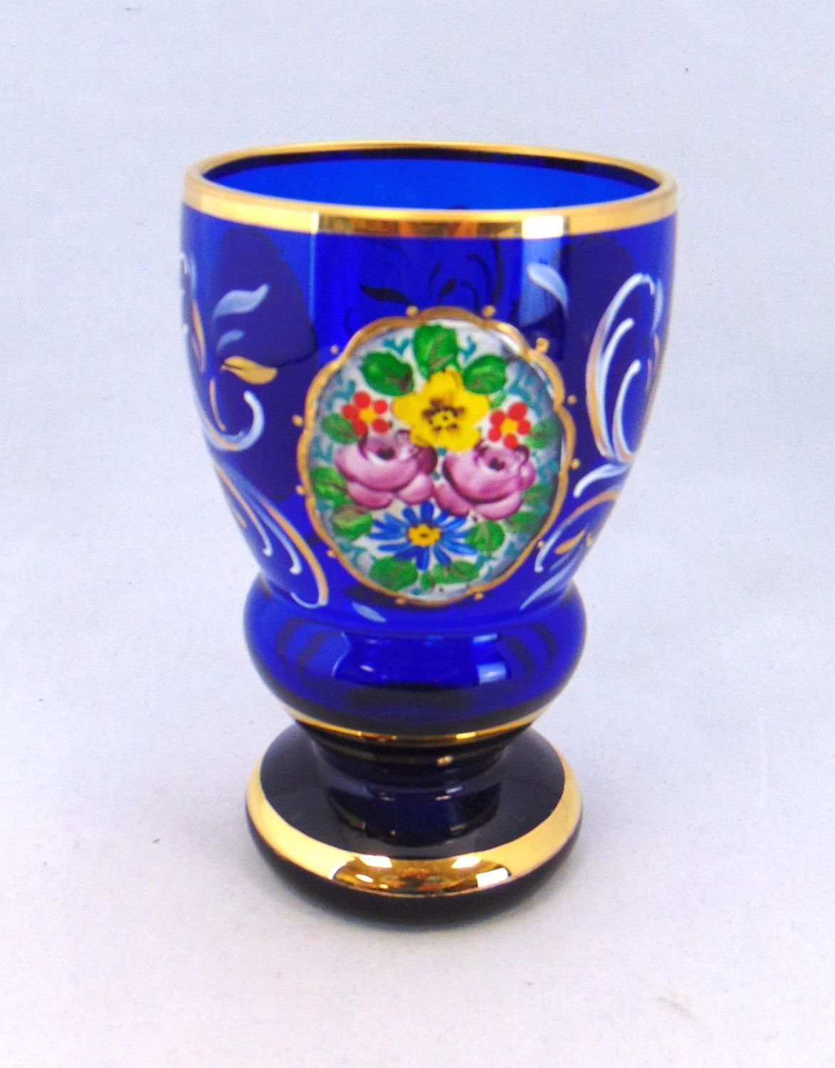 Cobalt Bohemian tumbler decorated with a flower medallion and gold scrolling, 5" ht. Condition: good with no defects found.