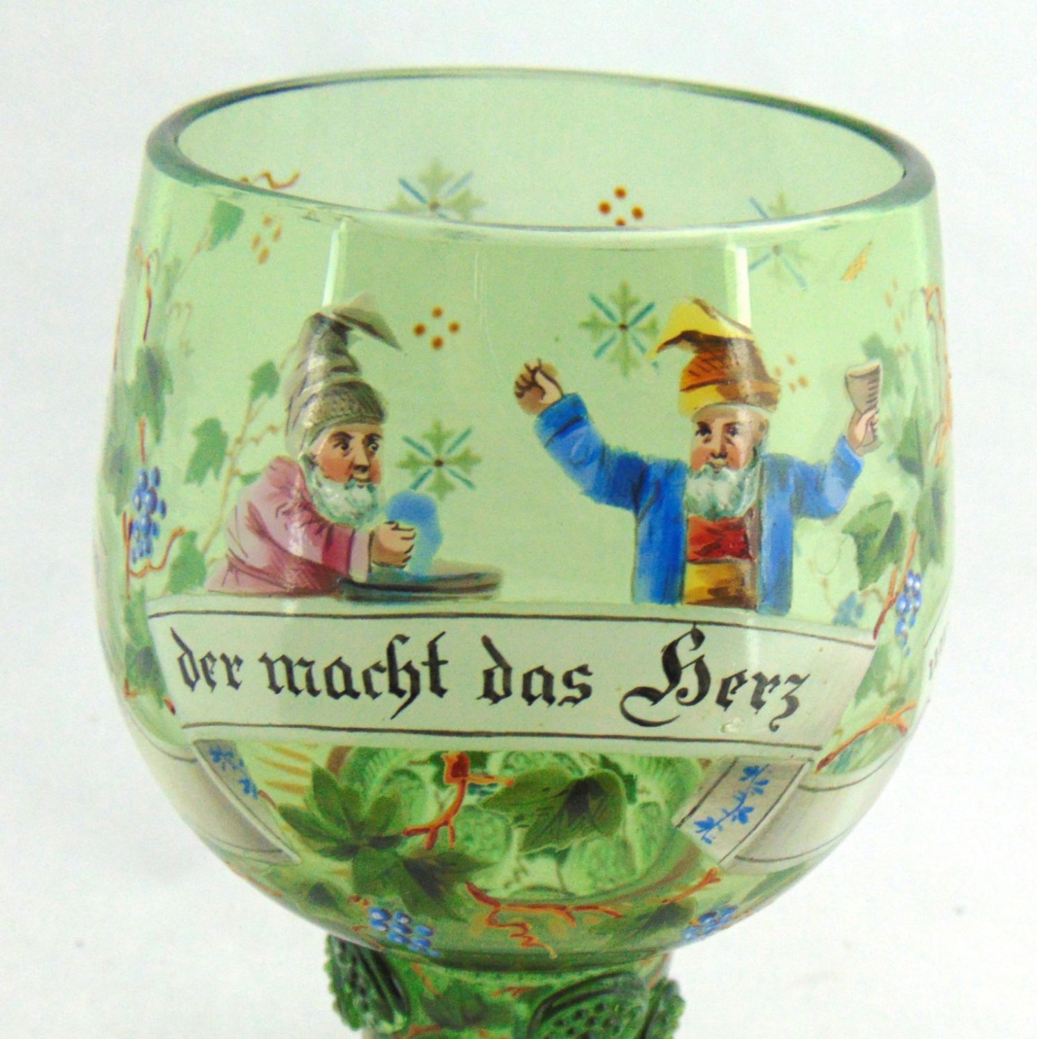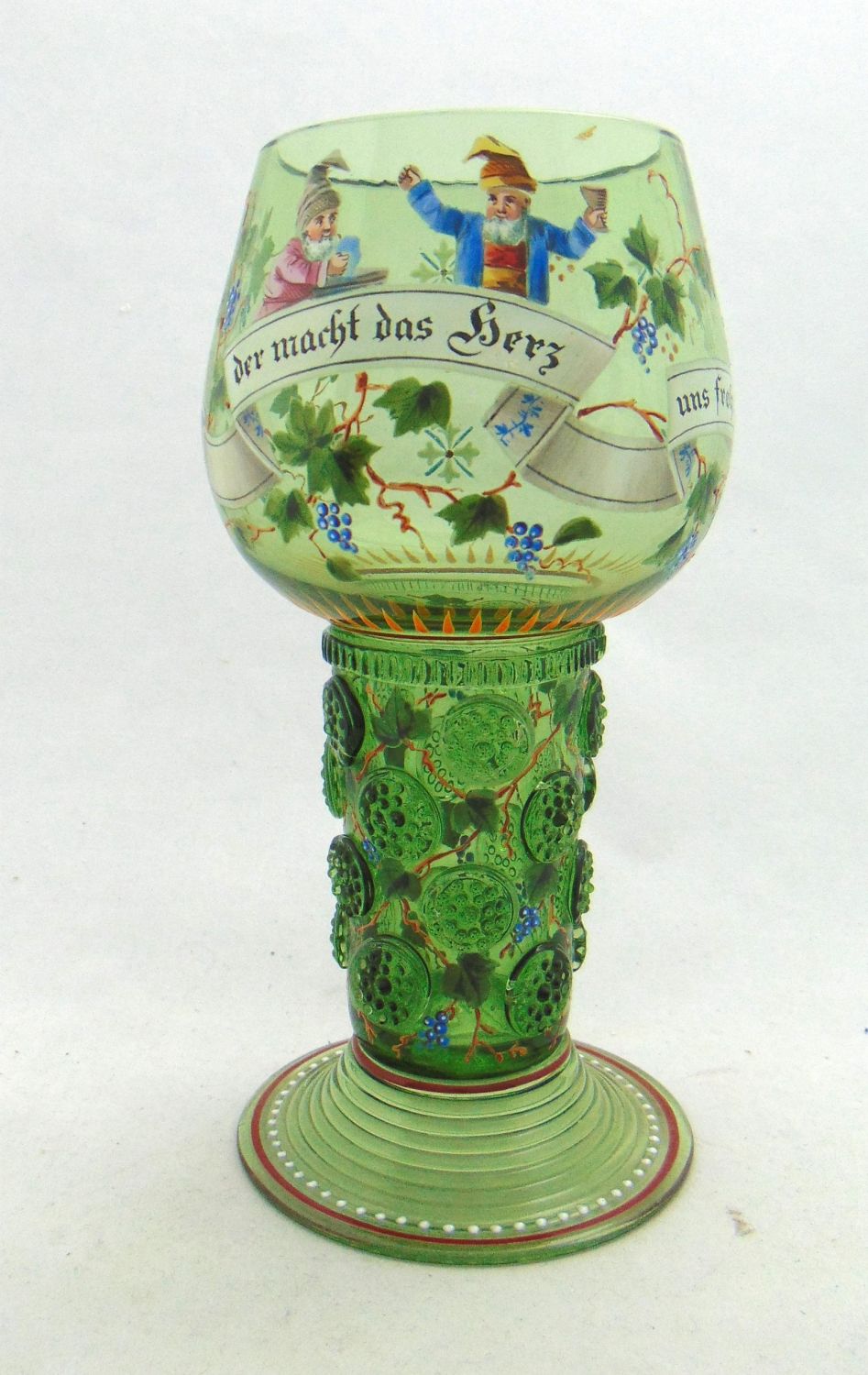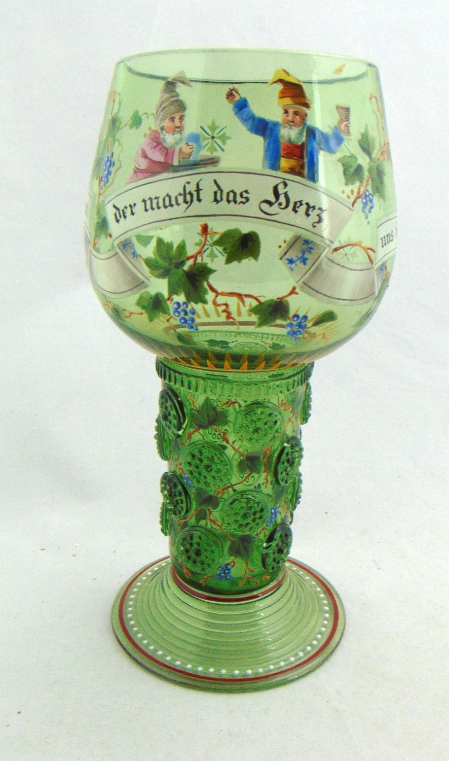 Lobmeyr green beer goblet with enameled gnomes grape vines and verse "Deer macht das herz uns froh" interpreted "that makes the heart happy, " marked with the cross MM factory back stamp, 8" ht. Condition: good with no defects found.