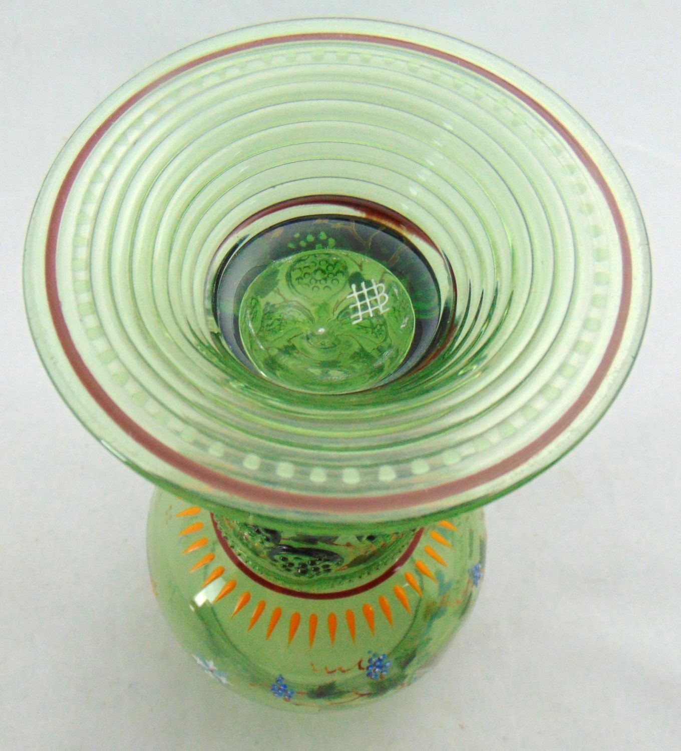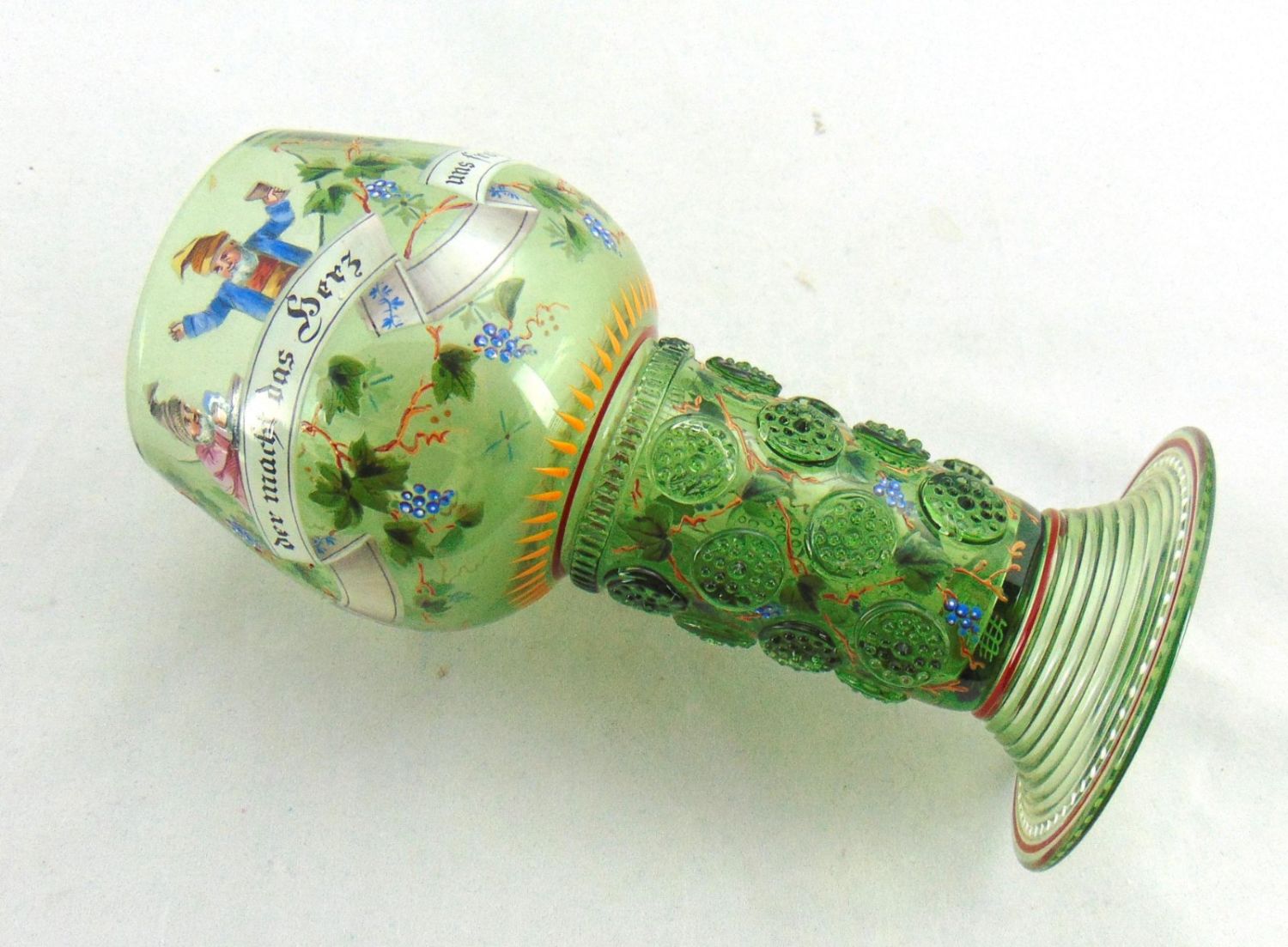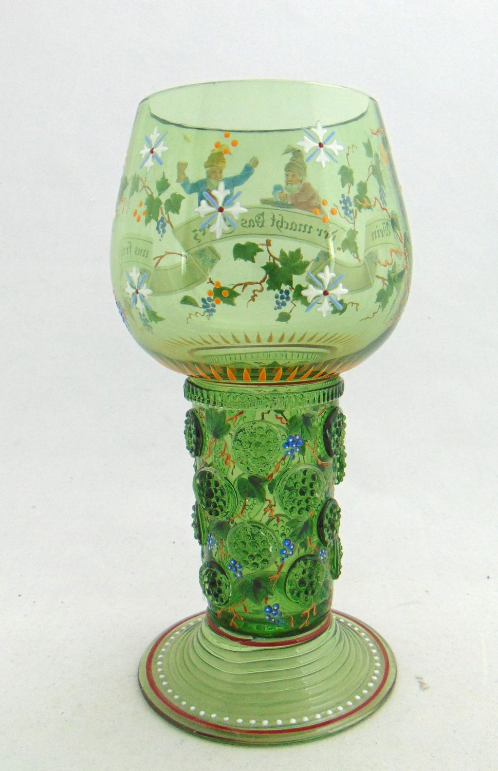 Lobmeyr green beer goblet with enameled gnomes grape vines and verse "Deer macht das herz uns froh" interpreted "that makes the heart happy, " marked with the cross MM factory back stamp, 8" ht. Condition: good with no defects found.