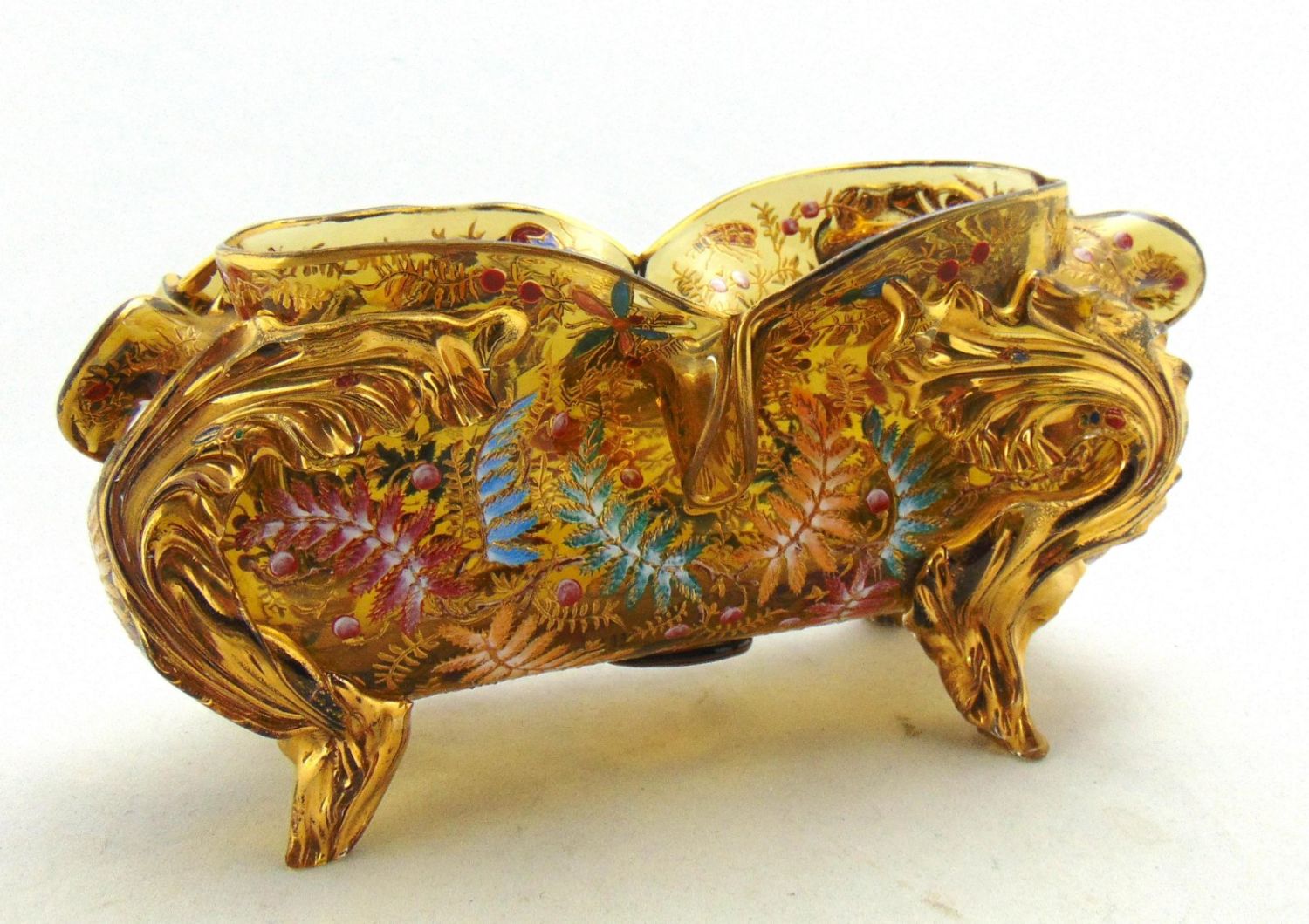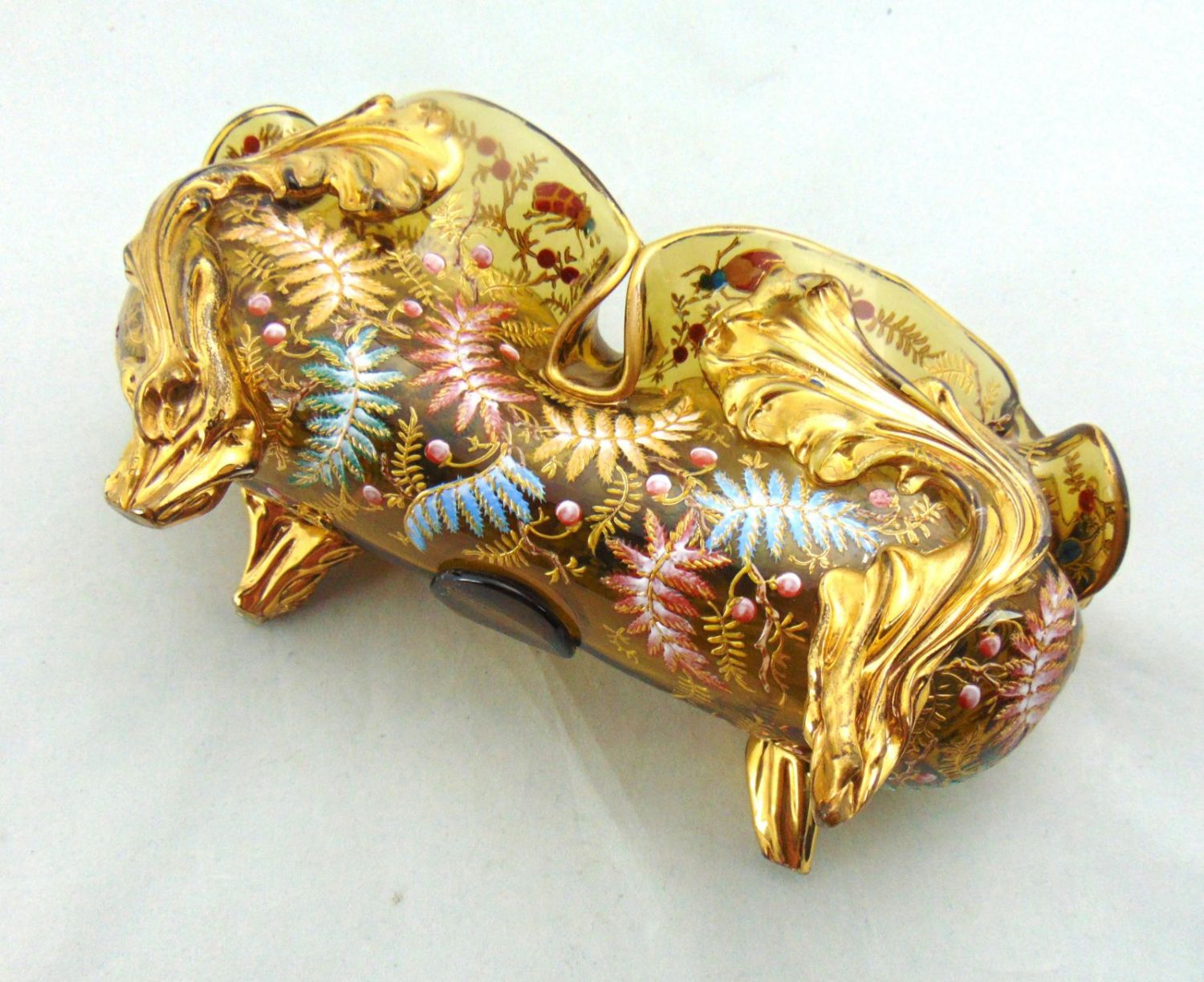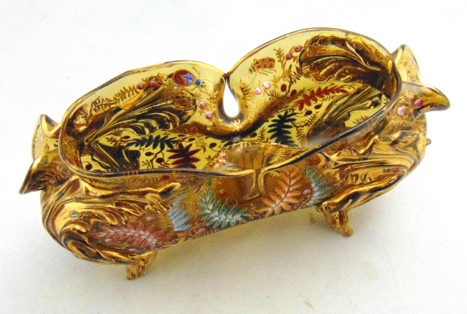 Moser elongated footed glass vase in free form amber with applied gilt rigaree leaves extending to feet decorated with colorful ferns and four insects on the interior rim, 9 1/2" long. Condition: good with no defects found.