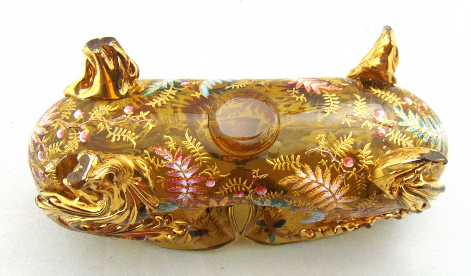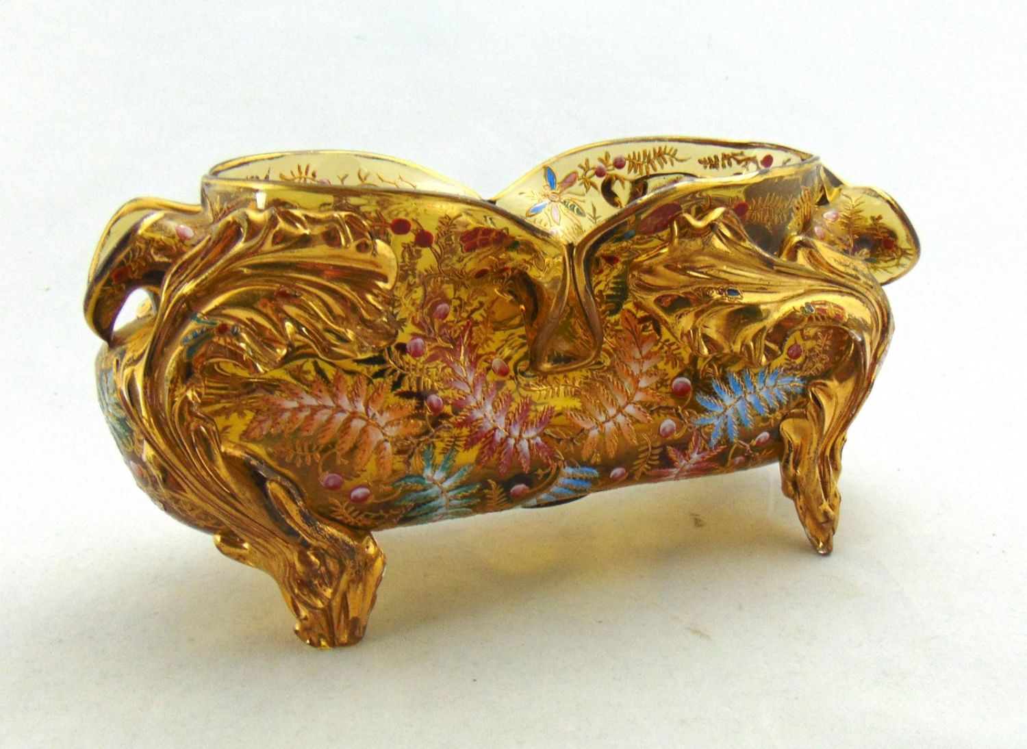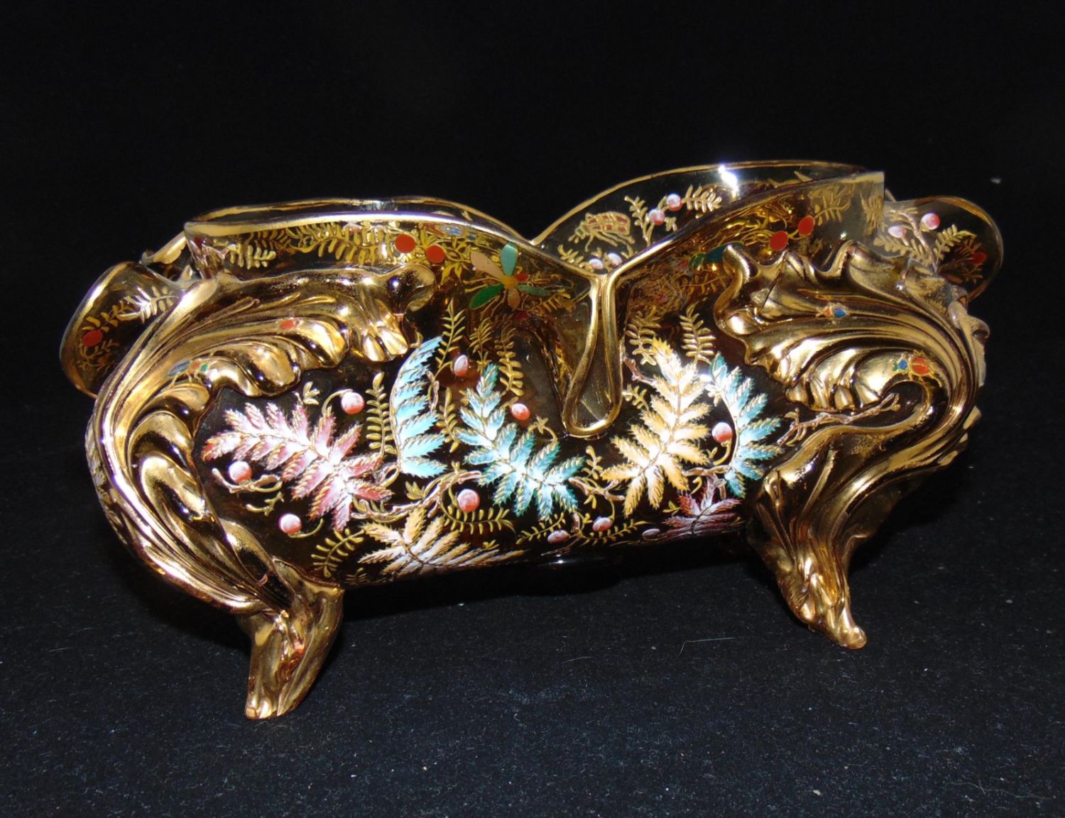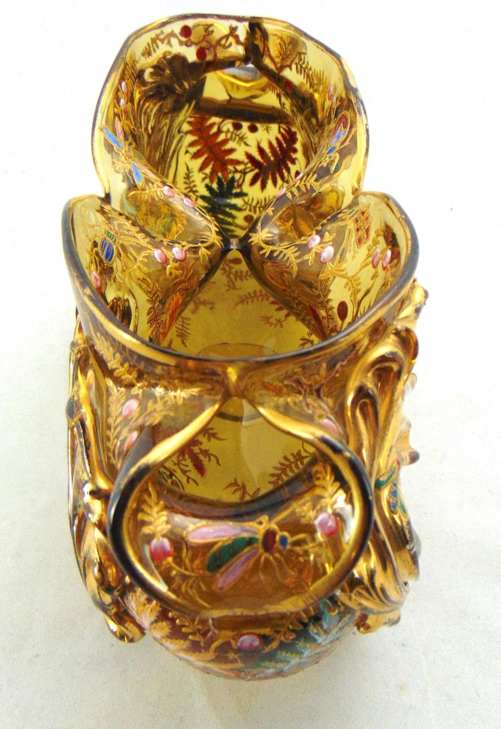 Moser elongated footed glass vase in free form amber with applied gilt rigaree leaves extending to feet decorated with colorful ferns and four insects on the interior rim, 9 1/2" long. Condition: good with no defects found.