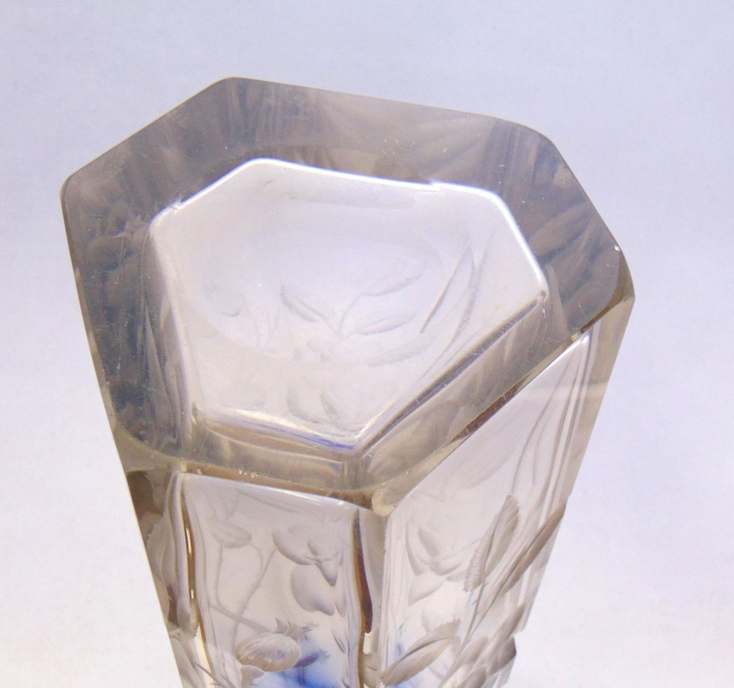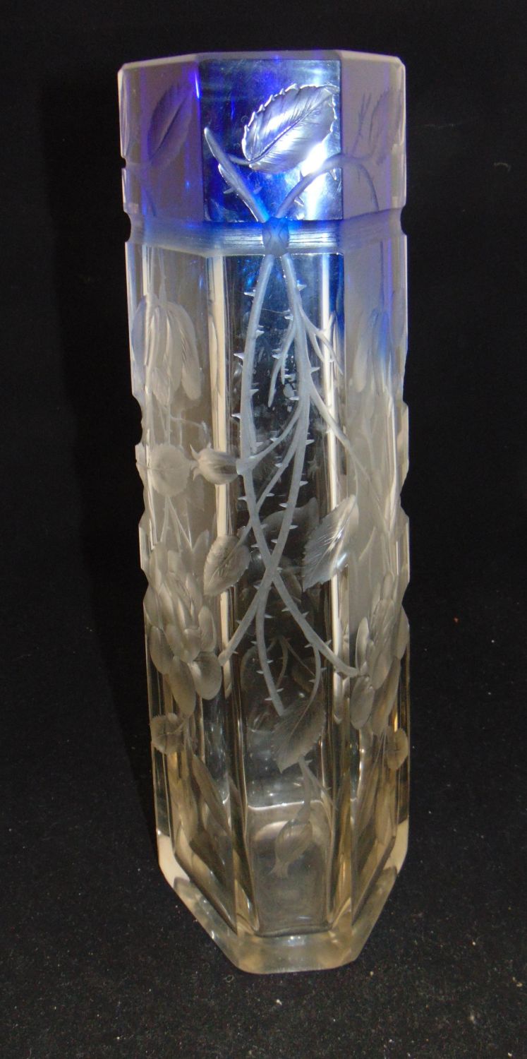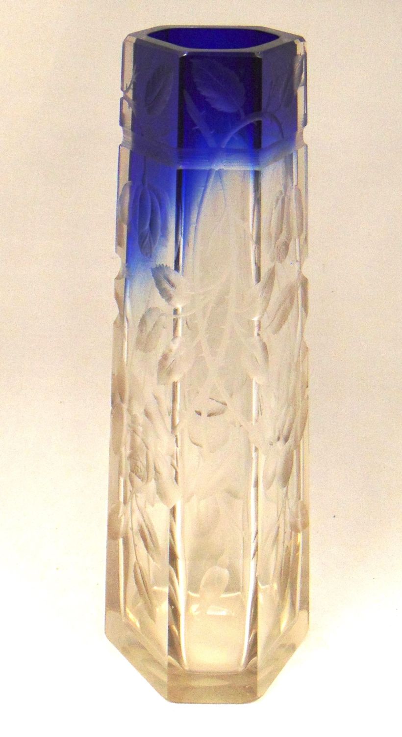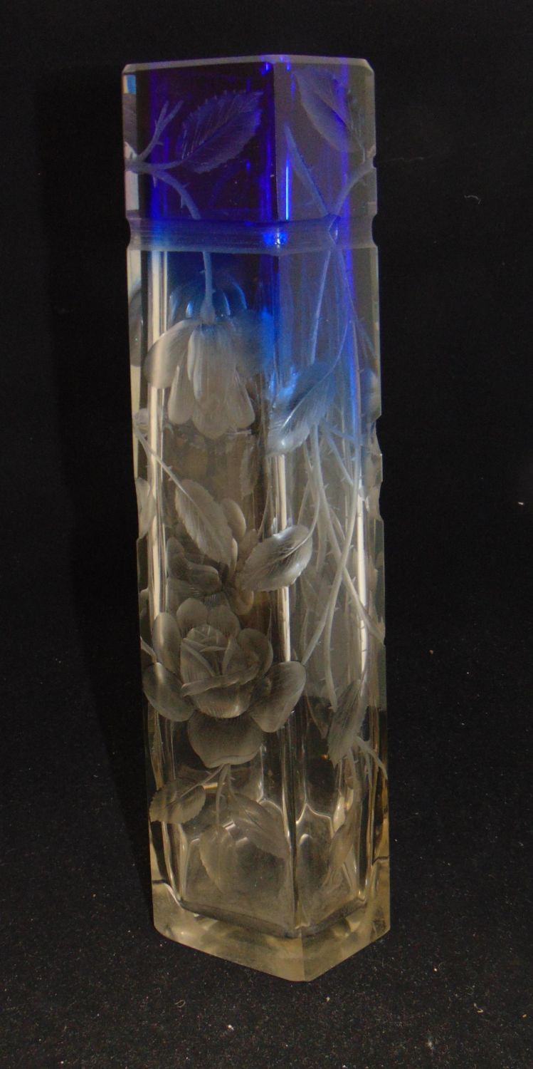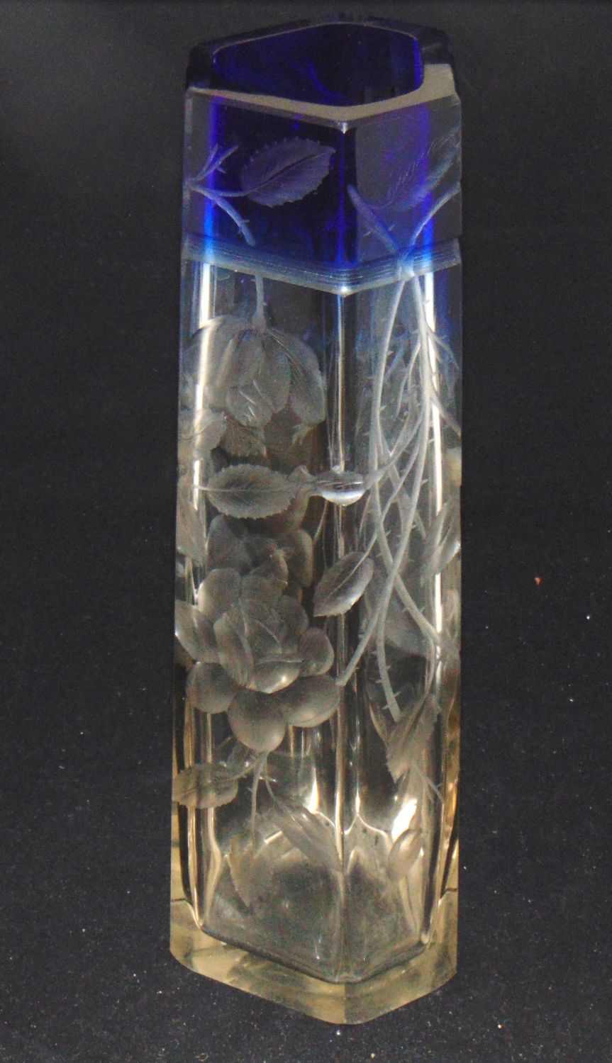 Moser faceted sided translucent glass vase graduating to blue decorated with a deep cut branches of cascading flowers, 15 1/2′ ht. Condition: good with no defects found.