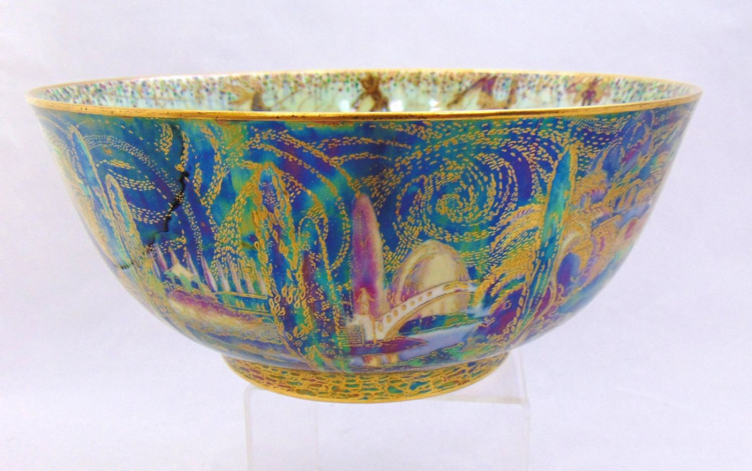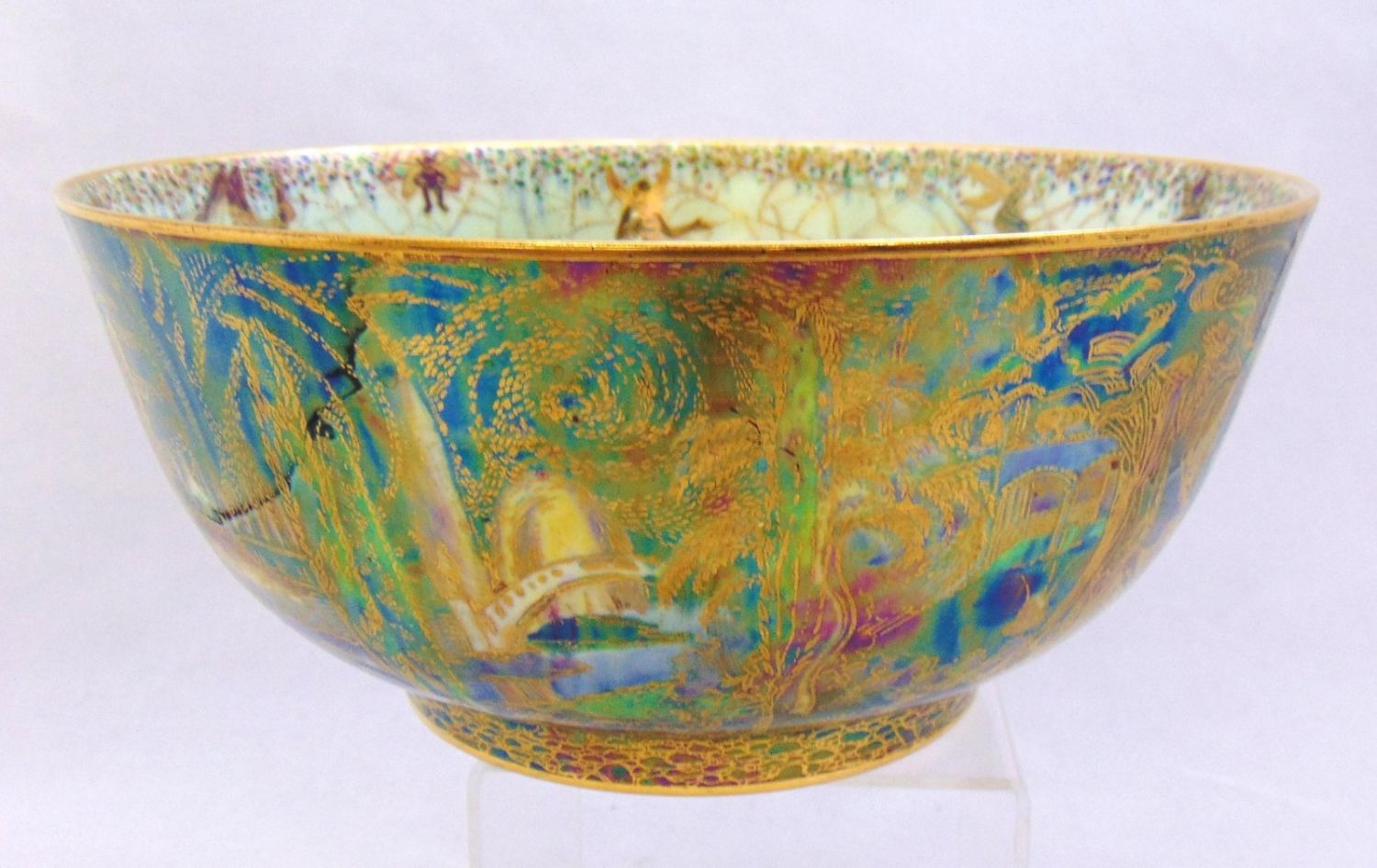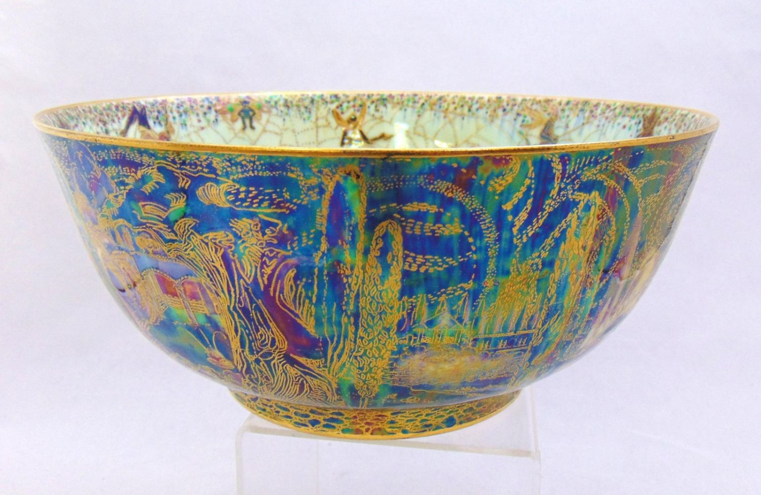 Footed bowl in blue with a turquoise interior, exterior decorated with Cyprus trees, bridges, and building, interior with ladies, gnomes and fairies, marked Wedgwood 9" wide by 4 1/2′ ht. Condition: good with no defects found.