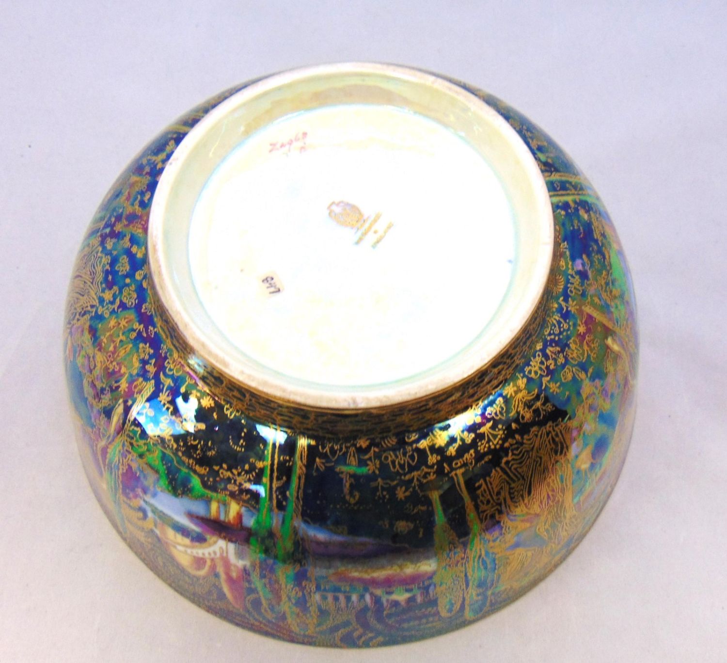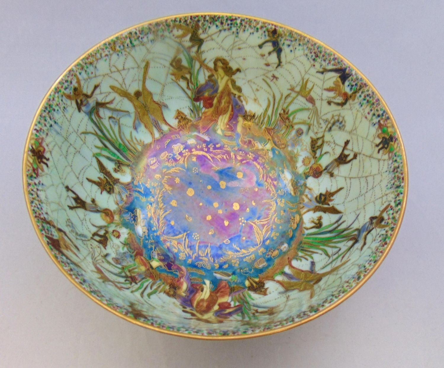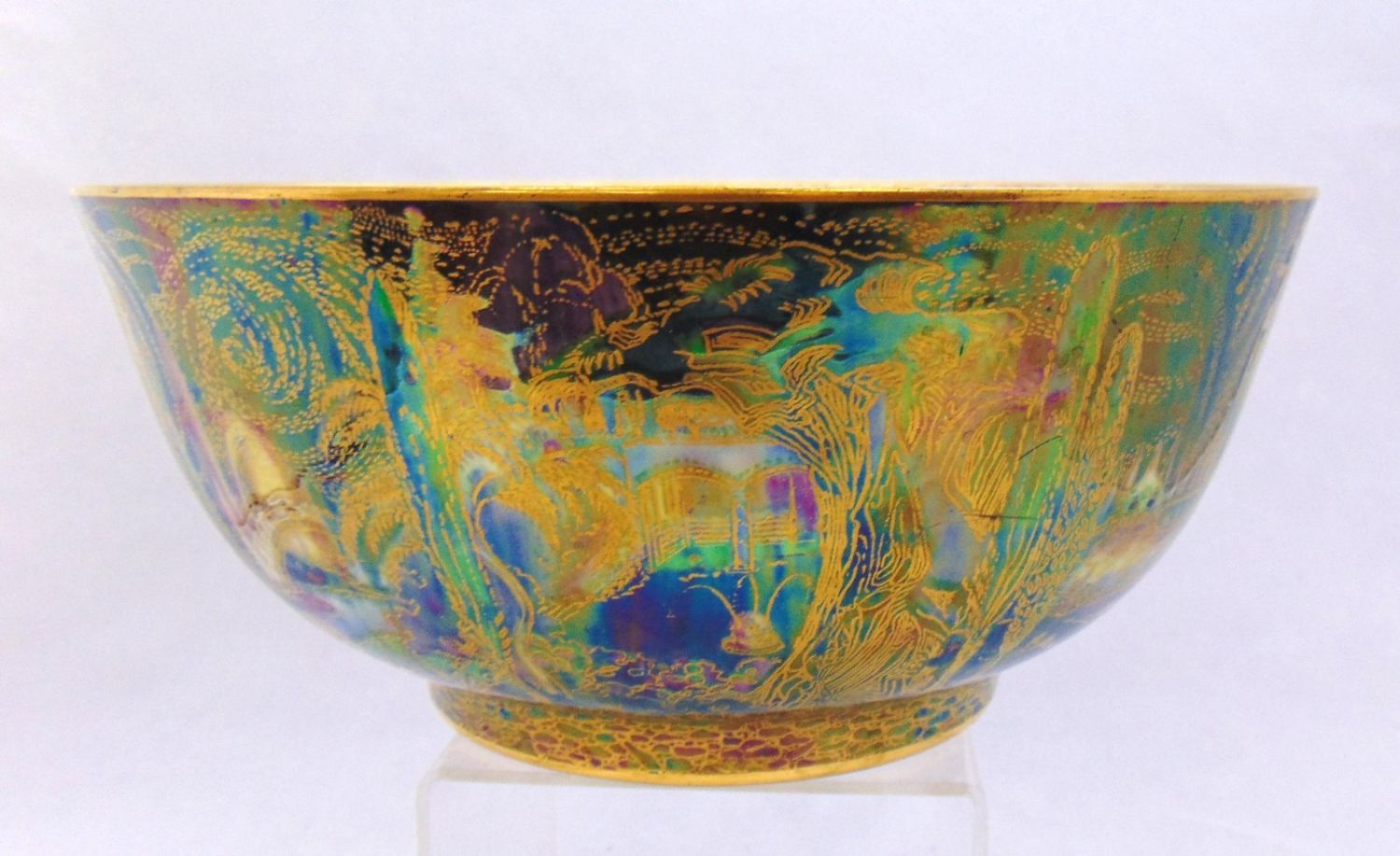 Footed bowl in blue with a turquoise interior, exterior decorated with Cyprus trees, bridges, and building, interior with ladies, gnomes and fairies, marked Wedgwood 9" wide by 4 1/2′ ht. Condition: good with no defects found.