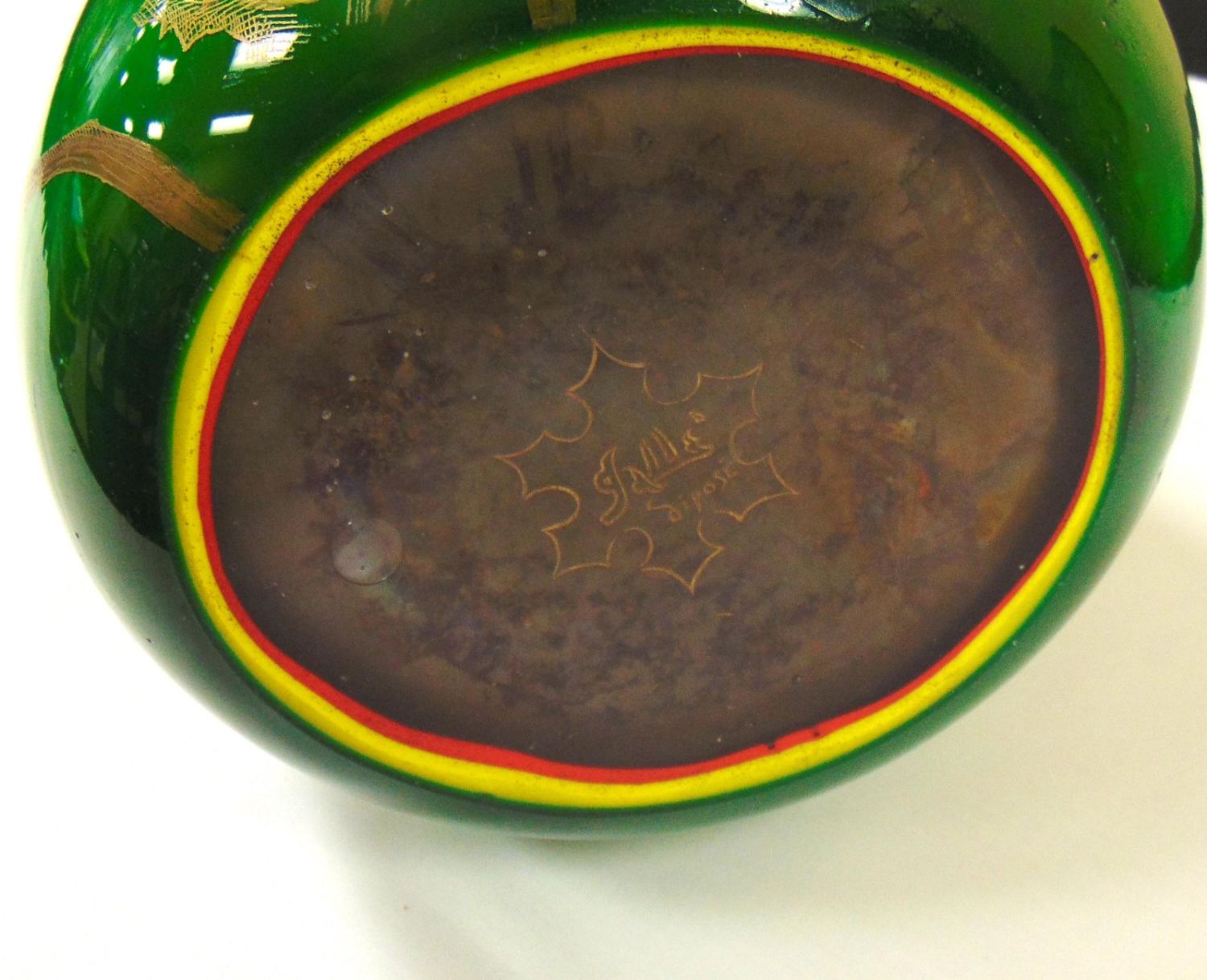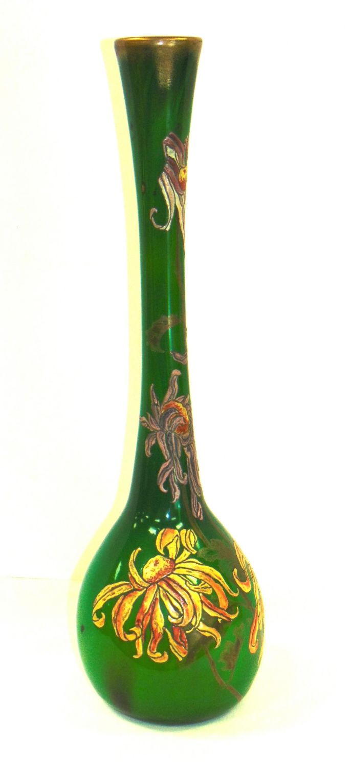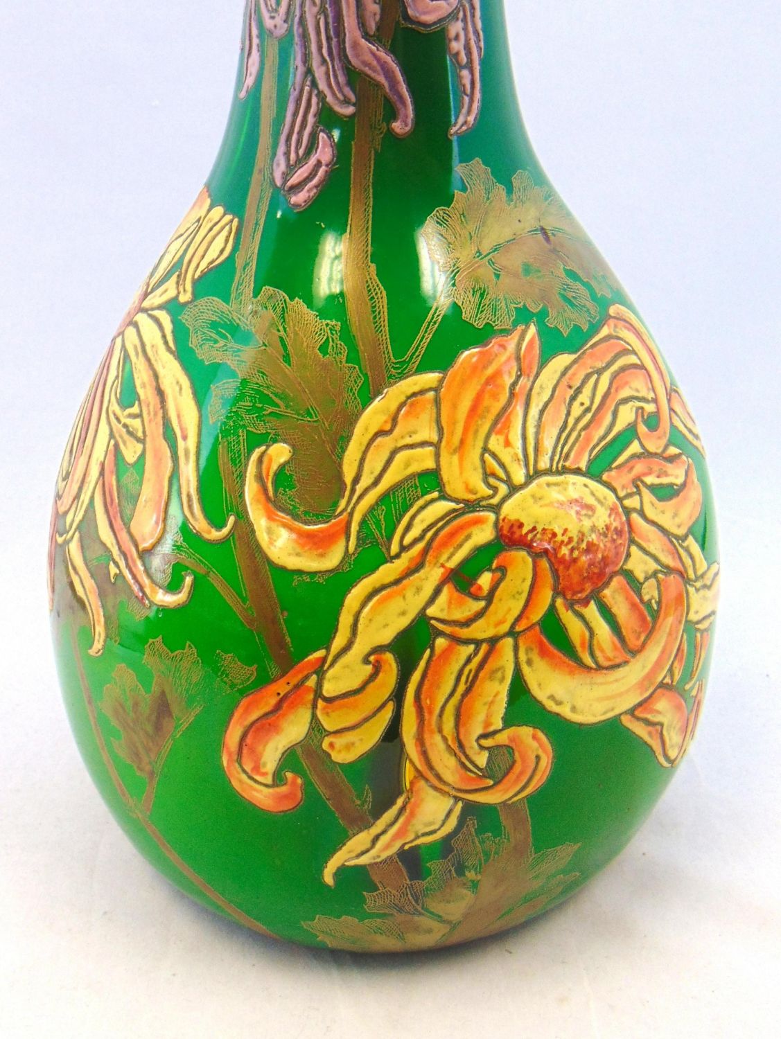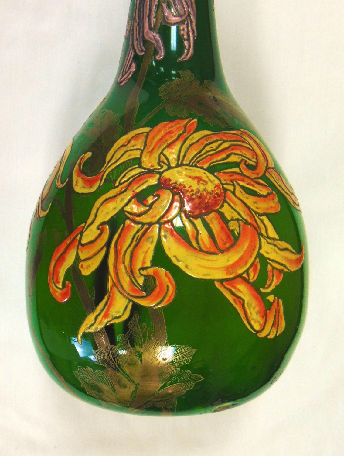 Bulbous stick form Galle glass vase in cased green glass decorated with heavy enameled purple and gold flowers on gilt leafy stems, etched signed Galle depose, 26" ht. Condition: good with some rubbings, see picture.