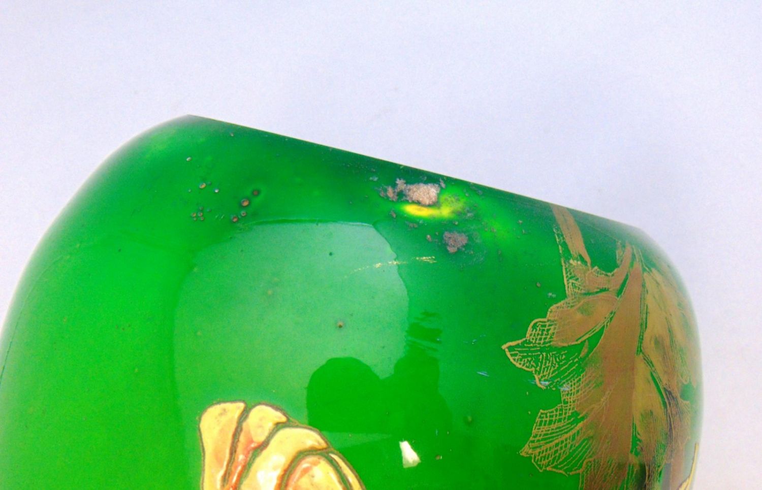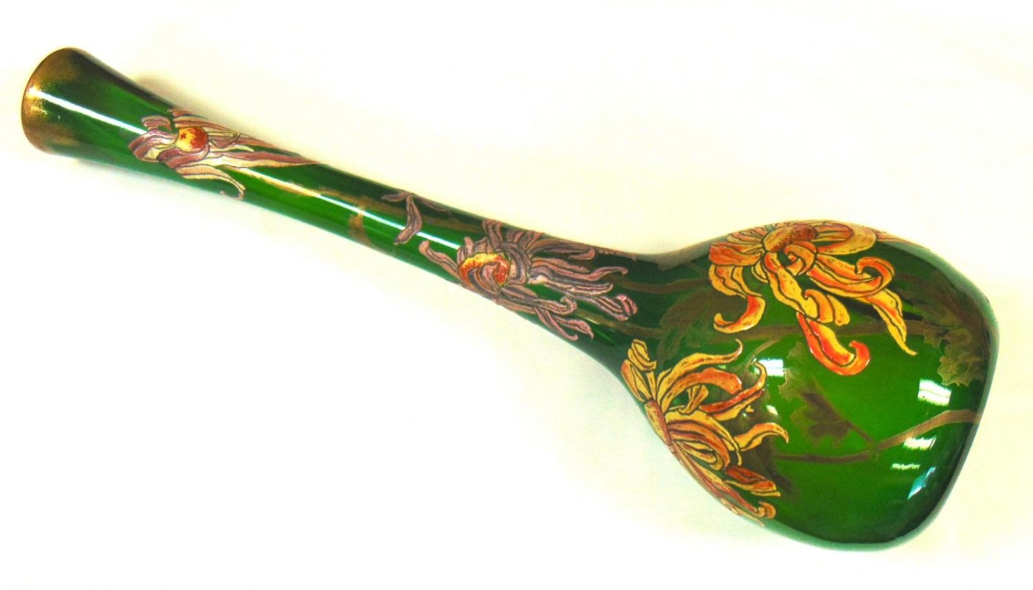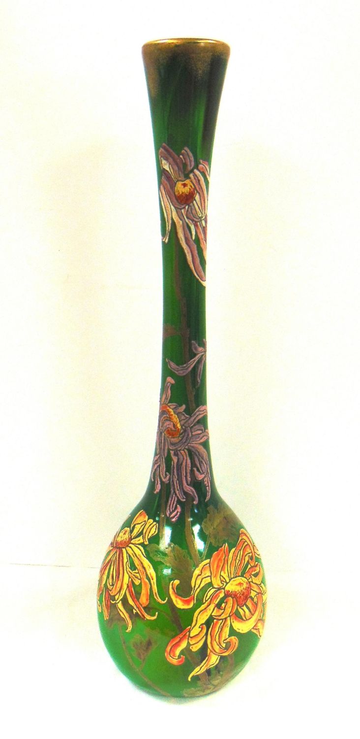 Bulbous stick form Galle glass vase in cased green glass decorated with heavy enameled purple and gold flowers on gilt leafy stems, etched signed Galle depose, 26" ht. Condition: good with some rubbings, see picture.