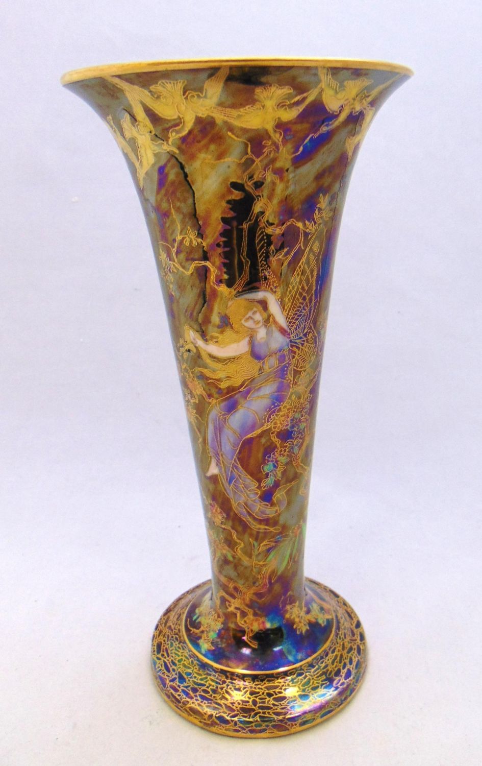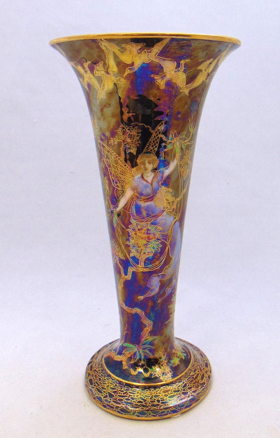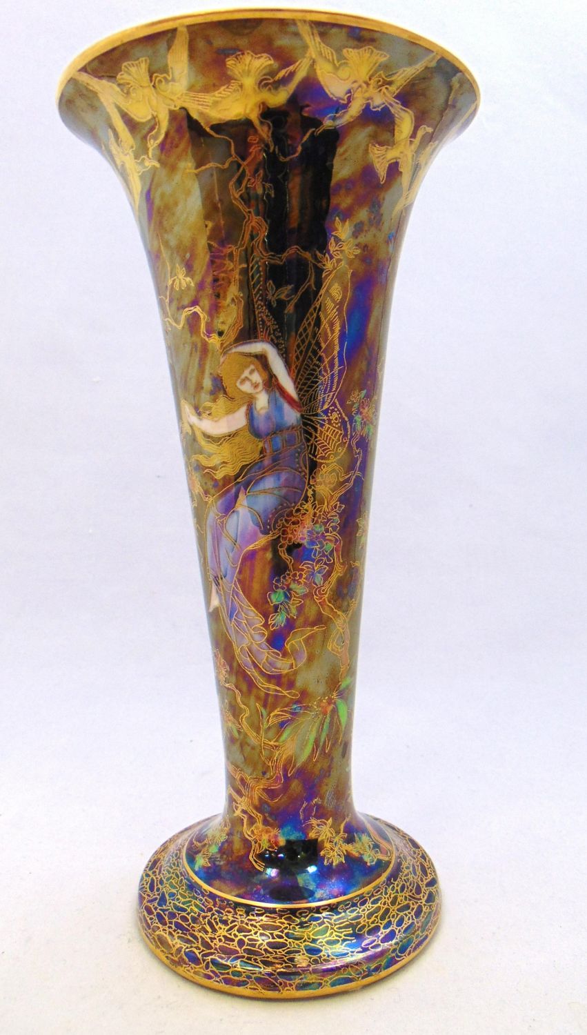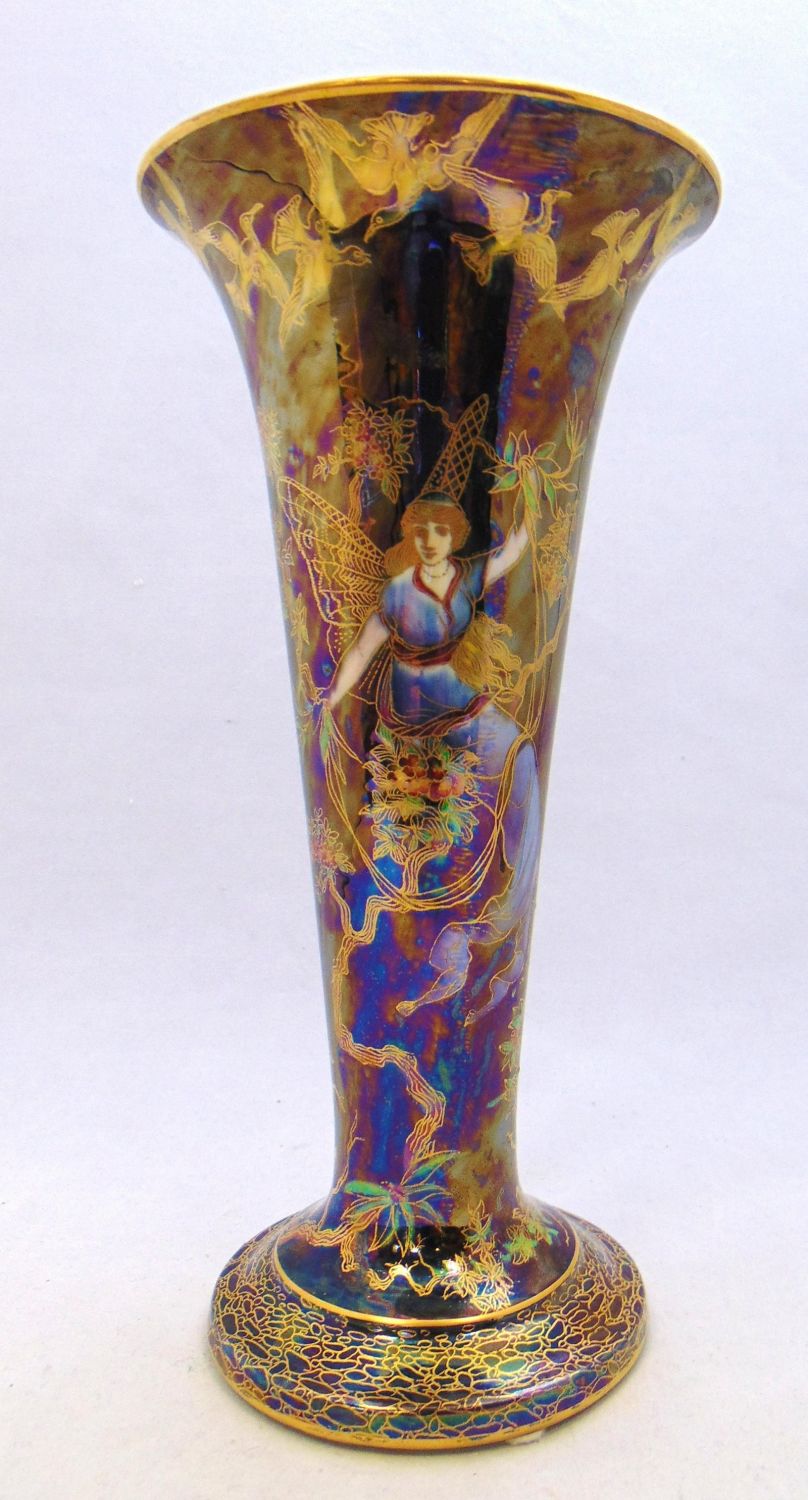 Footed trumpet form in blue porcelain decorated with female ferries in blue gowns on front and back, marked Wedgwood, 9 1/4" ht. Condition: good with no defects found.