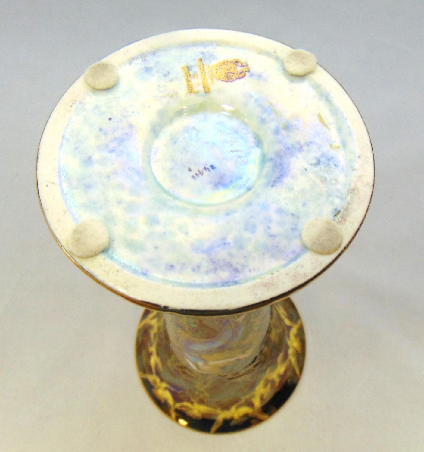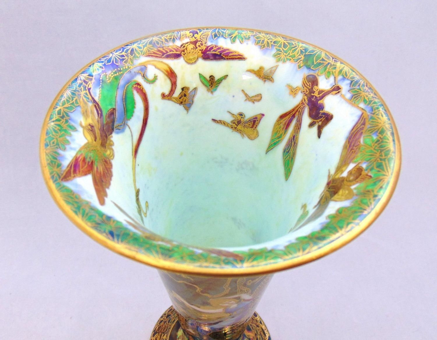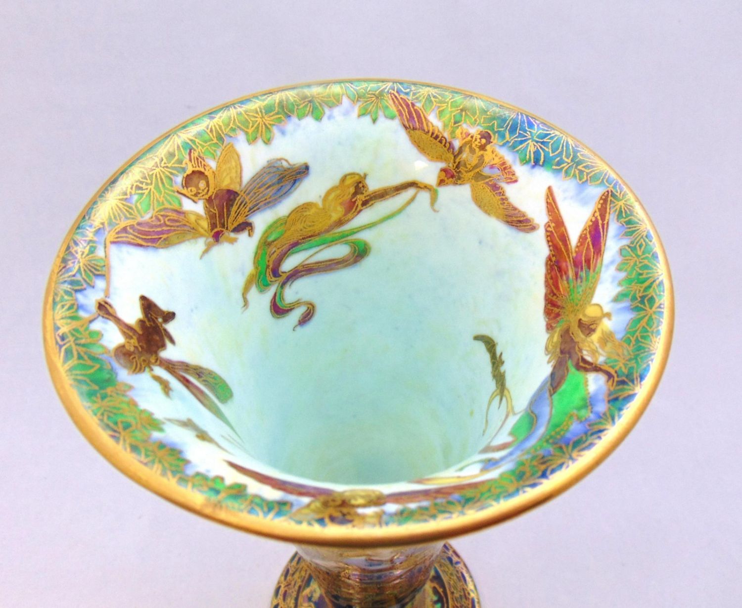 Footed trumpet form in blue porcelain decorated with female ferries in blue gowns on front and back, marked Wedgwood, 9 1/4" ht. Condition: good with no defects found.