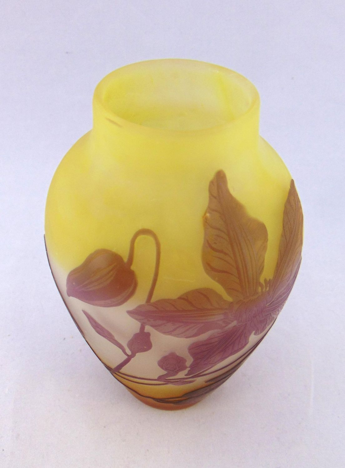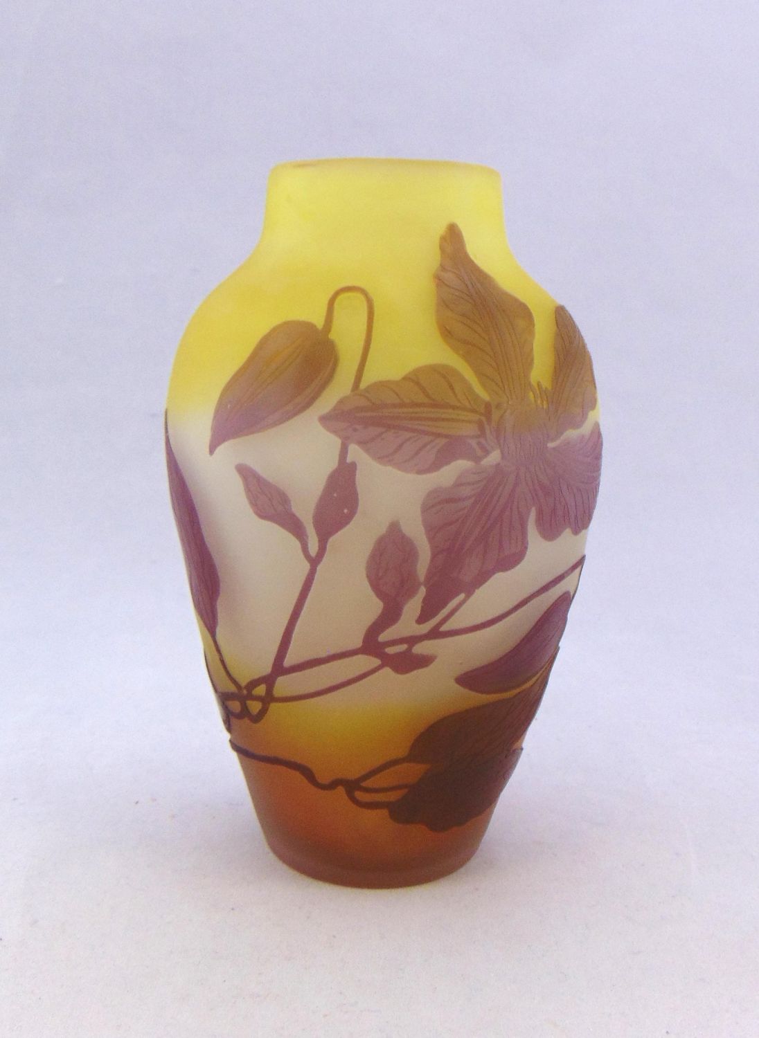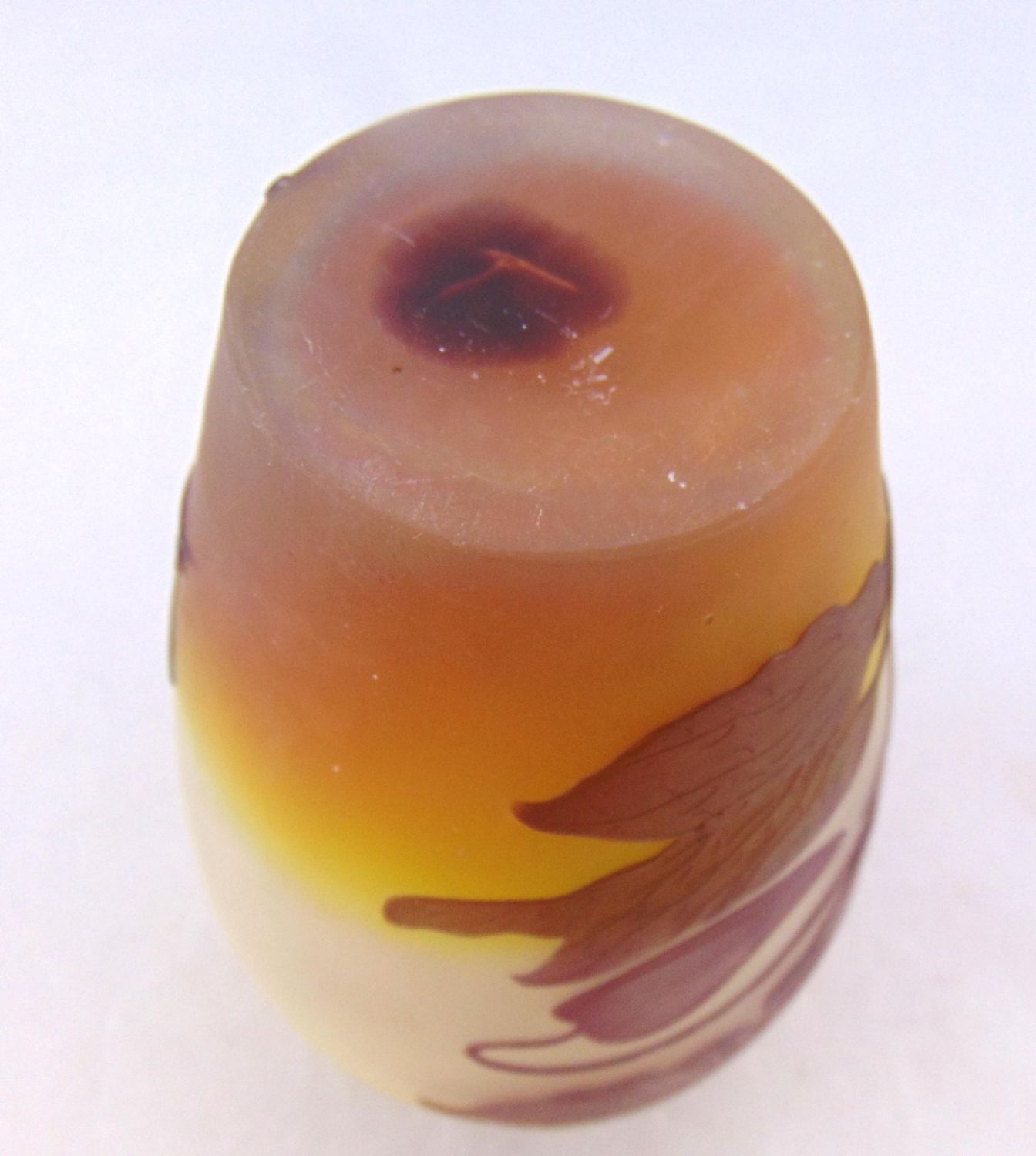Ovoid form in amber glass decorated with a purple random leafy vine signed in cameo Galle, 6" ht. Condition: one minor chip to the dŽcor, see picture.