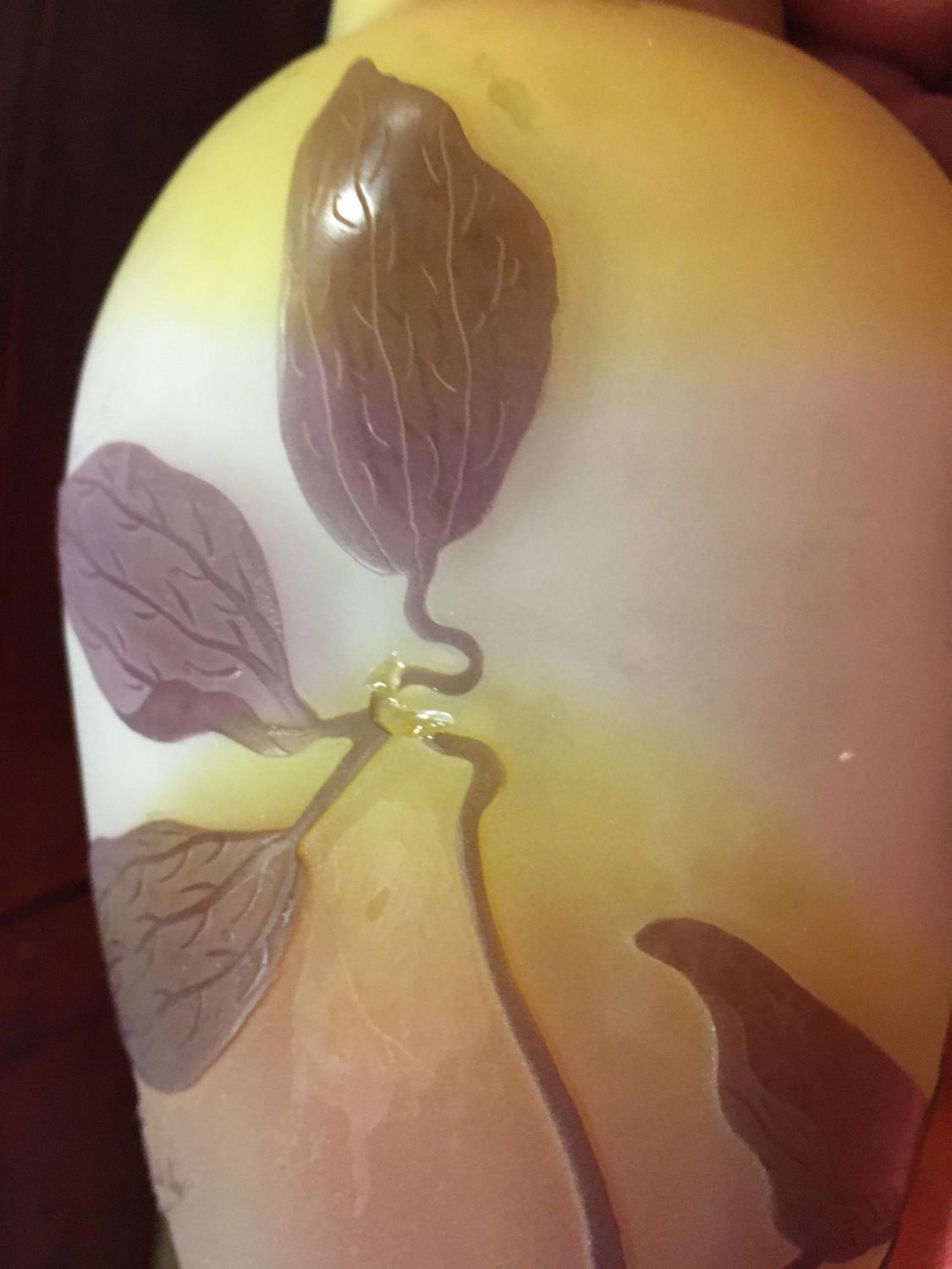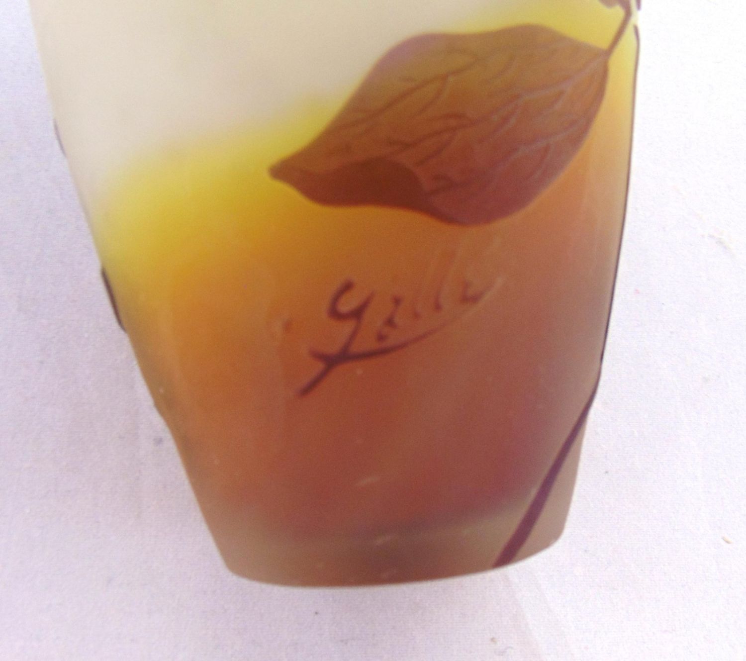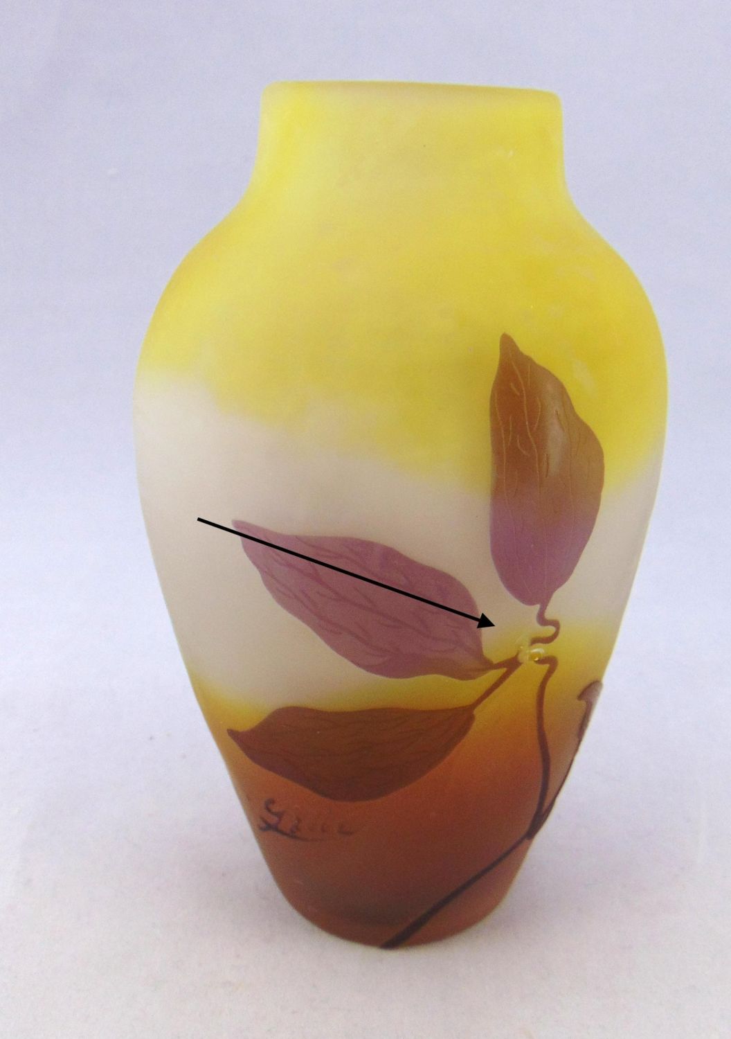 Ovoid form in amber glass decorated with a purple random leafy vine signed in cameo Galle, 6" ht. Condition: one minor chip to the dŽcor, see picture.