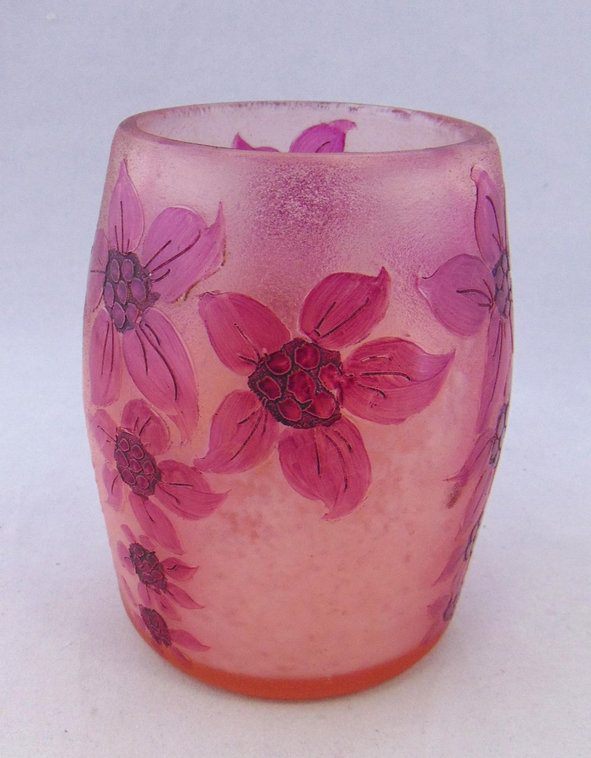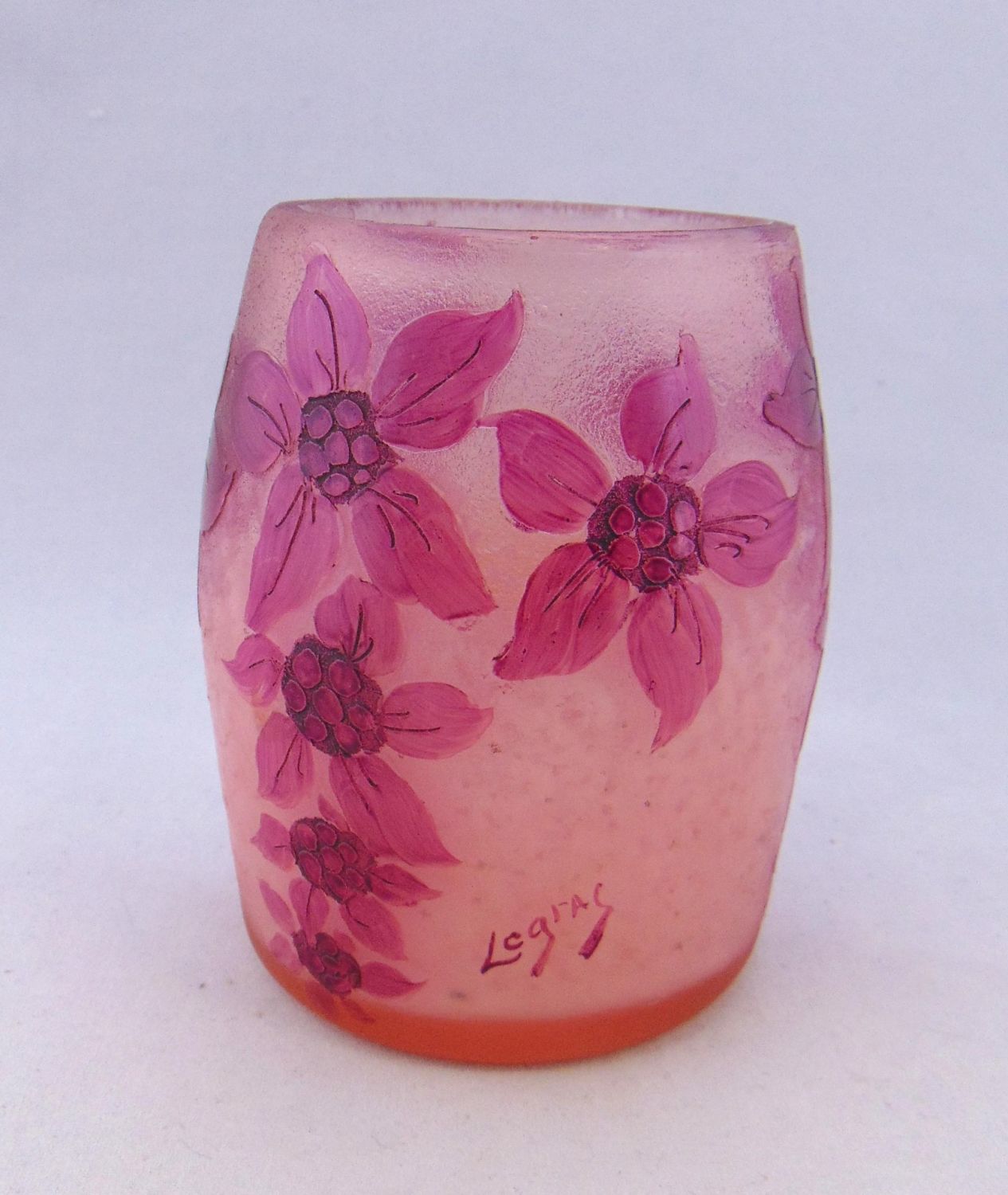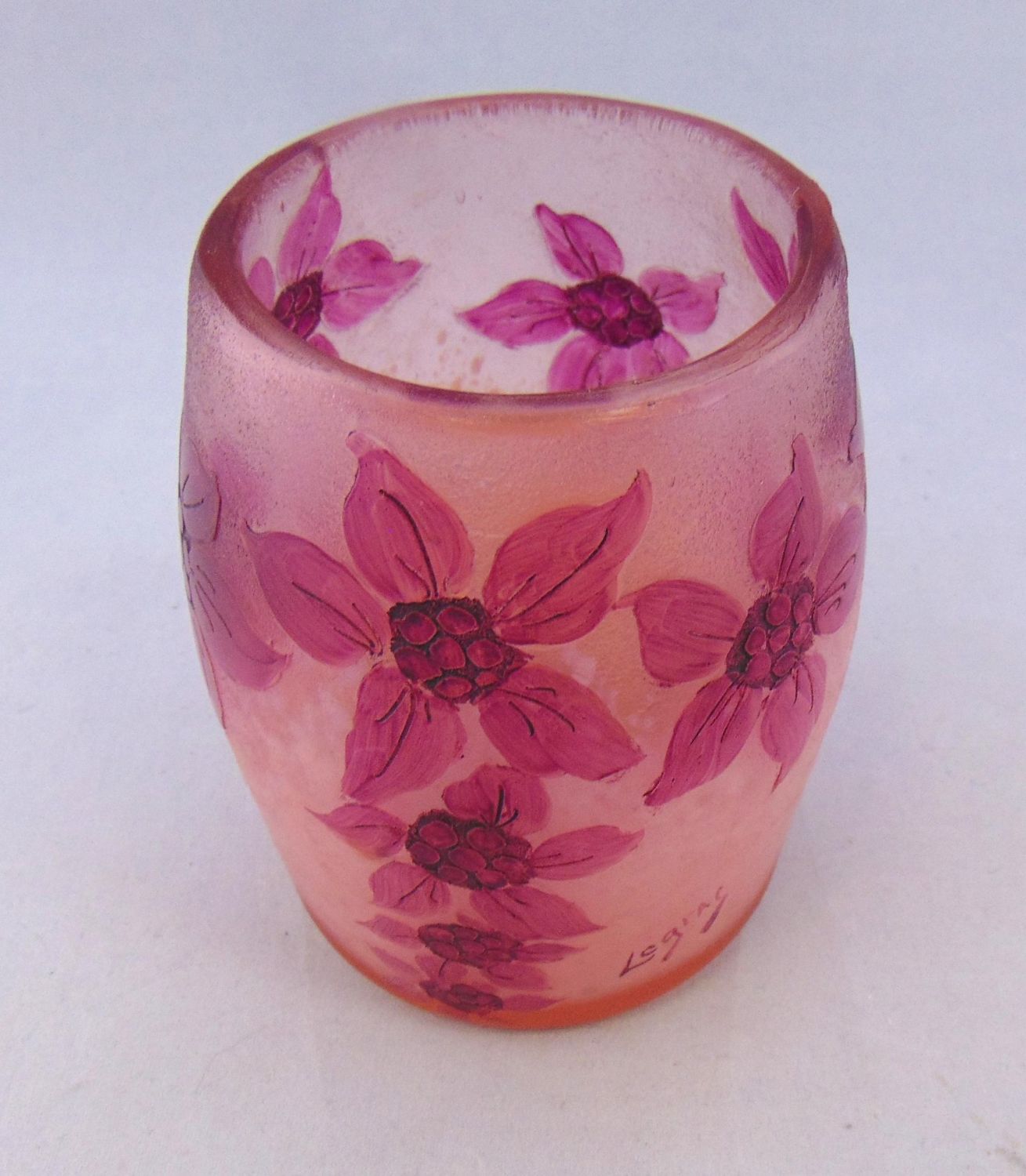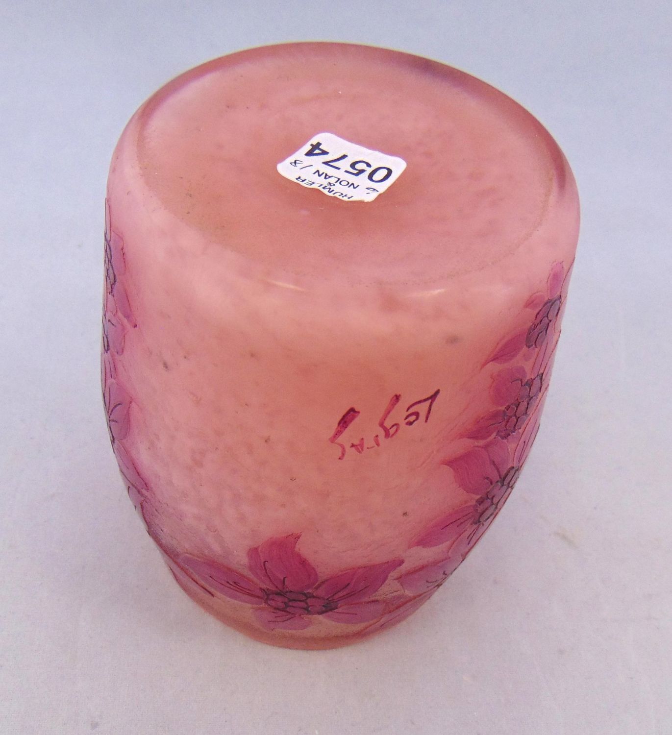 Large tumbler form in frosted glass decorated with three groupings of purple flowers, signed in cameo Legras 4 1/2′ ht. PROVENANCE: Humler Nolan. Condition: good with no defects found.